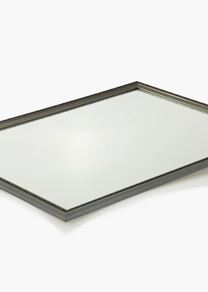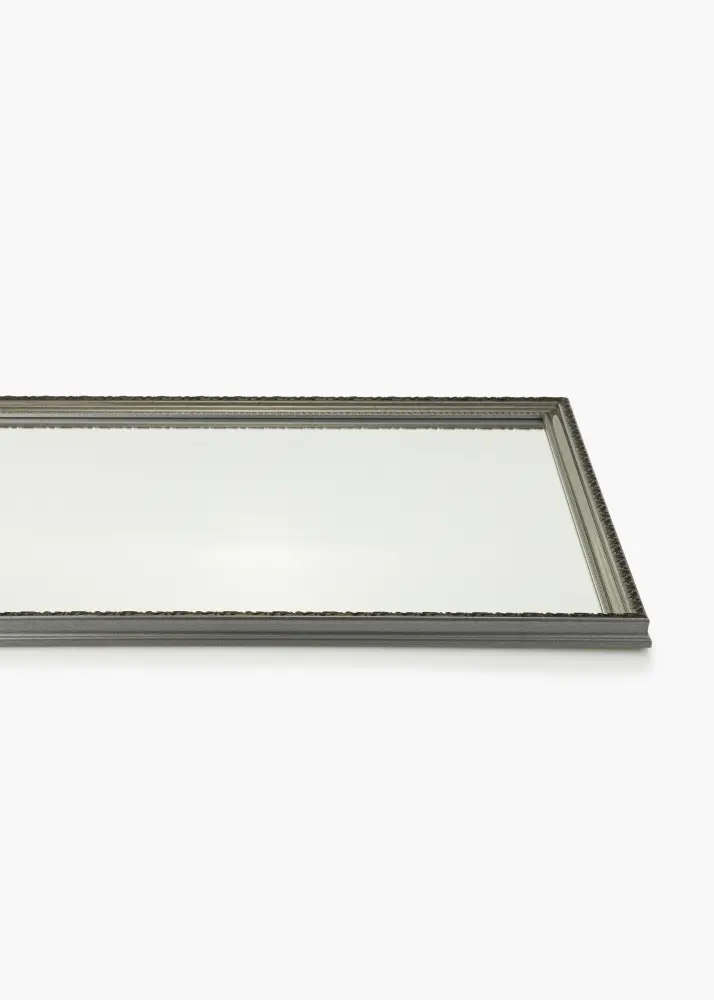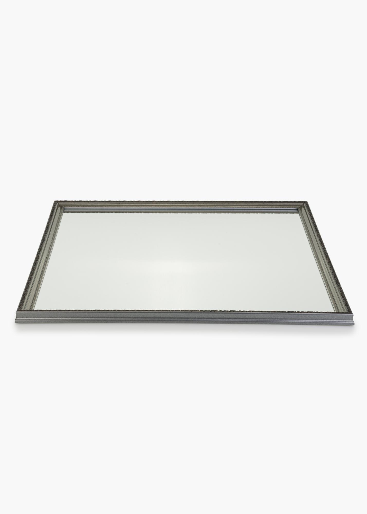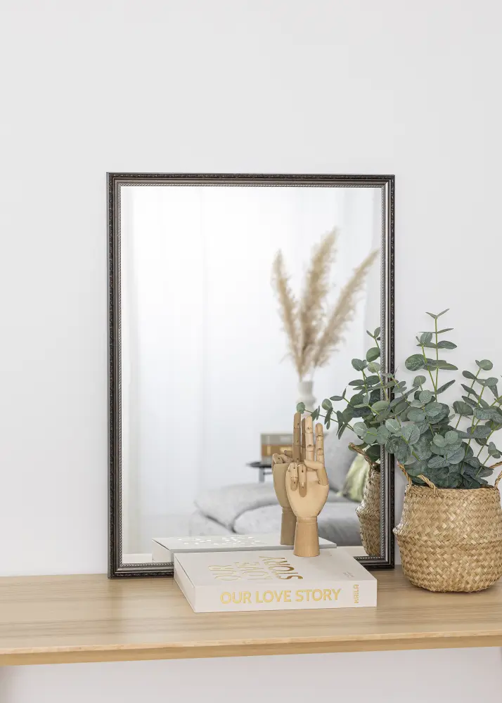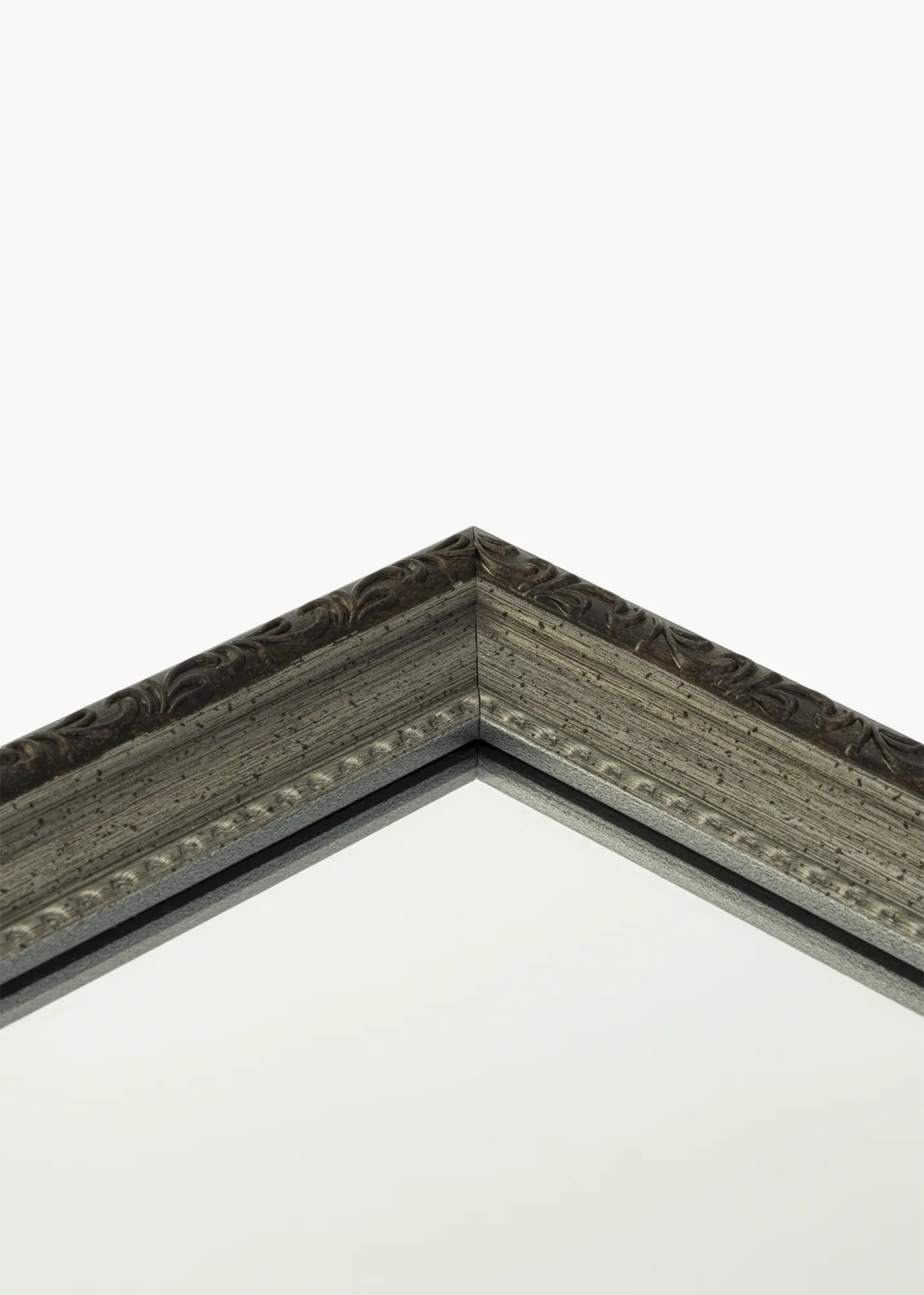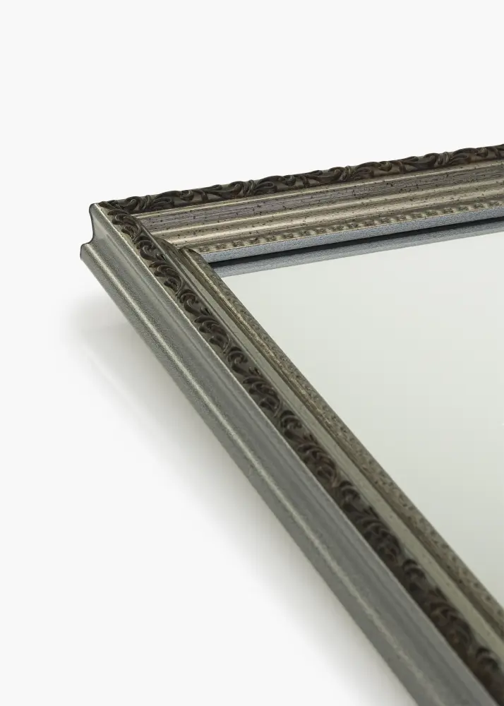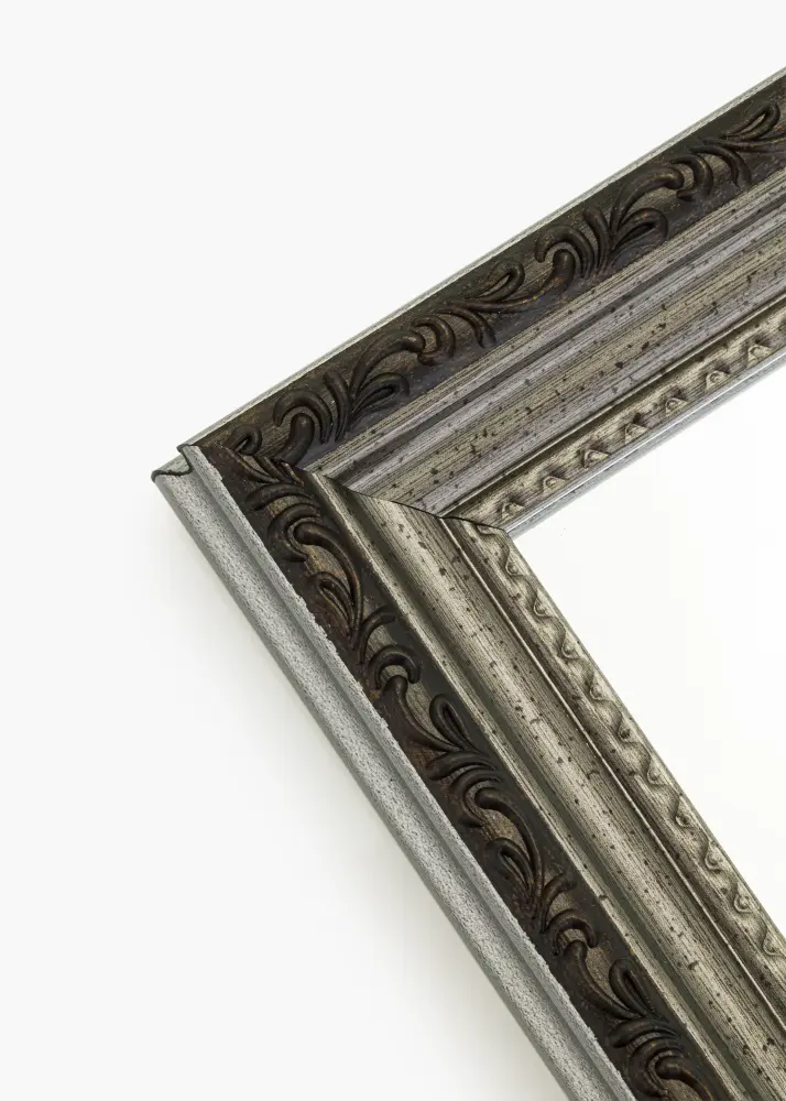 Ovo je zidno ogledalo u elegantnoj srebrnoj nijansi naglaÅ¡eno crnim rubom. Elegantna boja ogledala savrÅ¡eno se kombinira s ornamentiranim profilom, Äiji uzorak pomaže stvoriti vrlo sofisticiranu cjelinu. Okvir je Å¡irok 25 mm i izraÄen je od kompozita.