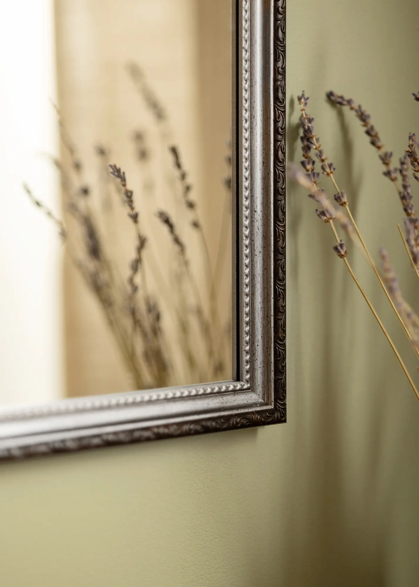 Ovo je zidno ogledalo u elegantnoj srebrnoj nijansi koja je naglaÅ¡ena crnim rubom. Ogledalo kombinira elegantnu nijansu boje s ornamentalnim profilom Äiji uzorak pomaže stvoriti vrlo sofisticiranu cjelinu. Okvir je Å¡irok 25 mm i izraÄen je od kompozita.
