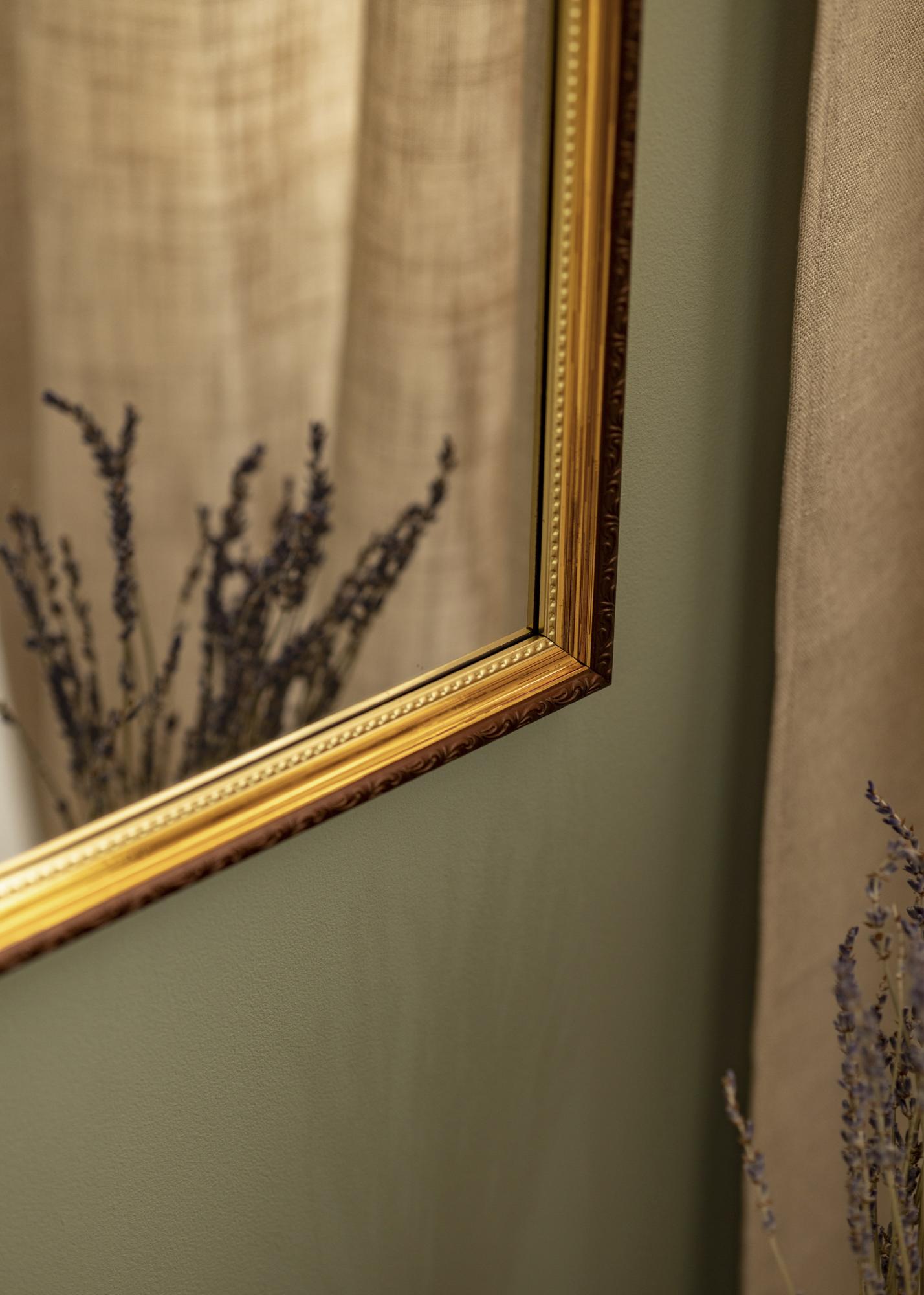 Abisko Gold je zidno ogledalo za one koji traže dekorativno ogledalo s elegantnim retro inspiriranim izgledom. Ogledalo ima okvir širine od 25 mm s smeđim nijansama i ekskluzivnom zlatnom bojom najbliže staklu ogledala. Okvir ima prekrasan ornamentirani profil, što čini zidno ogledalo vrlo elegantnim zidnim ukrasom koji dobro pristaje u hodnik kao i u spavaću sobu.