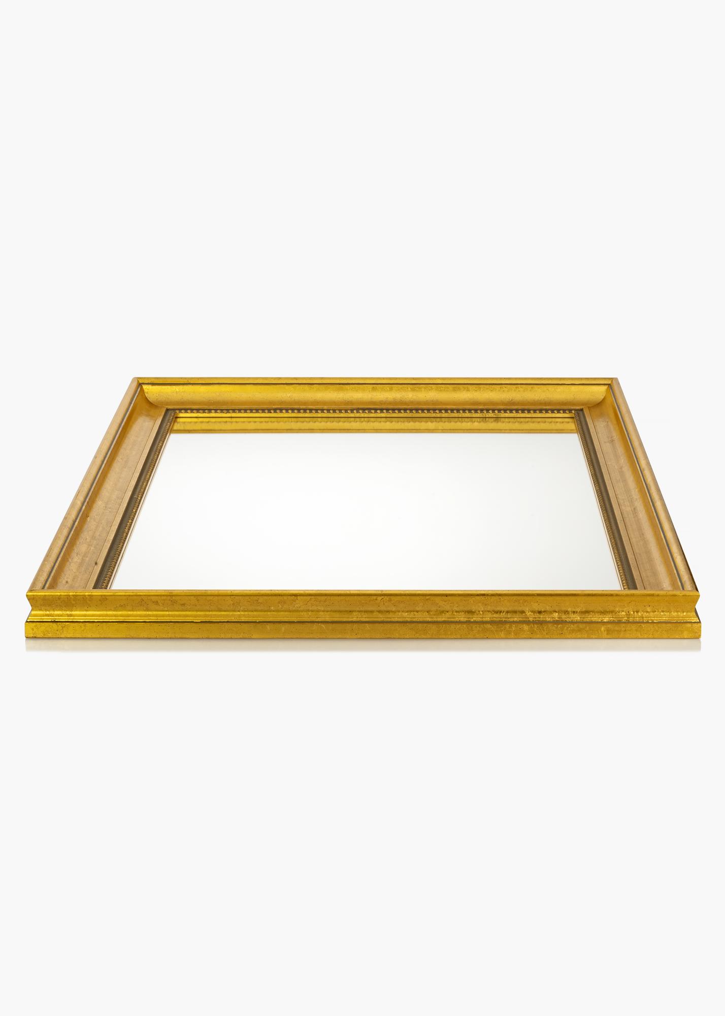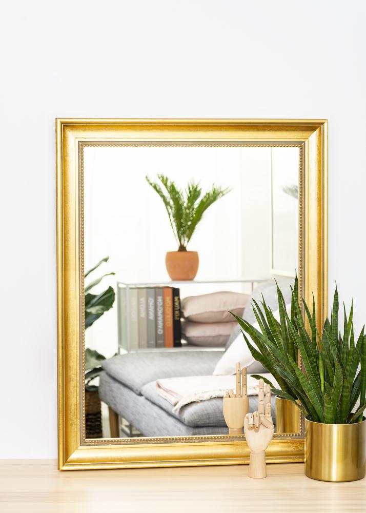 Nabavite elegantno ogledalo i učinite interijer hodnika, dnevnog boravka ili kupaonice dodatno luksuznim. Ovo stilizirano ogledalo dolazi u nekoliko različitih veličina tako da lako pronađete ono koje odgovara vašim potrebama. Okvir ogledala ima klasičan dizajn sa širokim okvirom i diskretnim uzorkom bisera uz staklo. Drvo dolazi iz održivog šumarstva i obojano je u prekrasnu zlatnu nijansu.