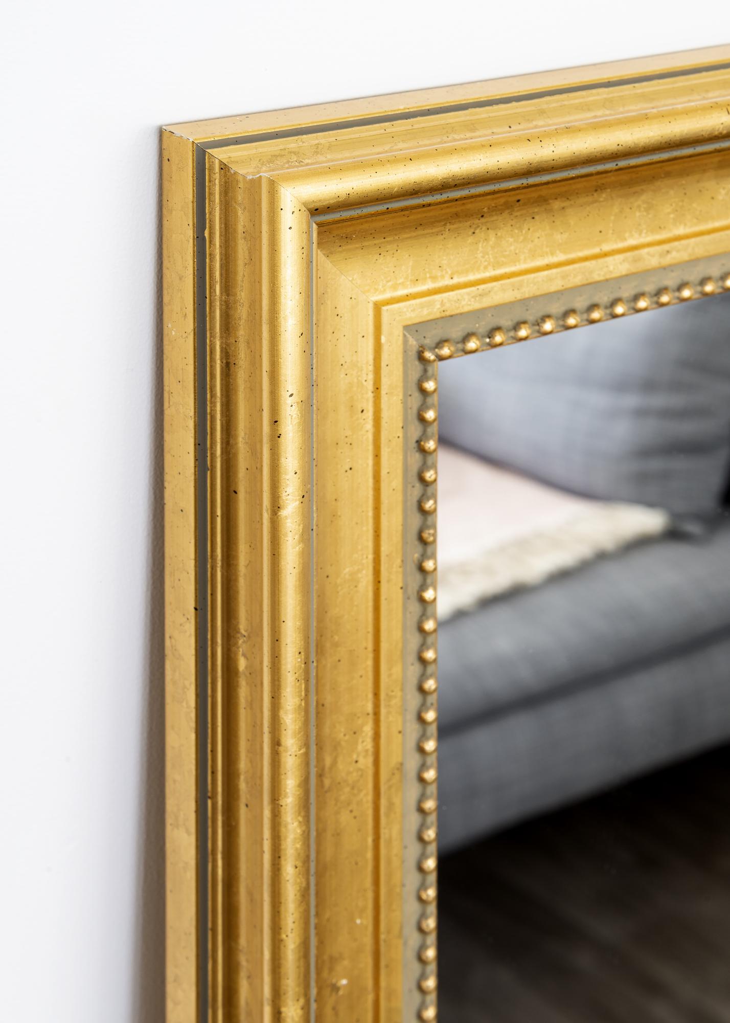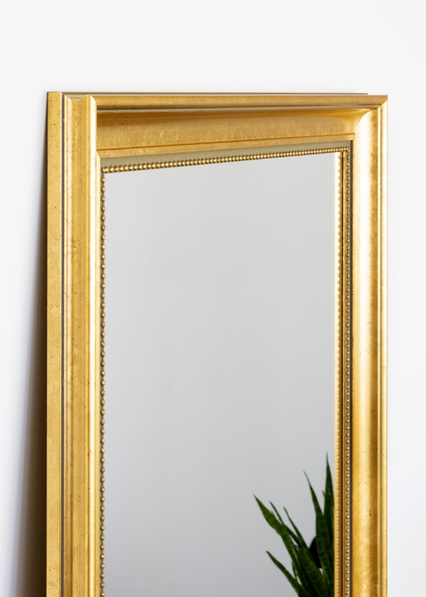 Nabavite elegantno ogledalo i učinite interijer hodnika, dnevnog boravka ili kupaonice dodatno luksuznim. Ovo stilsko ogledalo dostupno je u nekoliko različitih veličina pa lako možete pronaći ono koje odgovara vašoj namjeni. Okvir ogledala ima klasičan dizajn sa širokim okvirom i diskretnim uzorkom perla najbližim staklu. Drvo dolazi iz održivog šumarstva i obojano je u prekrasnu zlatnu nijansu.