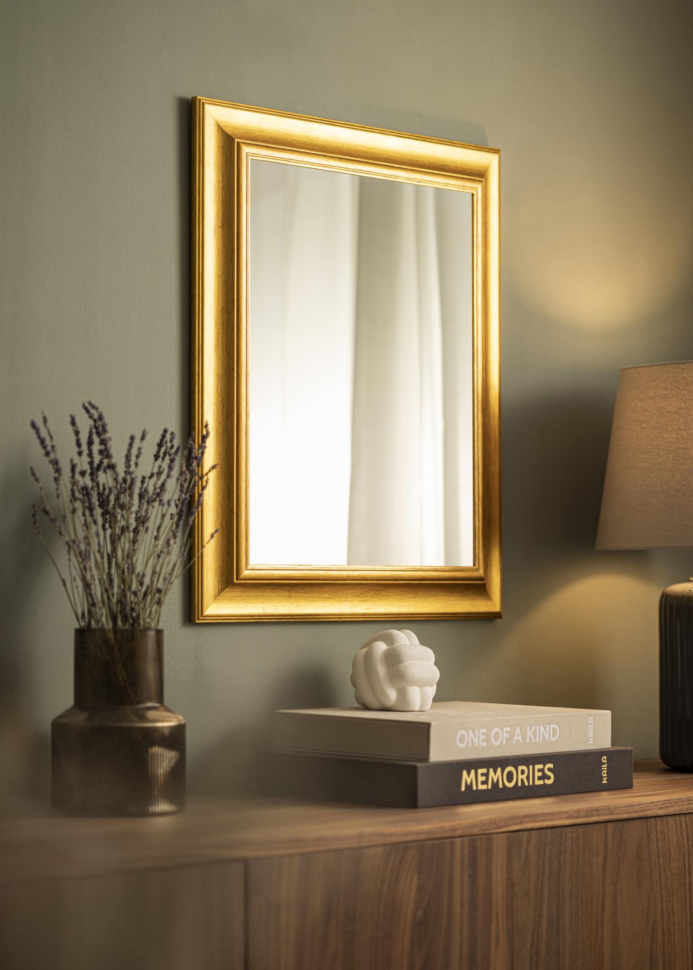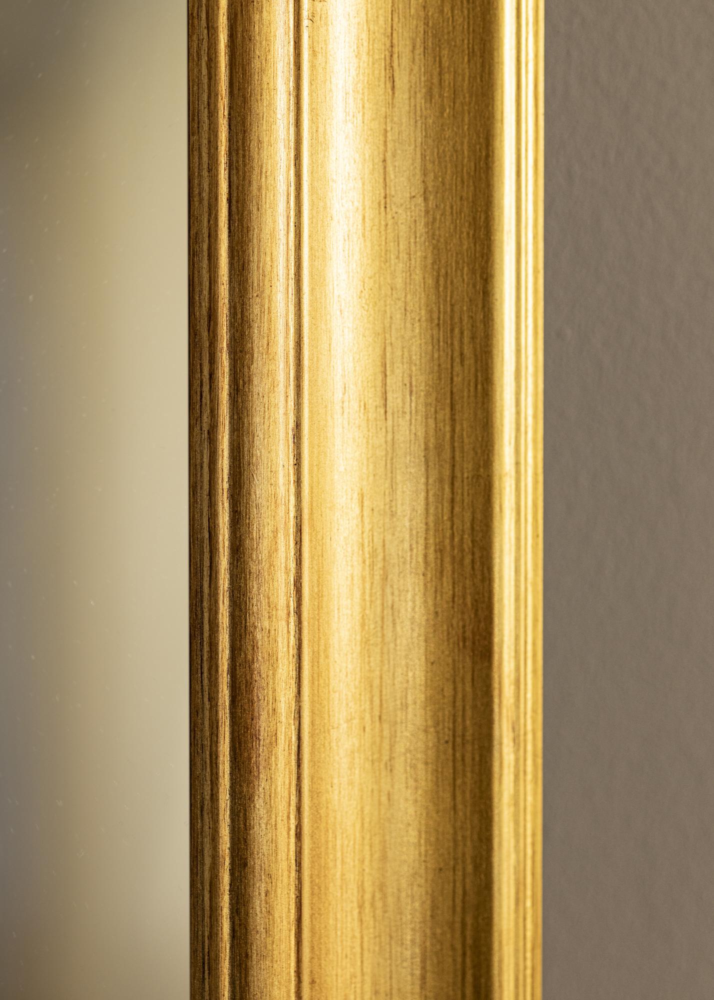 Okvir je izrađen od bora i ima prekrasnu antik zlatnu završnu obradu. Brušena površina sa suptilnim nijansama daje zrcalu blago patinirani izgled, što doprinosi njegovom jedinstvenom karakteru. Tanke linije uz rubove stvaraju sofisticiranu mnoštvenost detalja koja privlači pažnju i pojačava klasičan izraz zrcala.