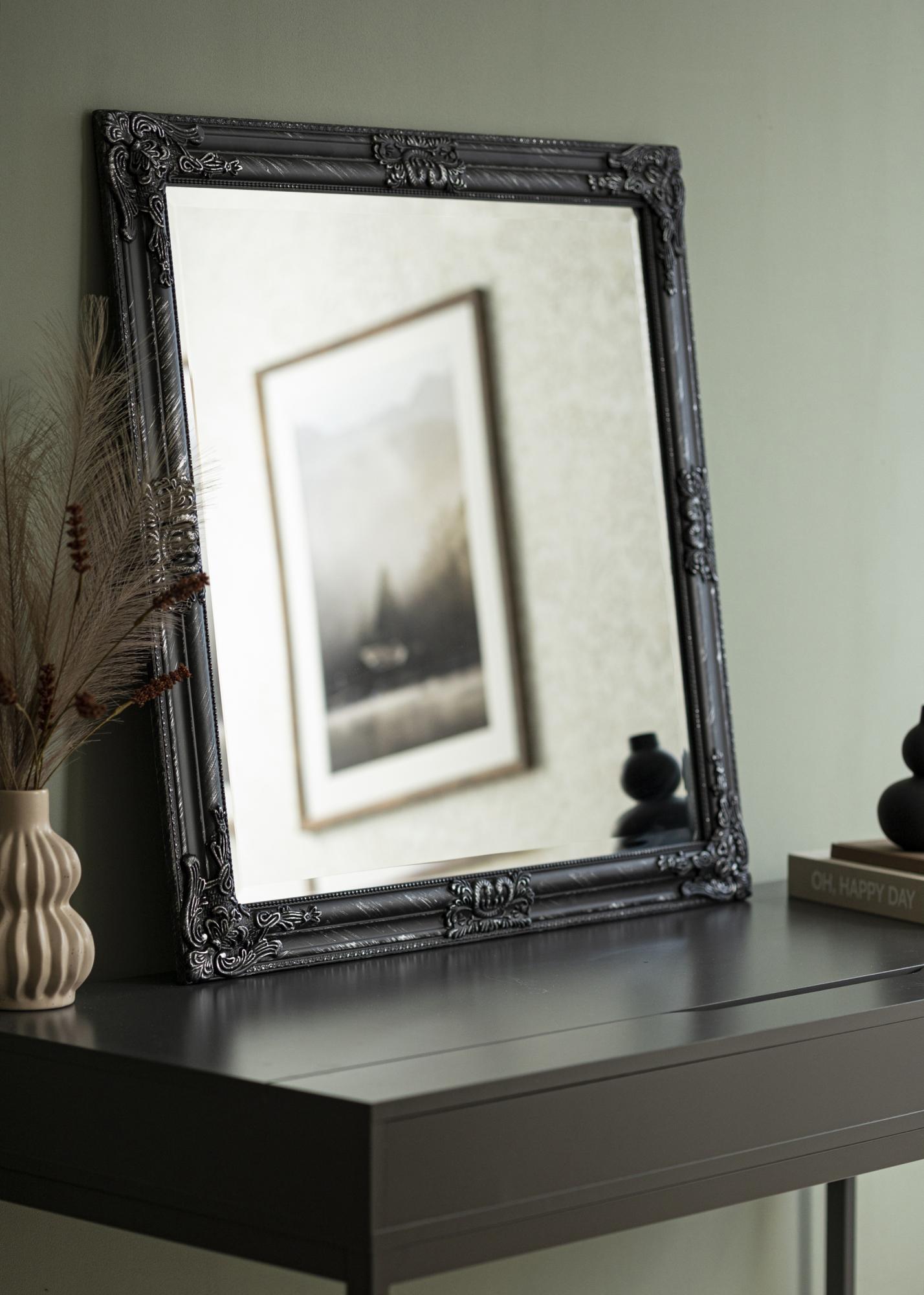 Ovo ogledalo istiÄe se kvadratnim oblikom koji stvara strukturu i red u prostoriji, okruženo tamnim, detaljnim okvirom koji pruža izražajan i profinjen stil. Crni okvir je ukraÅ¡en finim detaljima koji podsjeÄaju na raskoÅ¡nu estetiku baroka, Å¡to daje luksuzan i dramatiÄan dodir vaÅ¡em ureÄenju interijera.