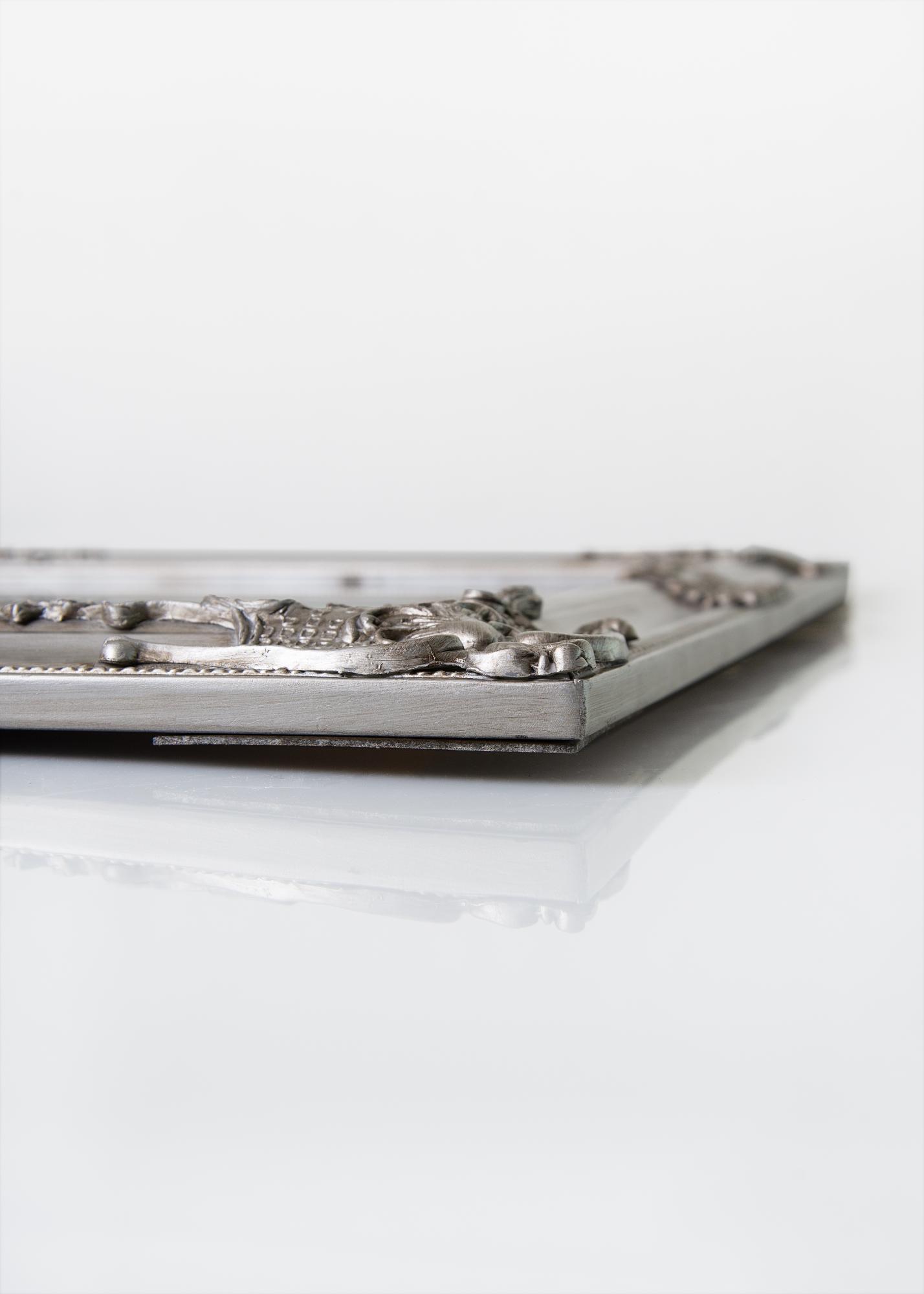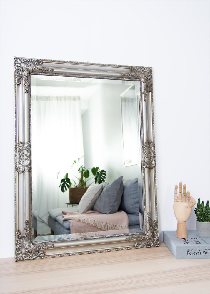 Serija zrcala Bologna Srebro ima latinski dizajn s obilnom dekoracijom u kutovima i na središnjim točkama stranica okvira. Malo uži okvir nego mnogo drugih zrcala u ovom stilu. Okvir je izrađen od drveta, a dekor je uliven u gips prije nego što je apliciran na okvir.