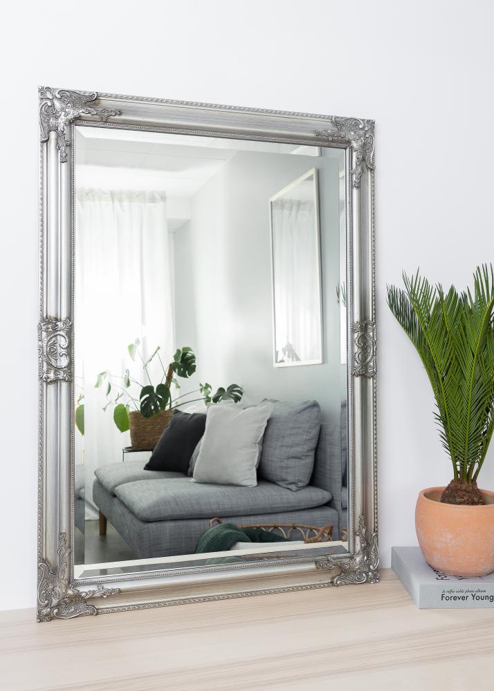 Serija zrcala Bologna Silver ima latinski dizajn s obilnom dekoracijom u kutovima i na sredini bočnih stranica okvira. Malo uži okvir od mnogih drugih zrcala u ovom stilu. Okvir je izrađen od drveta, a dekor je lijevan u gipsu prije nego što je nanesen na okvir.