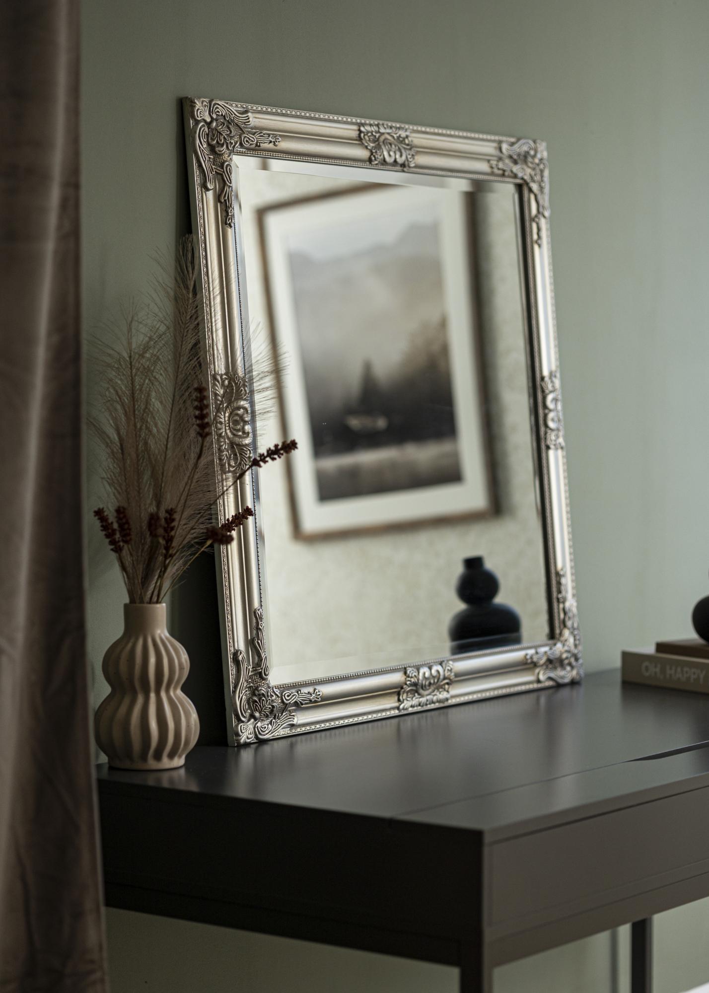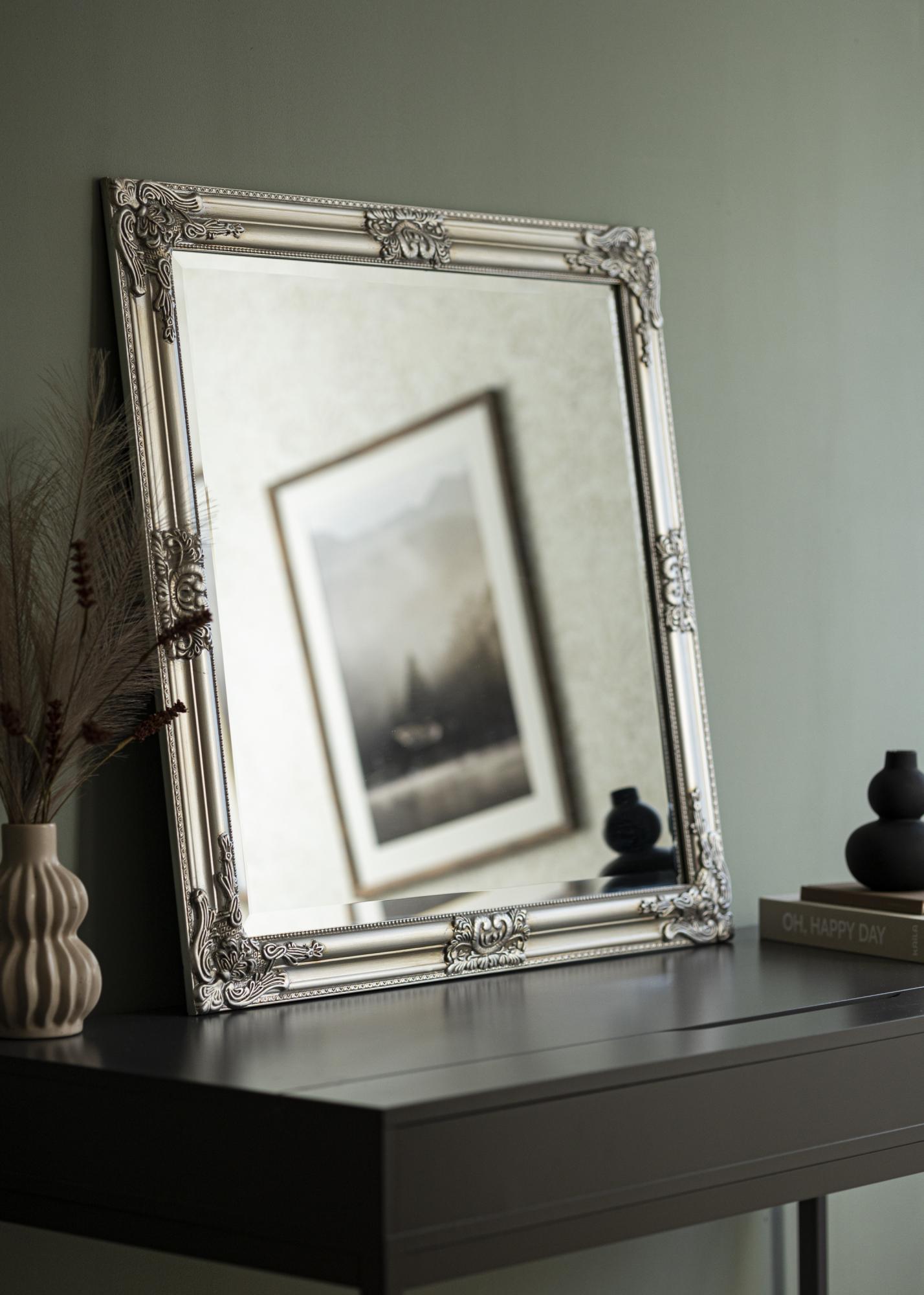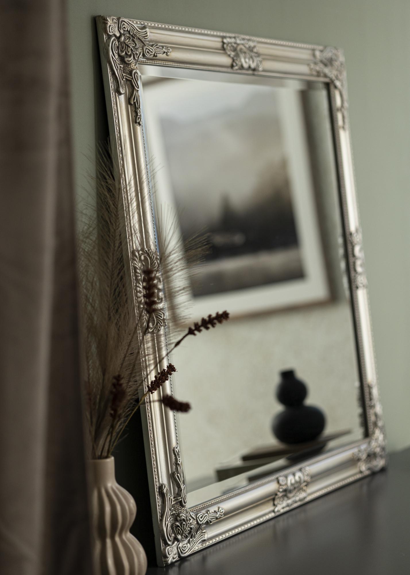 Okvir ovog ogledala pravi je privlaÄitelj pogleda, bogat detaljnim ornamentima u baroknom stilu koji dodaju luksuzan i povijesni osjeÄaj prostoru. Kvadratni oblik pruža simetriÄnu i uravnoteženu estetiku koja nadopunjuje veÄinu stilova ureÄenja. Srebrna boja okvira ogledala pojaÄava njegov elegantan izraz i Äini ga svestranim elementom u domu.