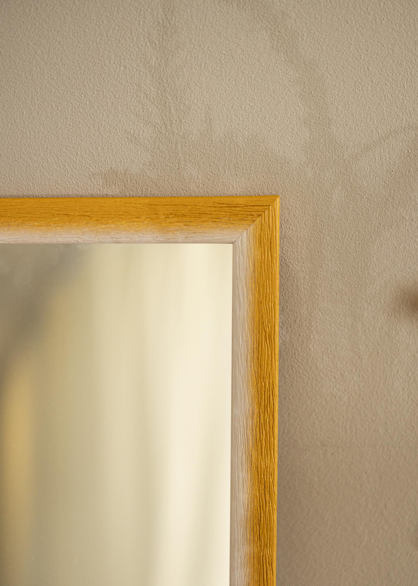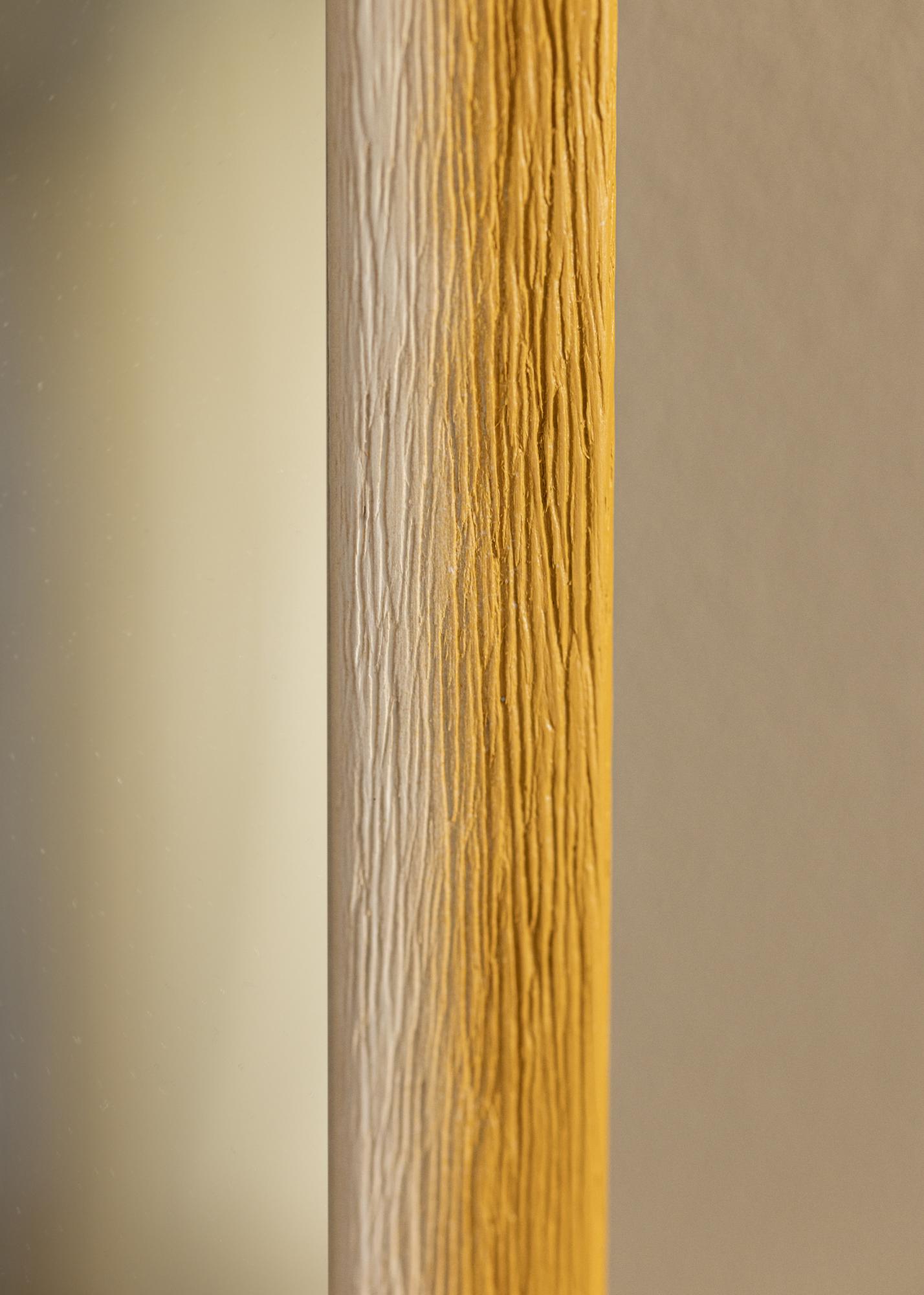 Ovo zrcalo izdvaja se svojom harmoničnom prelazom boja, od svijetle, prirodne bijele do tople oker žute nijanse. Taj suptilni prijelaz stvara nježni, obojeni izraz koji daje prostoriji živu dubinu. Površina okvira obilježena je jasnom strukturom drveta s dubokim godovima, što pruža taktilni i prirodni osjećaj. To čini da zrcalo nije samo funkcionalno nego i dekorativni detalj u vašem domu.