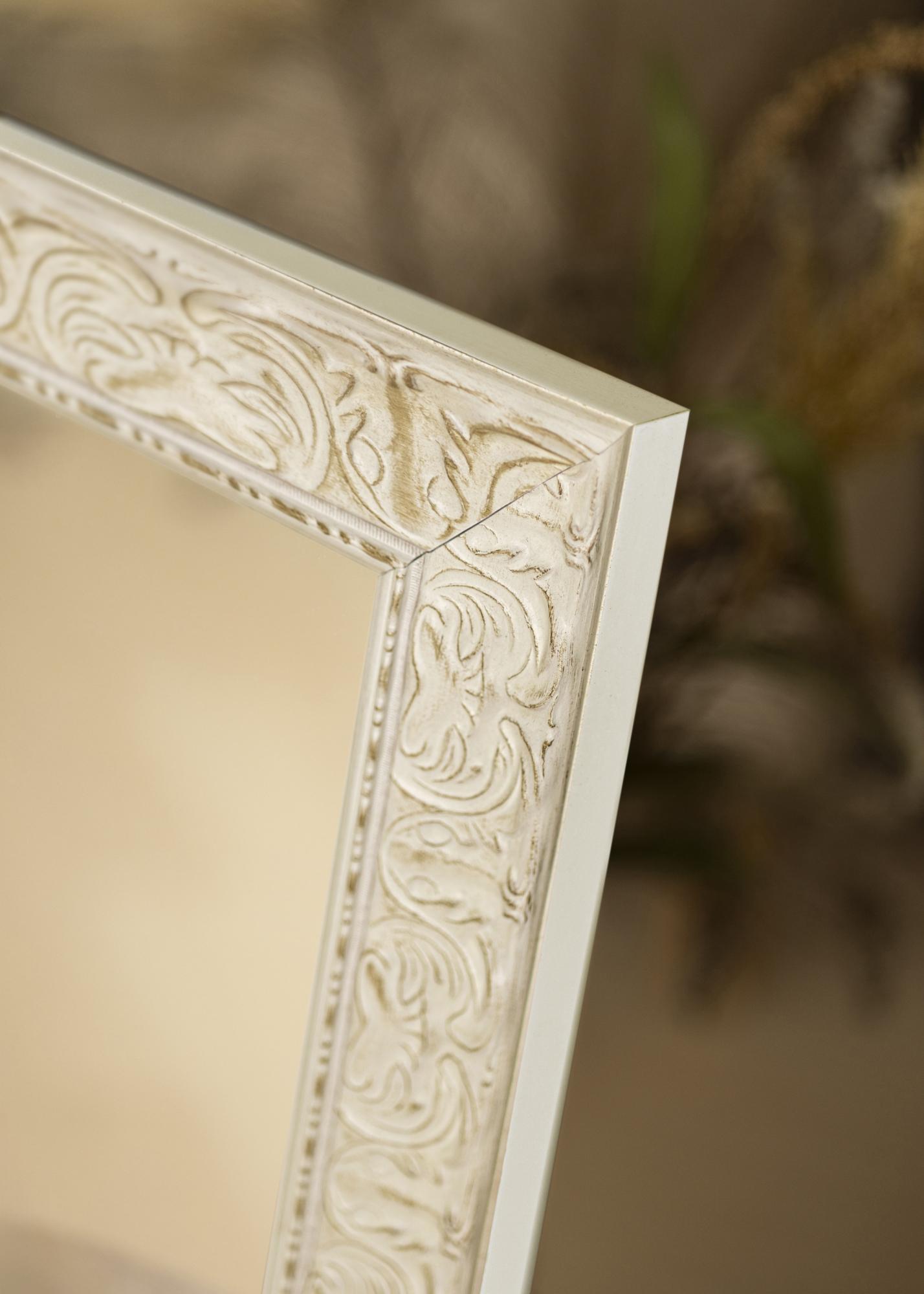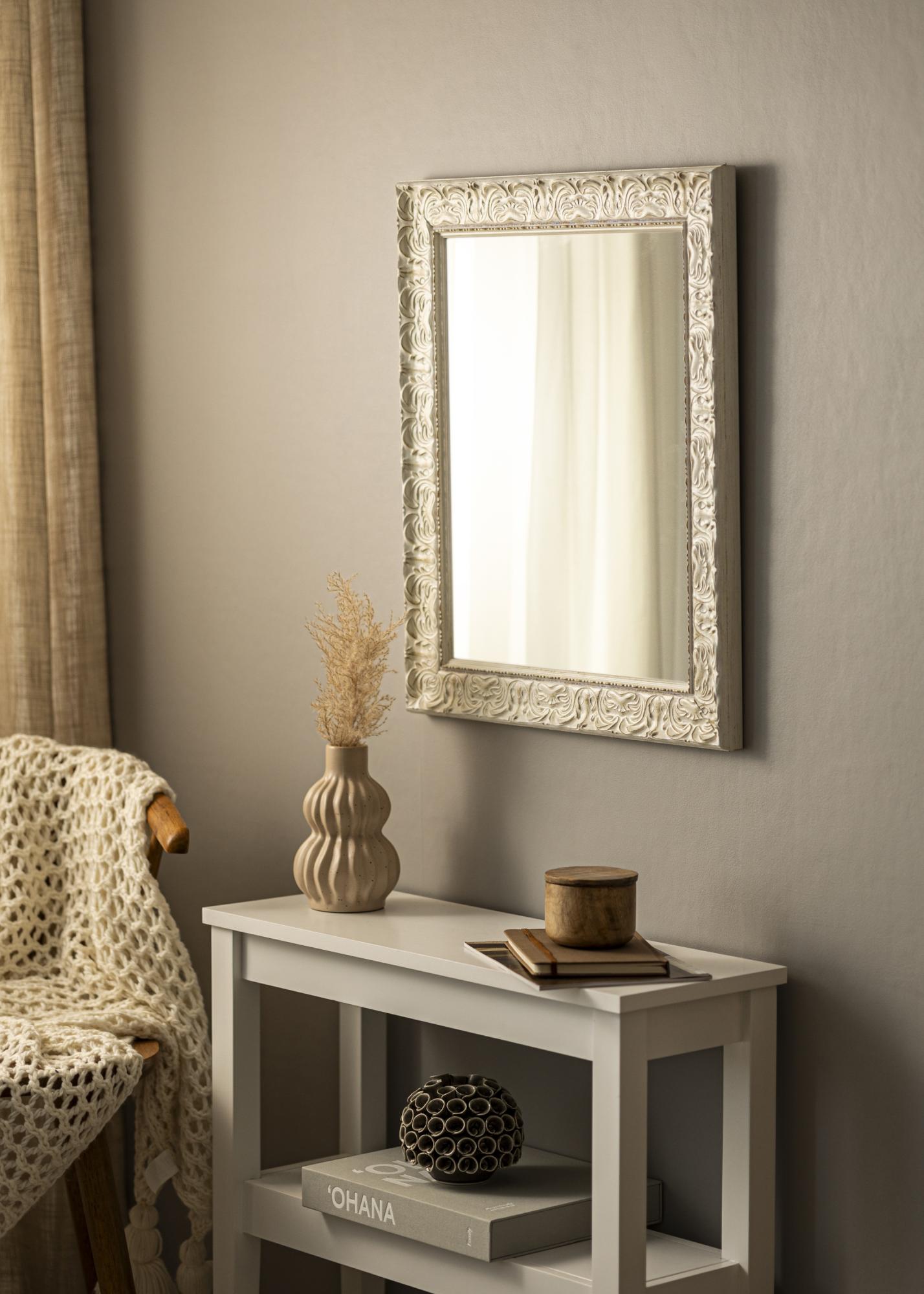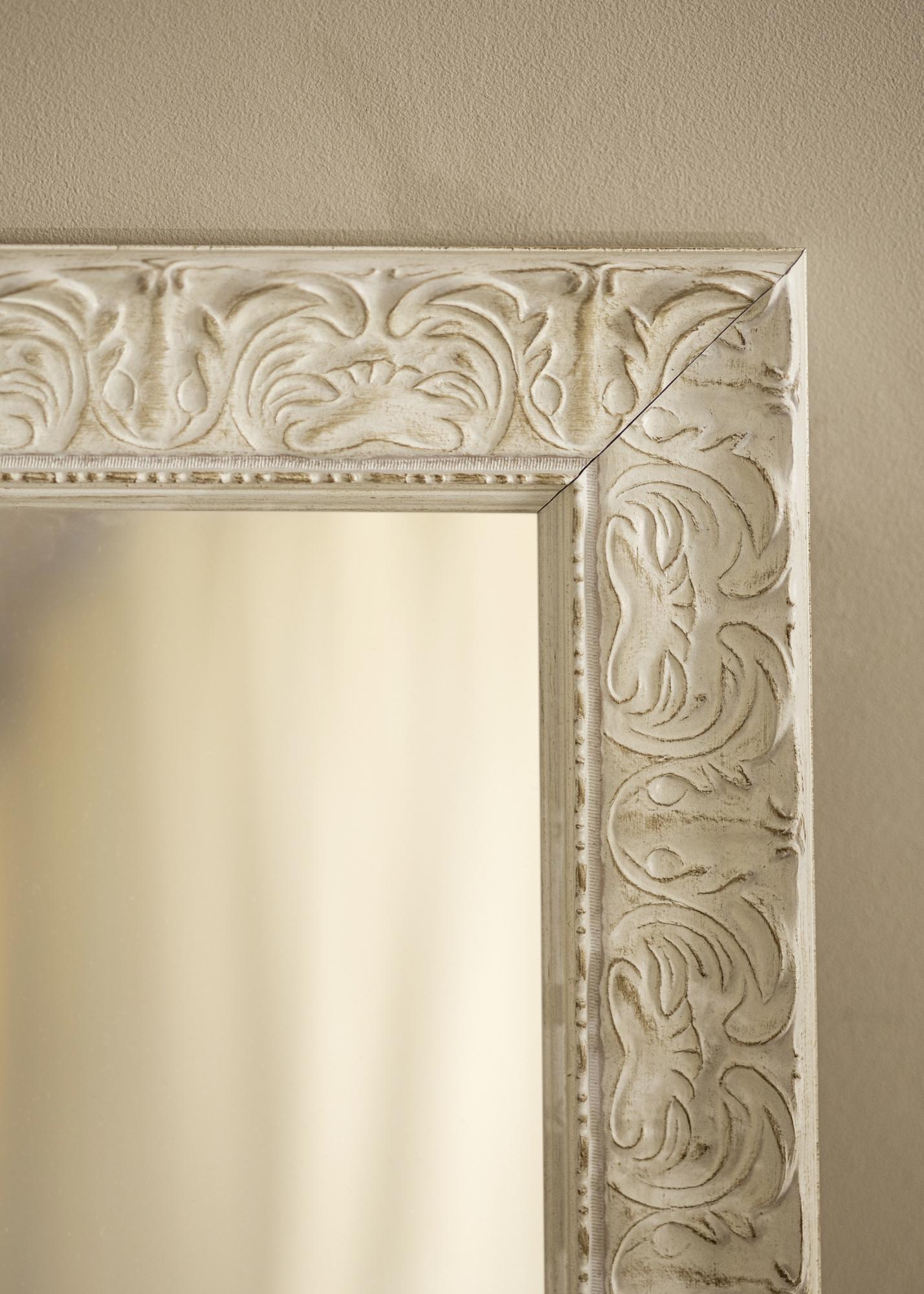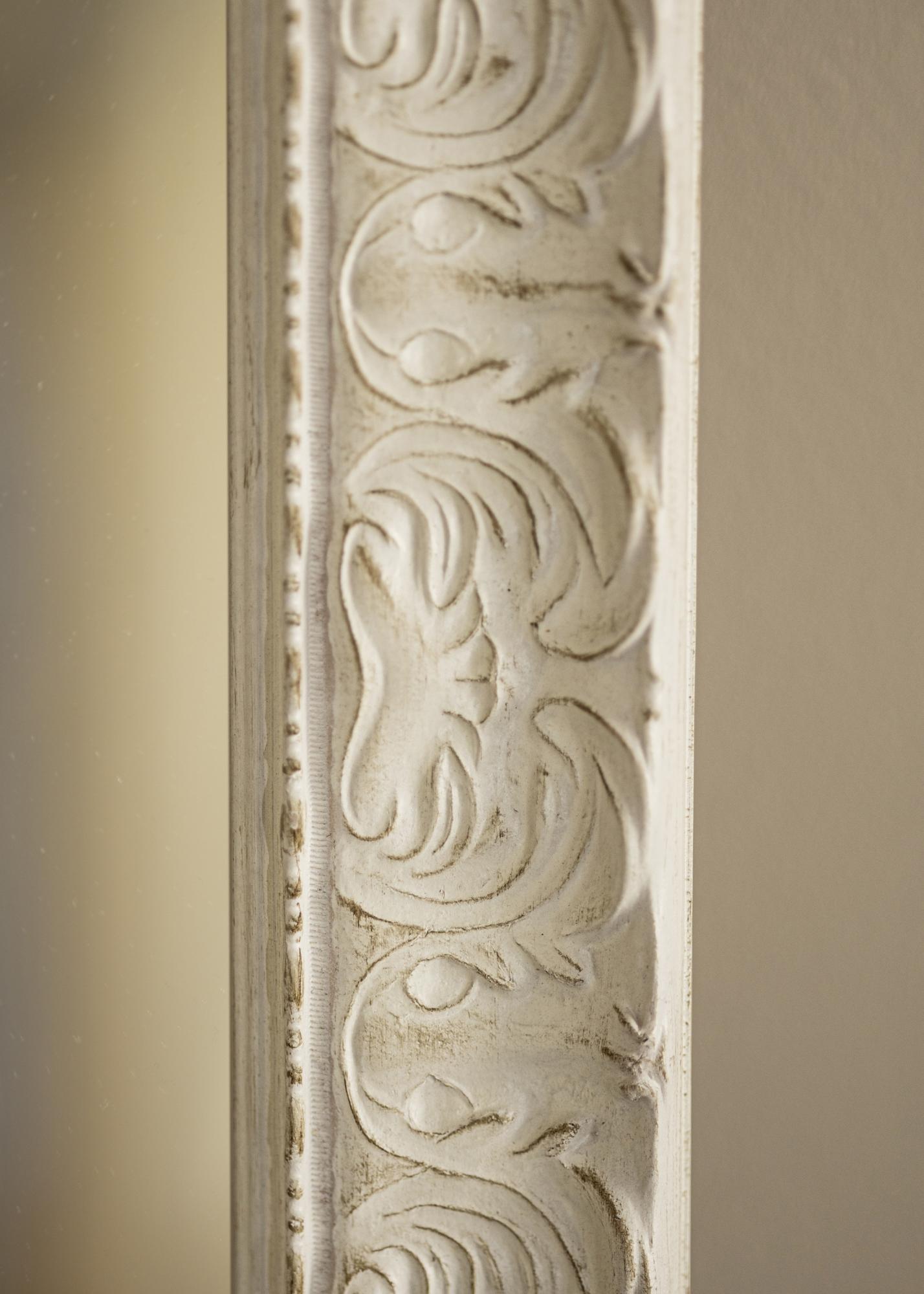 Antikni bijeli završni sloj zrcala s dekorativnim reljefom i suptilno istrošenom površinom daje mu jedinstven karakter. Ukrašeni detalji pojačavaju njegov klasični izraz i čine ga vizualnim središtem prostora. Bez obzira na to imate li moderan ili tradicionalan stil uređenja, ovo zrcalo će se uklopiti i istovremeno dodati nešto posebno.