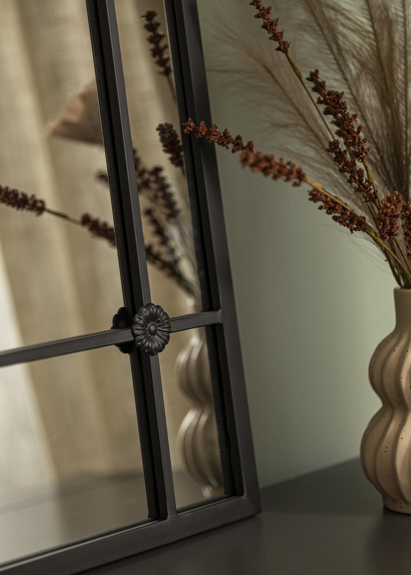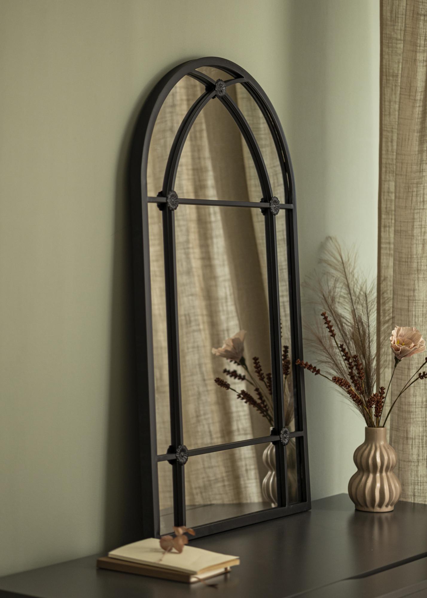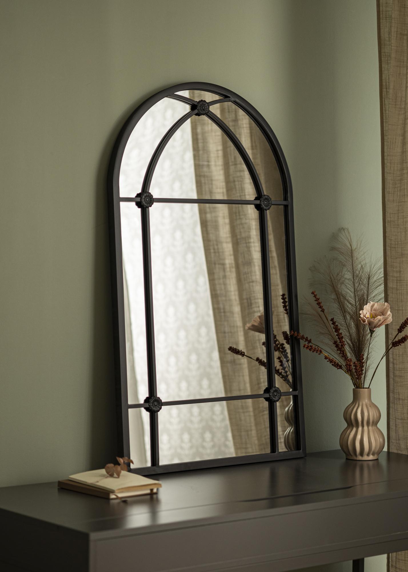Sa svojom lučnom siluetom i detaljno izrađenim željeznim radom, zrcalo podsjeća na klasične prozore koji daju osjećaj dubine i prostranosti u prostoriji. Ono nije samo praktičan predmet za svakodnevnu upotrebu, već i umjetnički detalj u interijeru koji privlači pogled i doprinosi atmosferi prostorije.