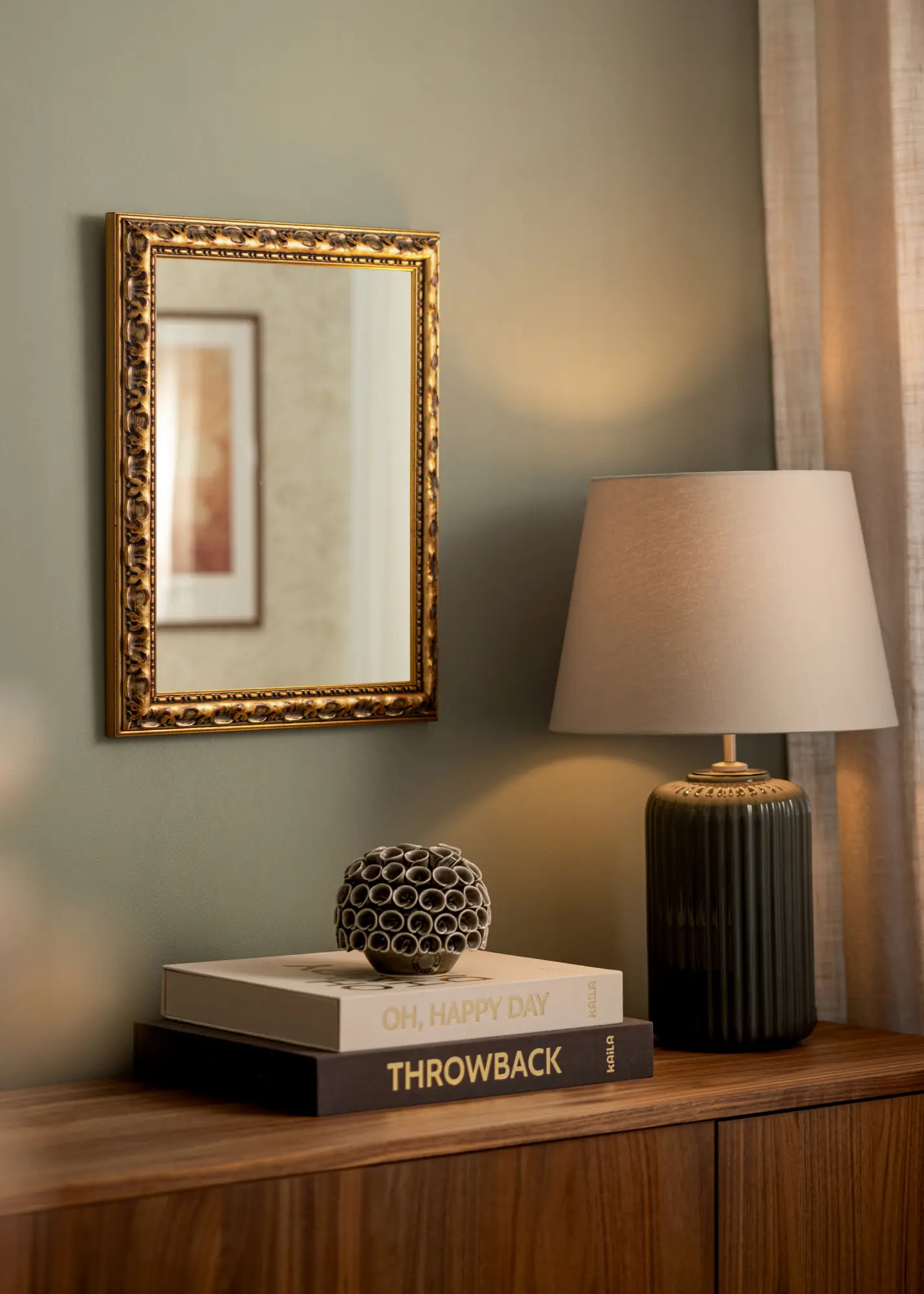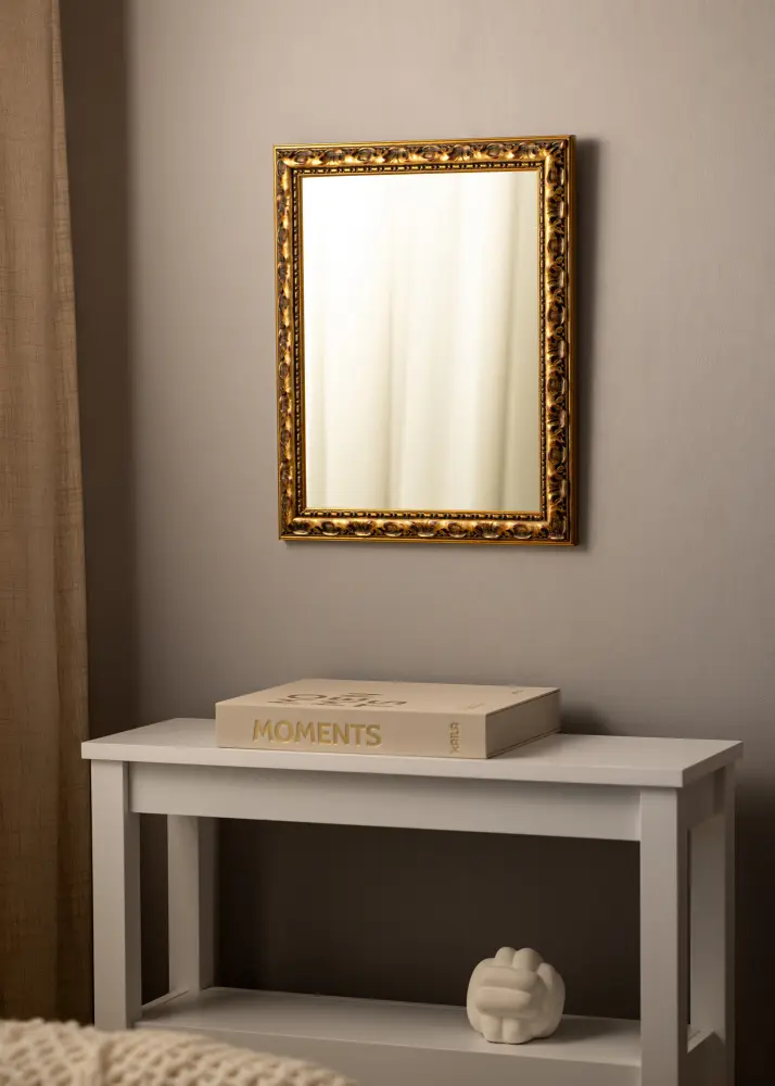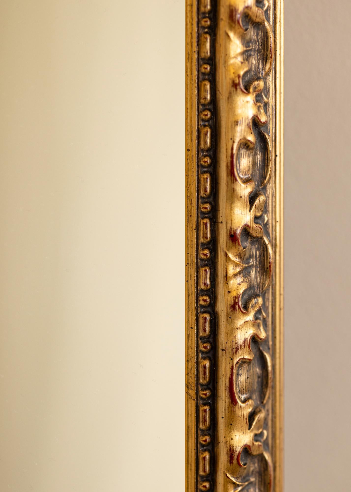 Okvir Zrcala Freyja Gold širok je 38 mm i ima dubinu od 34 mm, što zrcalu daje robusni i čvrst osjećaj. Izrađeno od bora, kombinira izdržljivost s klasičnom estetikom. Antička završna obrada s tamnim patiniranim detaljima i suptilnim crvenim tonovima pojačava rustikalni karakter zrcala i daje mu bezvremenski šarm.