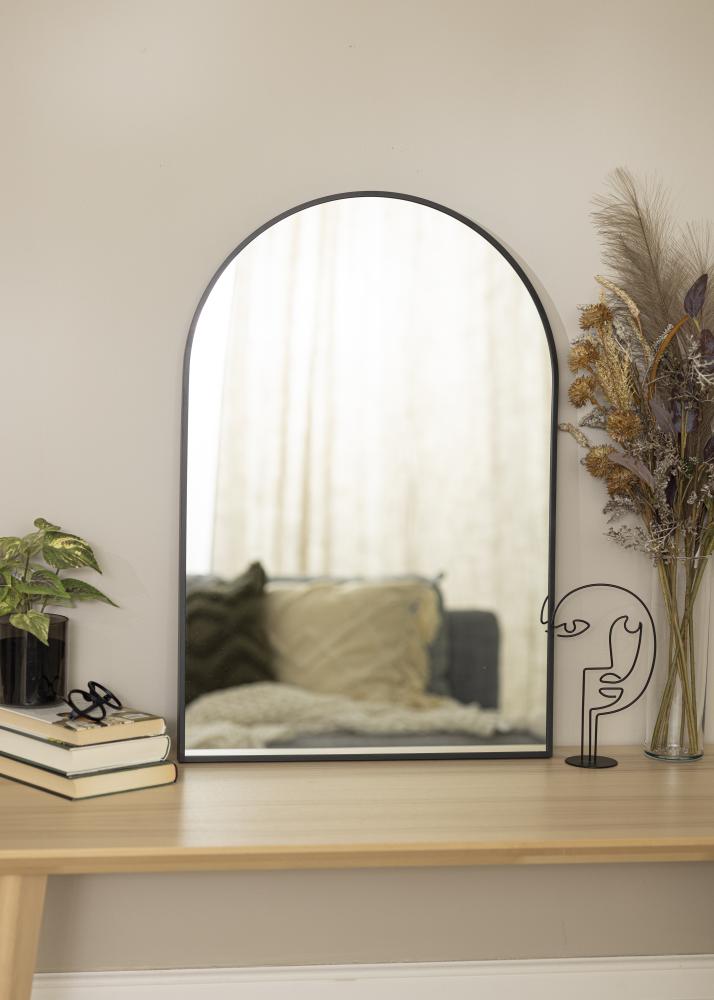Ovo je izvrstan izbor za vas koji tražite ogledalo modernog dizajna s trendovskim izvedenjem u obliku luka i elegantnim crnim okvirom. Okvir ogledala je dubok 28 mm i izraÄen od metala. Ovo Äe ogledalo biti izuzetan dekorativni detalj u hodniku ili dnevnoj sobi, gdje Äe lijepo reflektirati svjetlost iz svih izvora svjetla u prostoriji. Robustni materijal omoguÄuje i njegovo koriÅ¡tenje u kupaonici.