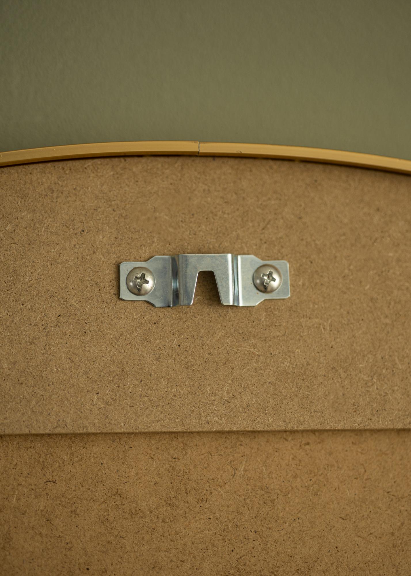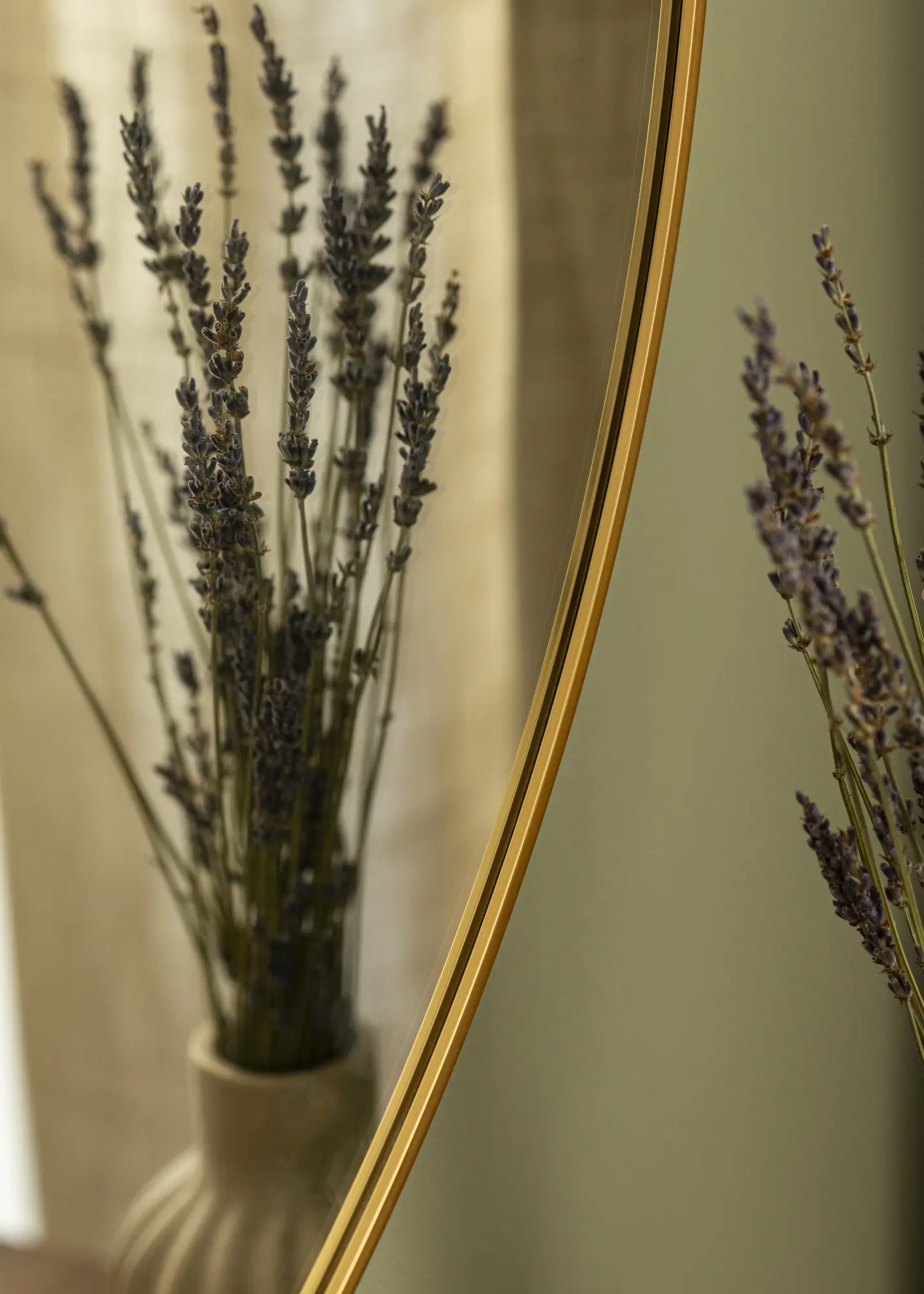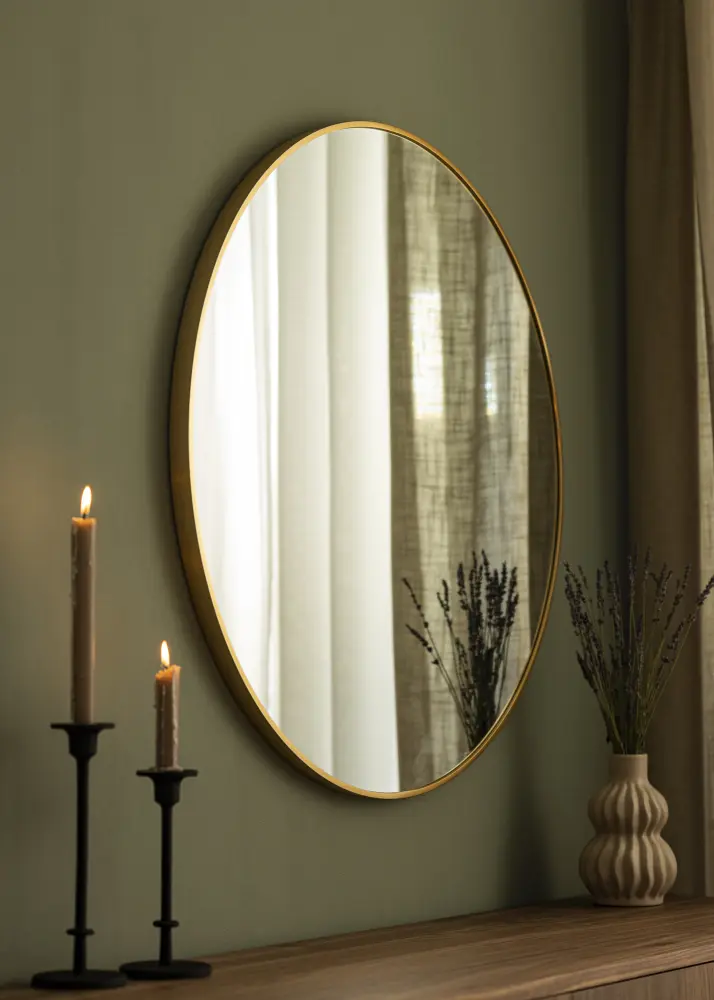 Ovo zidno ogledalo ima klasičan okrugli oblik okružen elegantnim okvirom od aluminija zlatne boje. Boja i sjaj okvira stvaraju luksuznu atmosferu i postaju upečatljiv detalj na bilo kojem zidu. Okrugli oblik doprinosi blagom i harmoničnom osjećaju u prostoru.