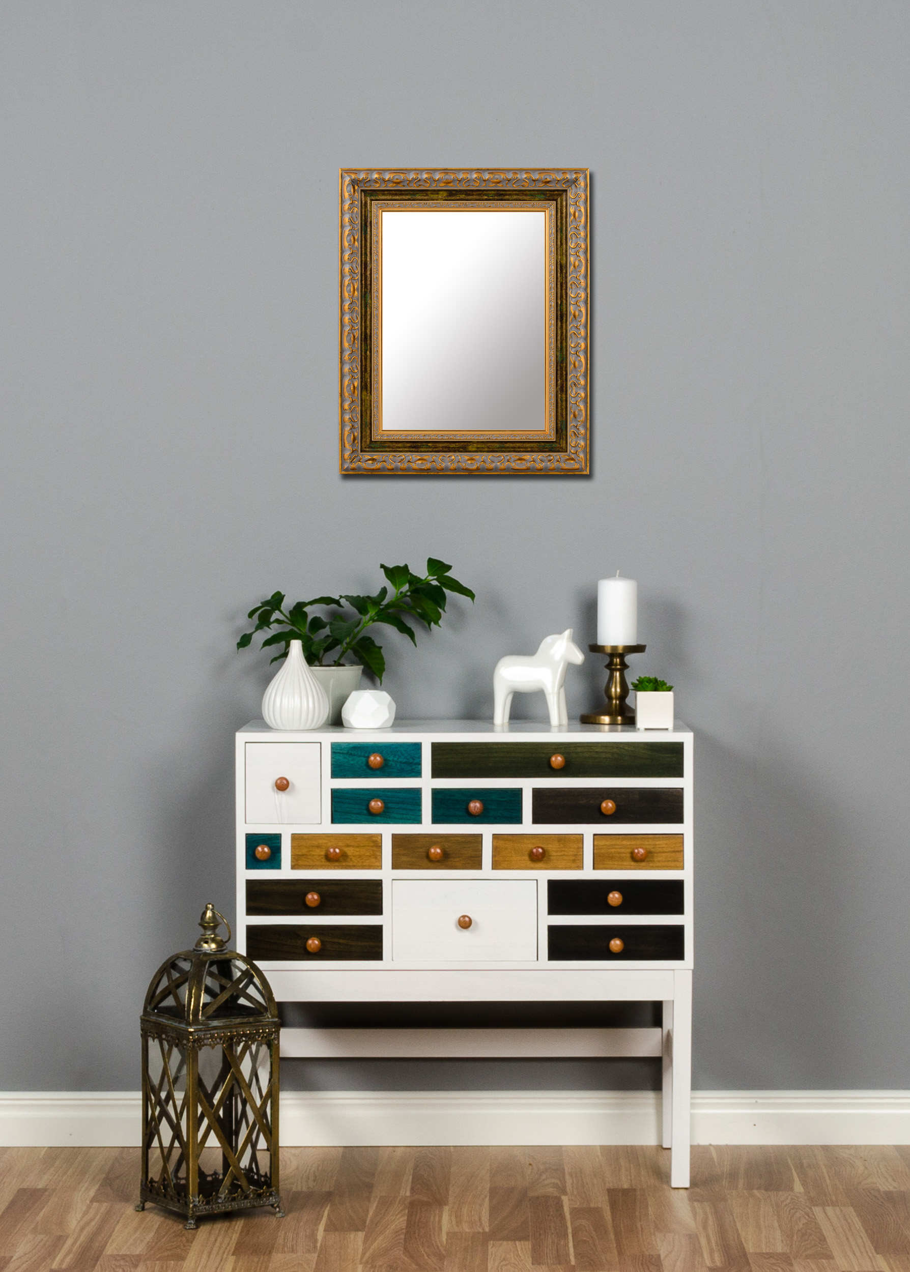 Uz pomoć pravog ogledala možete u potpunosti preobraziti zid! Ovo luksuzno zlatno ogledalo ima uzbudljiv dizajn koji privlači pažnju. Drveni okvir ima sprijeda i veliki i manji pojas sa zavojitim uzorkom koji je prekinut pohabanim dijelom. Površina je obrađena kako bi izgledala karakteristično postarano. Budući da se izrađuje prema vašim mjerama, možete biti sigurni da će savršeno odgovarati tamo gdje ga želite imati!