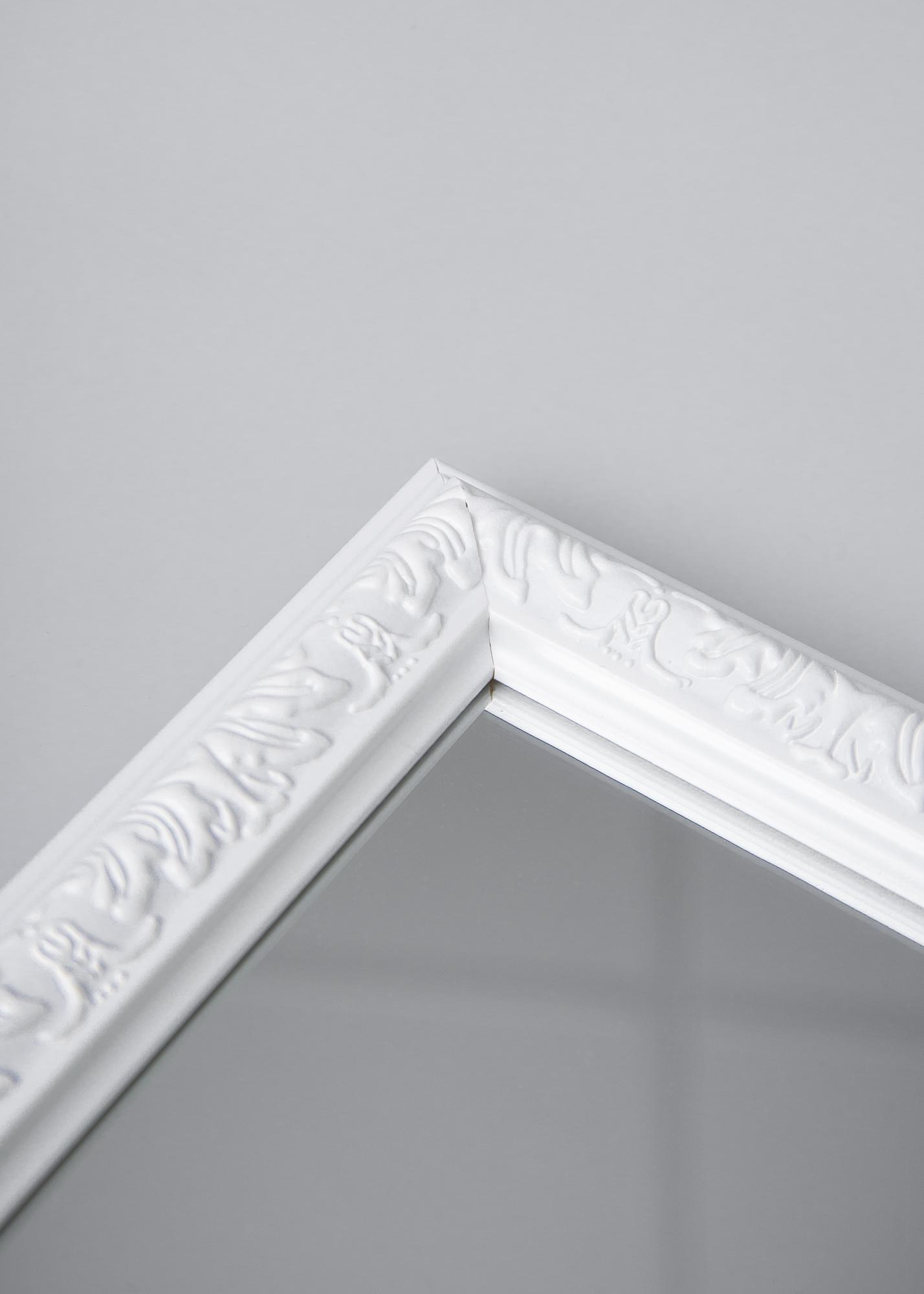 Ovo zidno ogledalo je elegantan unutarnji detalj koji prekrasno reflektira svjetlost iz svih izvora svjetlosti u prostoriji. Bijeli okvir daje svijetao i svjež dojam, koji je savršeno dopunjen dekorativnim profilom okvira i prekrasnim uzorkom.