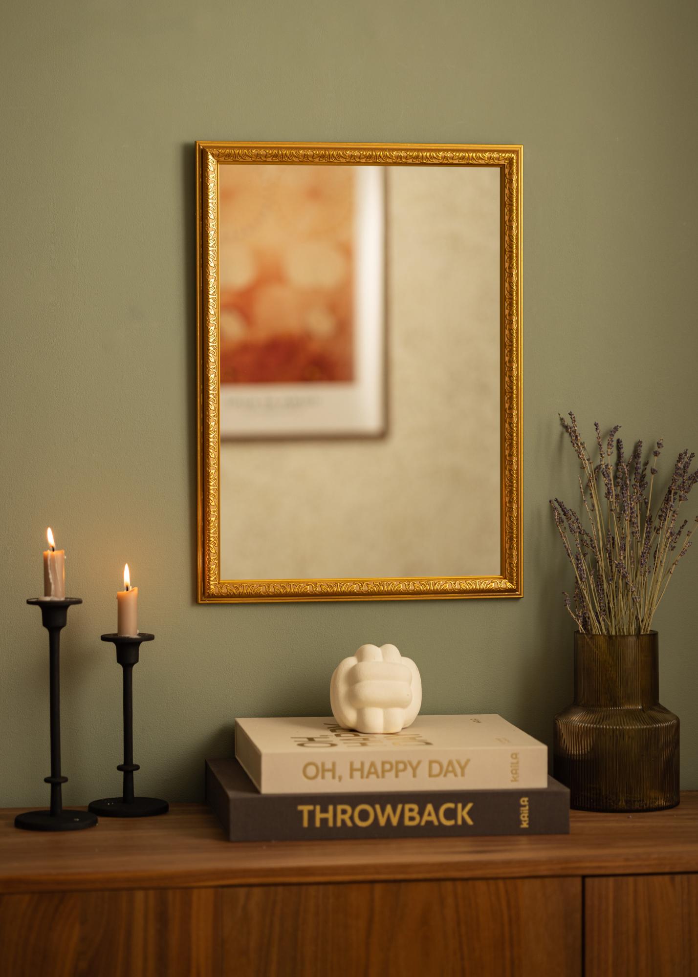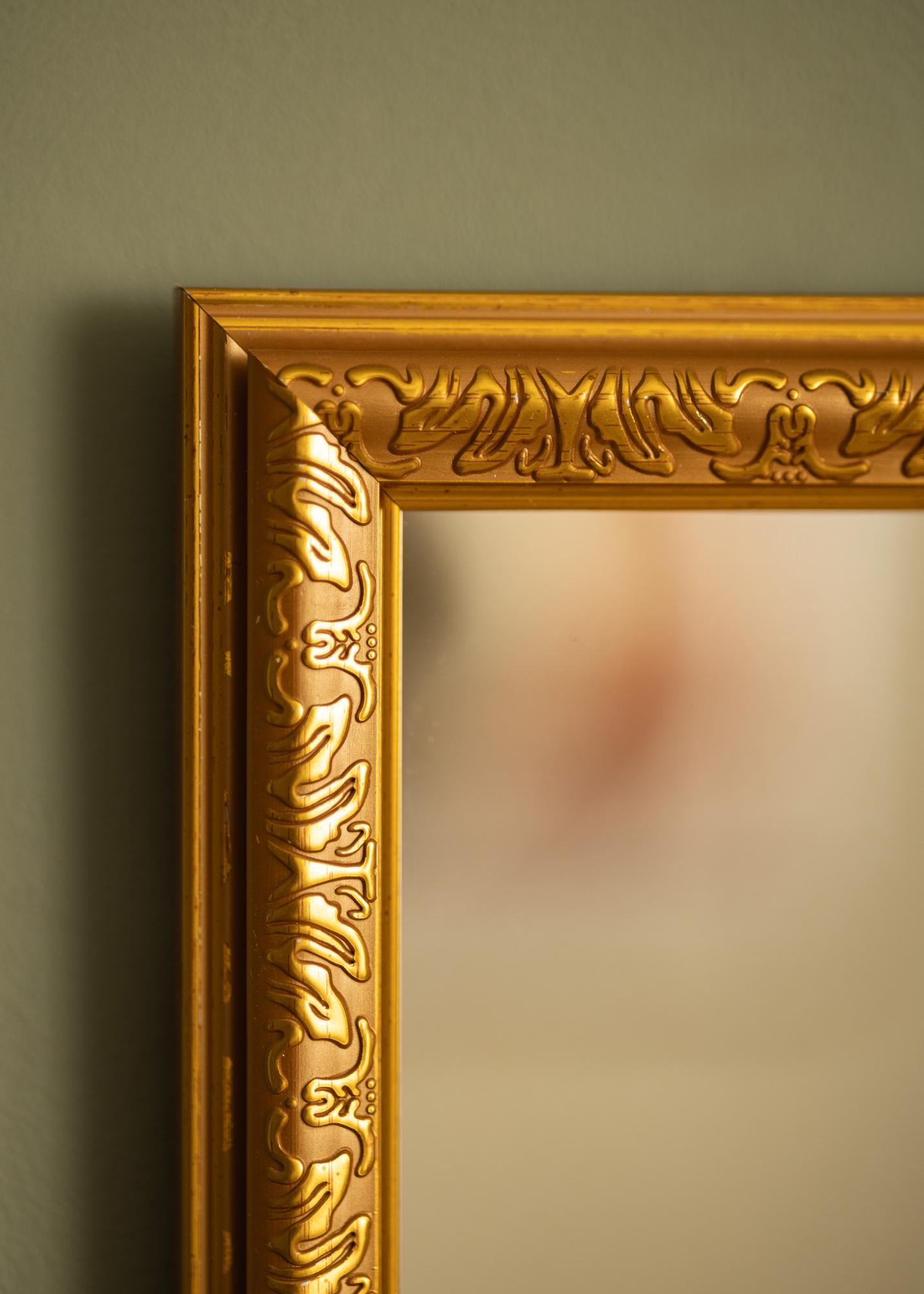 Ako tražite luksuzno ogledalo zlatne boje, možete prestati tražiti sada. Nostalgia Gold je zidno ogledalo s okvirom širine 2,8 cm s elegantnim profilom i prekrasnim dekorativnim uzorkom. Staklo ogledala će reflektirati svjetlo u vašoj sobi, dok će samo ogledalo biti stilski detalj na vašem zidu. Na stražnjoj strani nalazi se nosač za jednostavno vješanje.