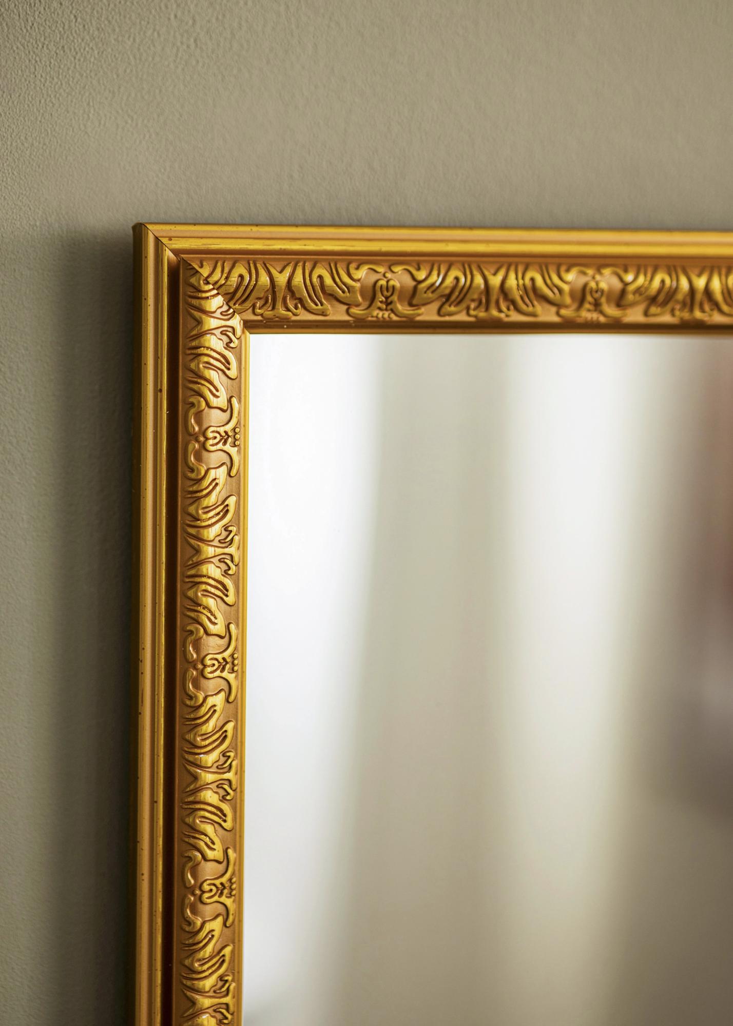 Jeste li u potrazi za luksuznim ogledalom zlatne boje? Sada možete prestati tražiti. Nostalgia Zlato je zidno ogledalo s okvirom širine 2,8 cm s elegantnim profilom i lijepim dekorativnim uzorkom. Ogledalo će reflektirati svjetlost u vašoj prostoriji, dok će samo ogledalo biti stilski detalj na vašem zidu. Na stražnjoj strani nalazi se zidni nosač za jednostavnije postavljanje.