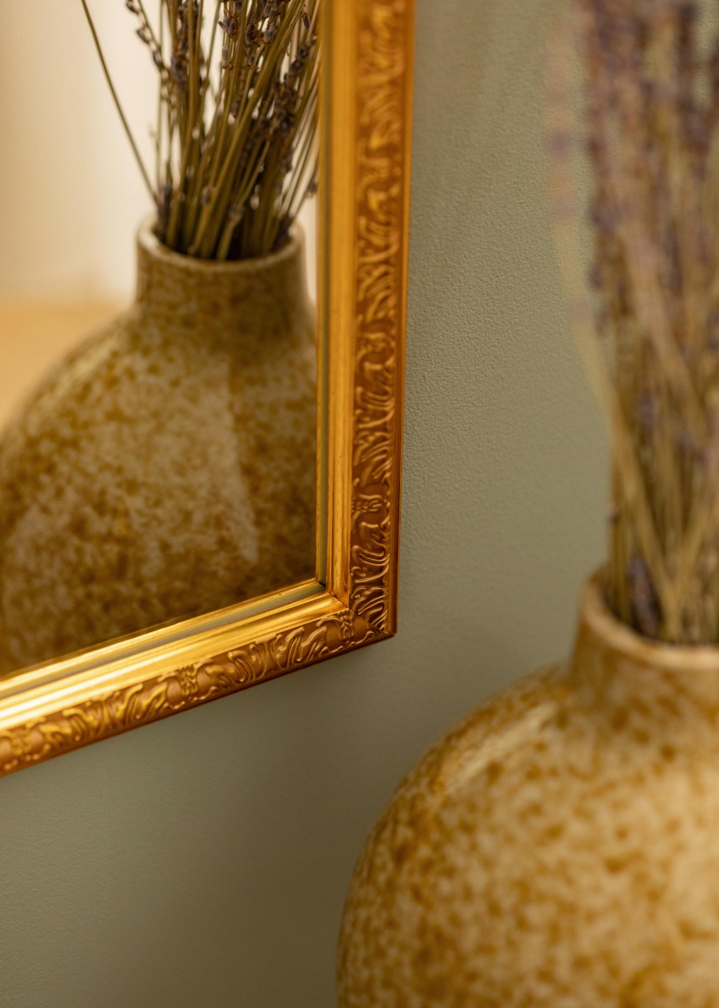 Jeste li u potrazi za luksuznim zrcalom zlatne boje, možete prestati tražiti. Nostalgia Gold je zidno zrcalo s okvirom širokim 2,8 cm s elegantnim profilom i prekrasnim dekorativnim uzorkom. Zrcalo će reflektirati svjetlo u vašoj sobi, dok će samo zrcalo biti stilski detalj na vašem zidu. Na stražnjoj strani nalazi se zidni nosač za lakše vješanje.