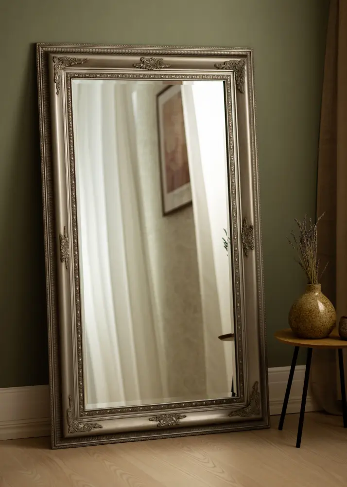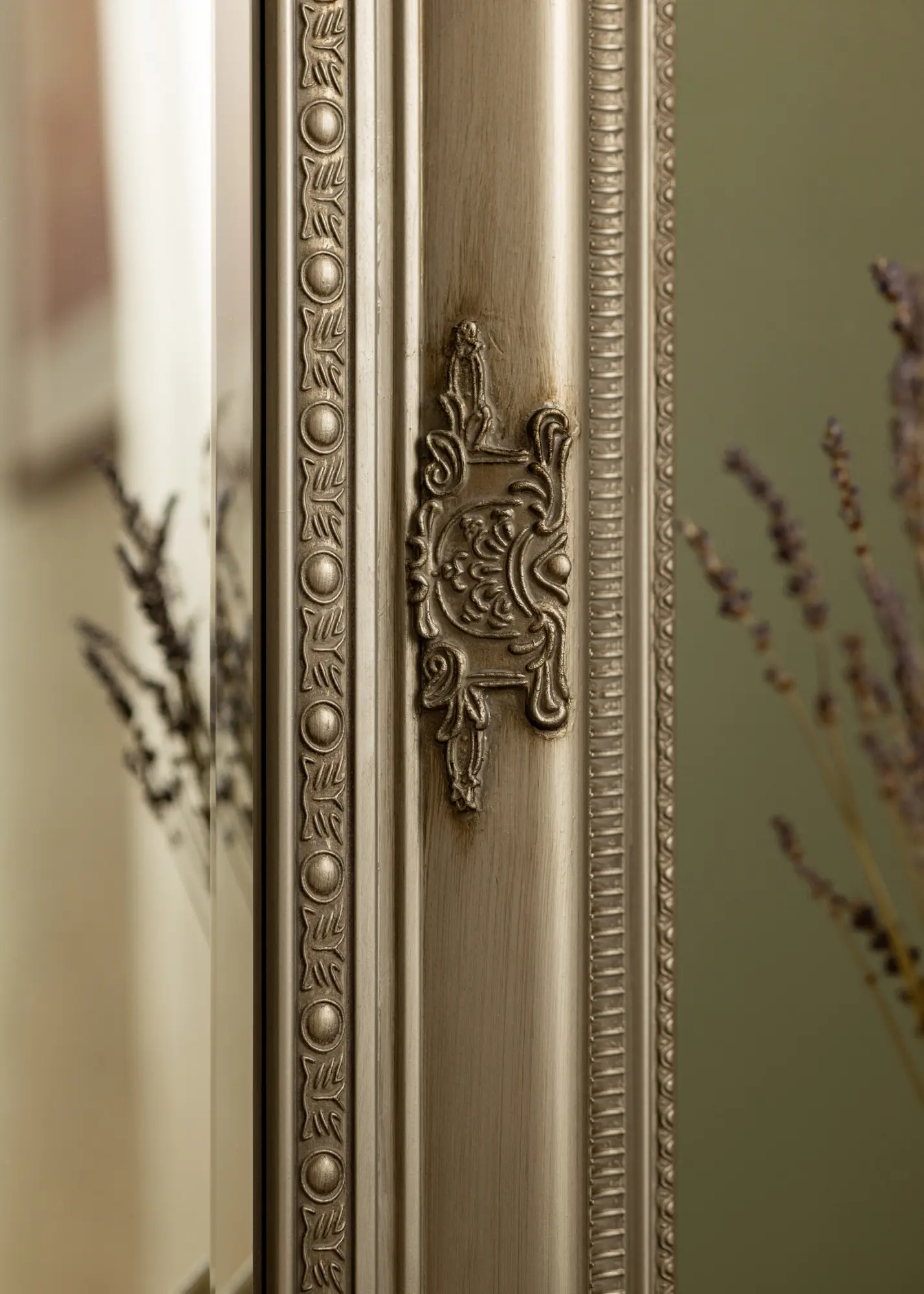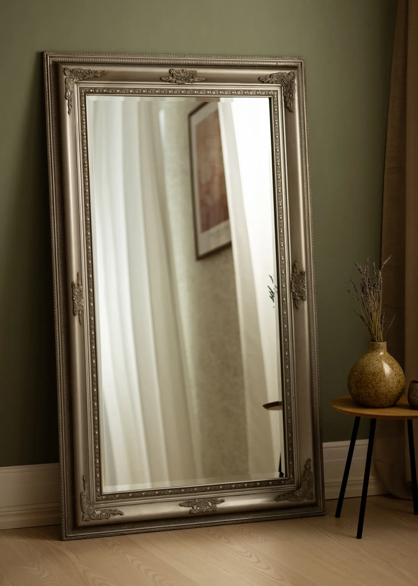 Srebrna ogledala u klasičnom stilu s uzorkovanim profilom i ornamentima cvijeća oko ogledala. Antikni osjećaj ogledala čini ga lijepim dodatkom u uređenju sa stilskim namještajem, ali također postaje zanimljiv kontrast u čistom modernom interijeru. Format omogućuje ogledalu da dobro funkcionira kako u hodniku, tako i u velikom ormaru ili na zidu u spavaćoj sobi gdje odjeća igra važnu ulogu u uređenju. Istaknite ogledalo s ukrasnim dodacima u srebru u sobi.