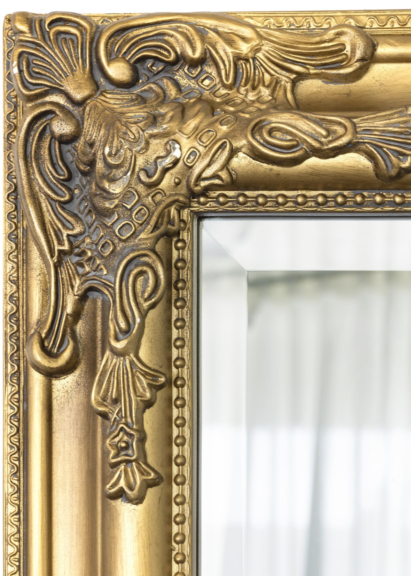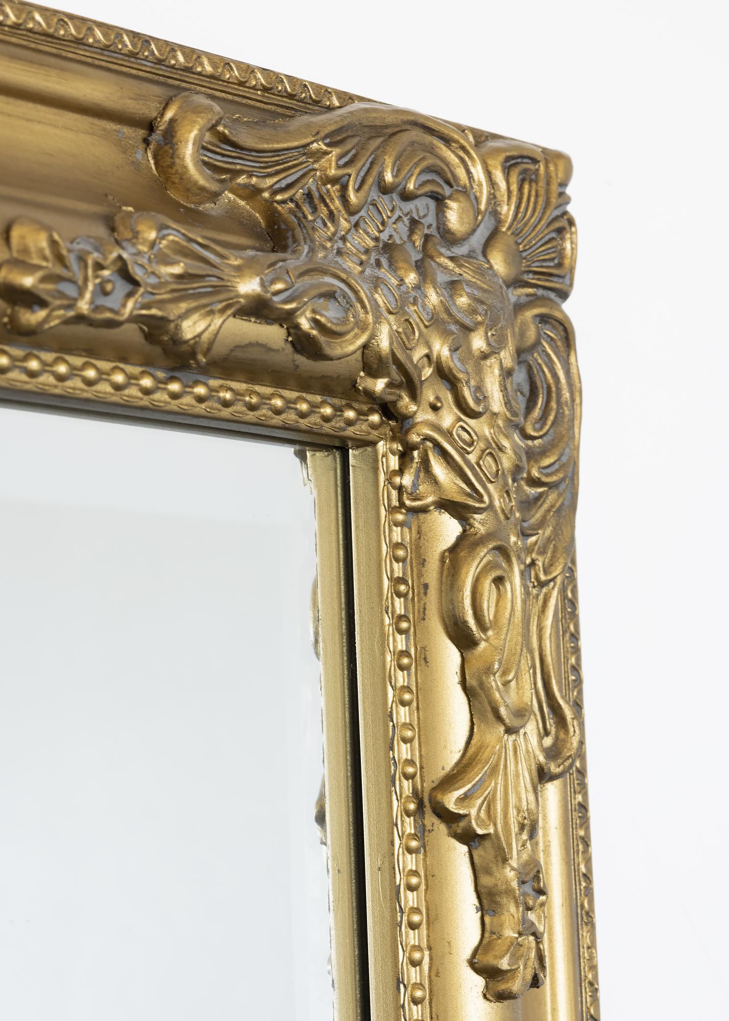 Zrcalo s lijepim profilom u zlatnoj boji s antiknim osjećajem, ukrašeno cvjetnim ornamentima. Klasični stil okvira zrcala omogućuje mu da se uklopi u interijere sa starijim namještajem, ali se također može koristiti za stvaranje uzbudljivog kontrasta u modernom minimalističkom uređenju. Zrcalo će lijepo izgledati kada se objesi u hodniku, spavaćoj sobi ili u garderobi i istaknut će se na lijep način uz ukrasne dodatke u mesingu ili zlatnim nijansama.