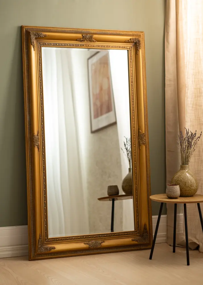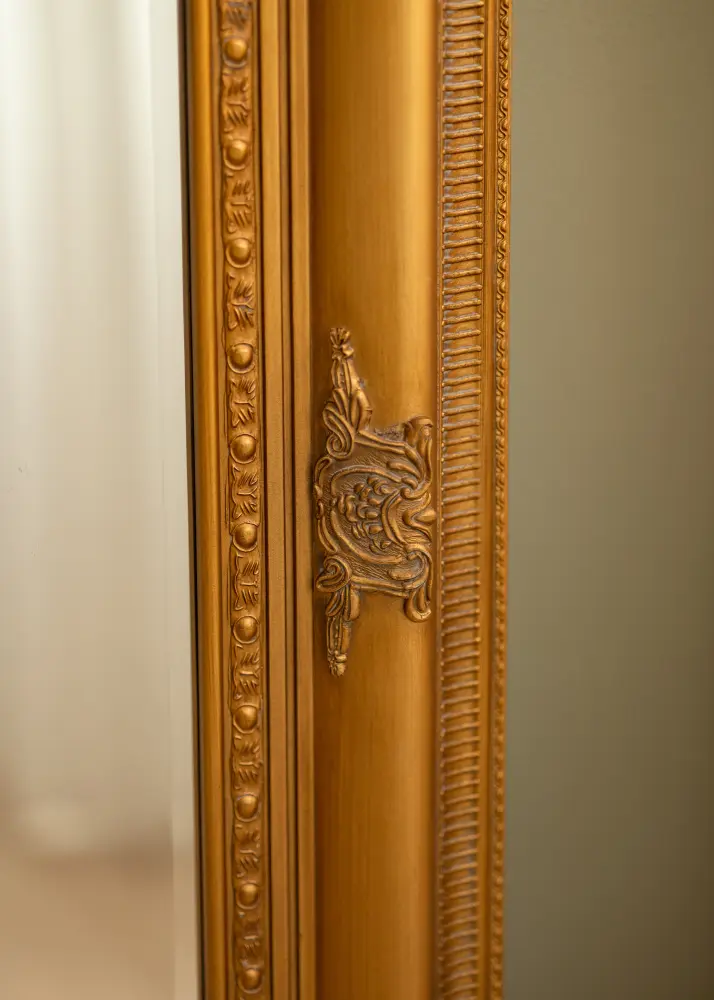 Ogledalo s finim profilom u zlatnoj boji s antiknim osjećajem, ukrašeno cvjetnim ornamentima. Klasični stil okvira ogledala omogućava da se uklapa u interijere s starijim namještajem, ali se također može koristiti za stvaranje uzbudljivog kontrasta u modernom i elegantnom uređenju. Ogledalo izgleda lijepo kada je obješeno u hodniku, spavaćoj sobi ili ormaru i ističe se na lijep način zajedno s ukrasnim dodacima od mesinga ili zlatnih nijansi.