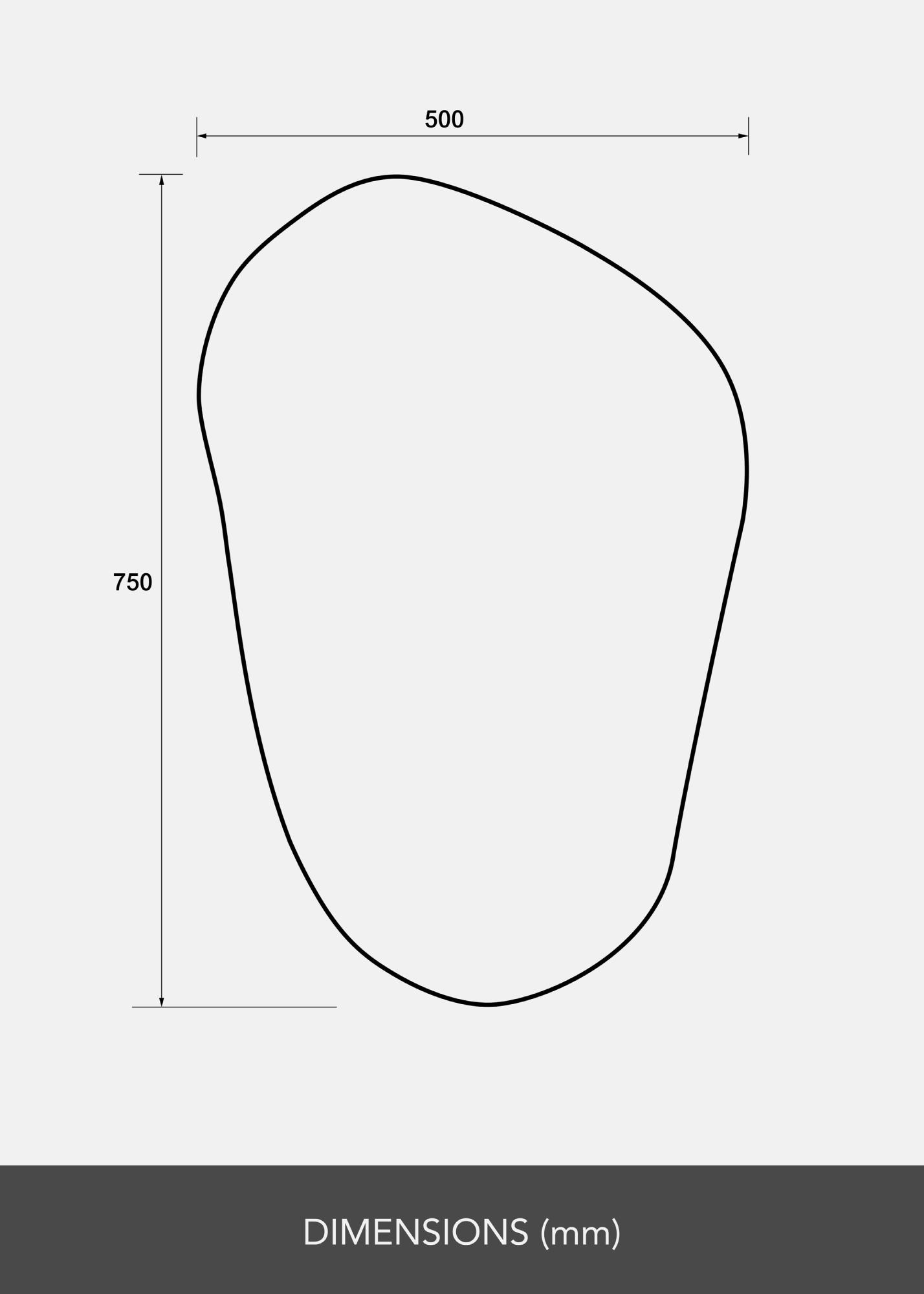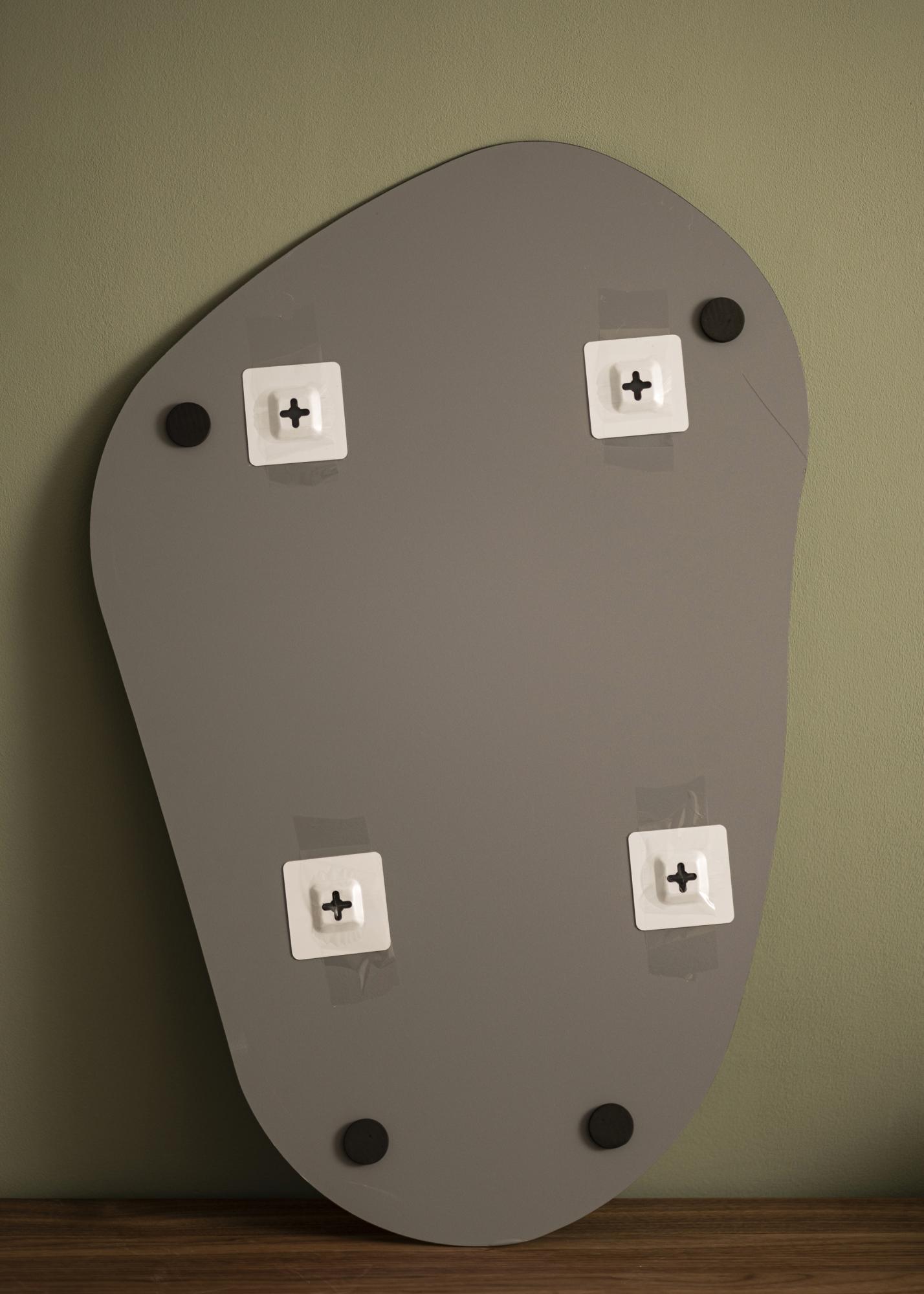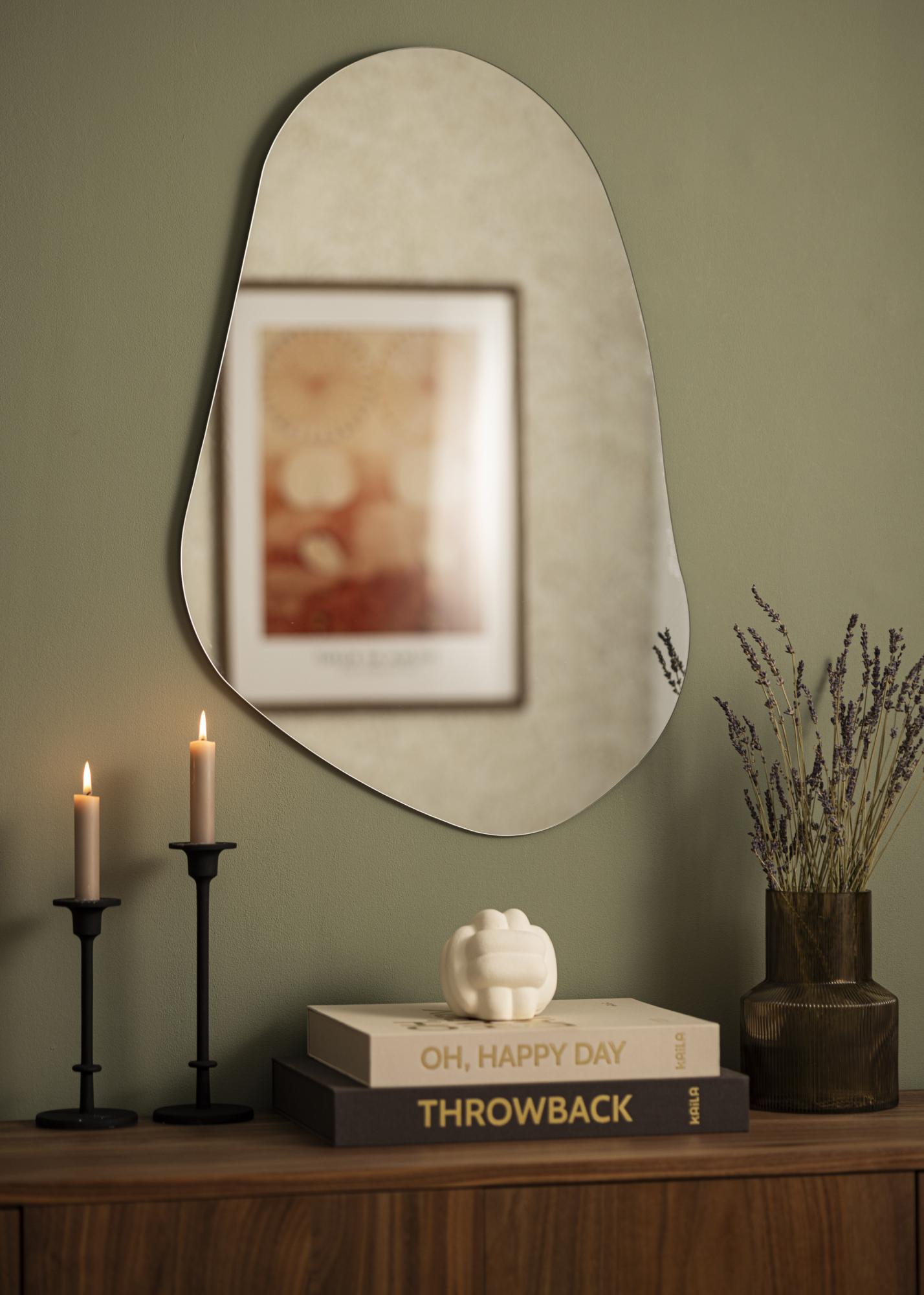 Ovo Ogledalo ima organski, asimetričan i nježno valovit oblik koji daje moderan i umjetnički dojam. Sa svojim zaobljenim krivuljama i bez ravnih rubova podsjeća na siluetu nacrtanu slobodnom rukom, poput prirodno oblikovanog kamena ili izduženog oblika kapljice.
