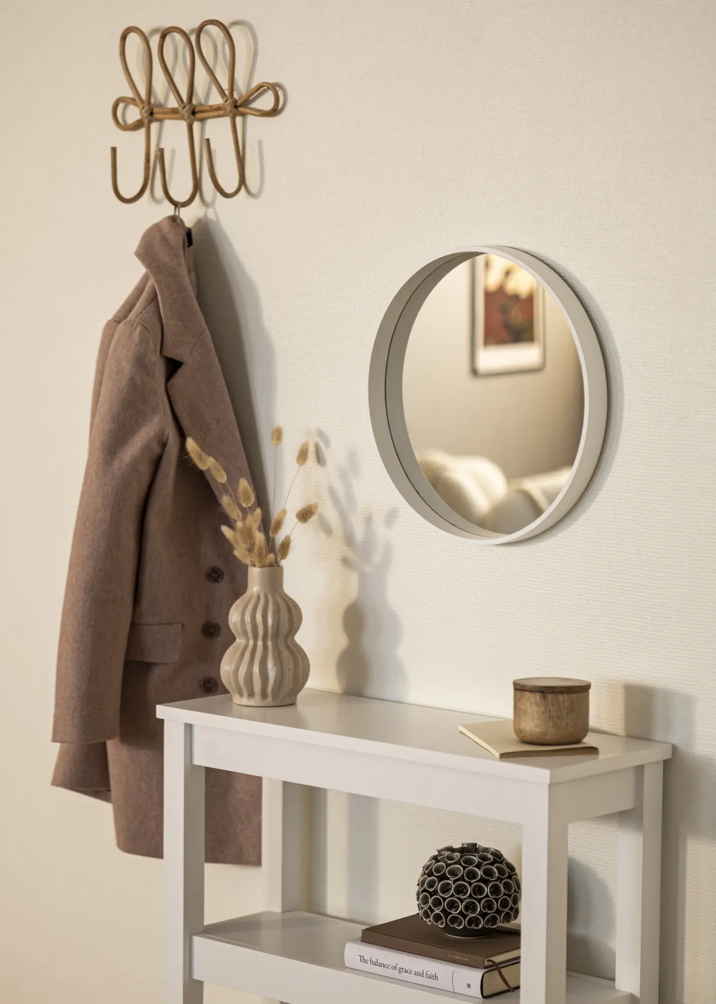 Otkrijte elegantnu jednostavnost naÅ¡eg okruglog ogledala, savrÅ¡enog za dodavanje elementa svjetla i prostora u vaÅ¡em domu. Bijeli okvir obuhvaÄa ogledalo sa suptilnim dodirom modernosti i ÄistoÄe, Å¡to ga Äini idealnim izborom za sve koji cijene minimalistiÄki dizajn.