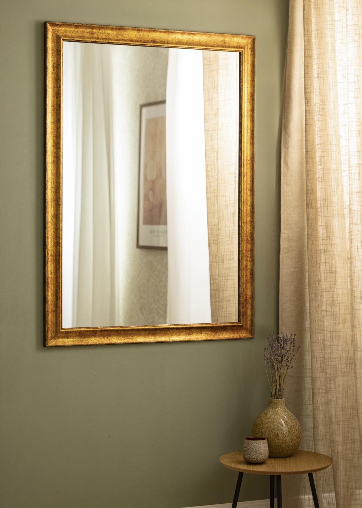 Ovo prekrasno zidno ogledalo ima dekorativni zlatni okvir izrađen od kompozitnog materijala. Okvir ima elegantan "istrošeni" izgled koji daje ogledalu stariji izraz, savršeno prilagodljiv toplim i ugodnim domovima. Praktična zidna vješalica na stražnjoj strani omogućuje vam da objesite ogledalo u uspravnom i vodoravnom položaju. Ovo ogledalo mjeri 70x100 cm.