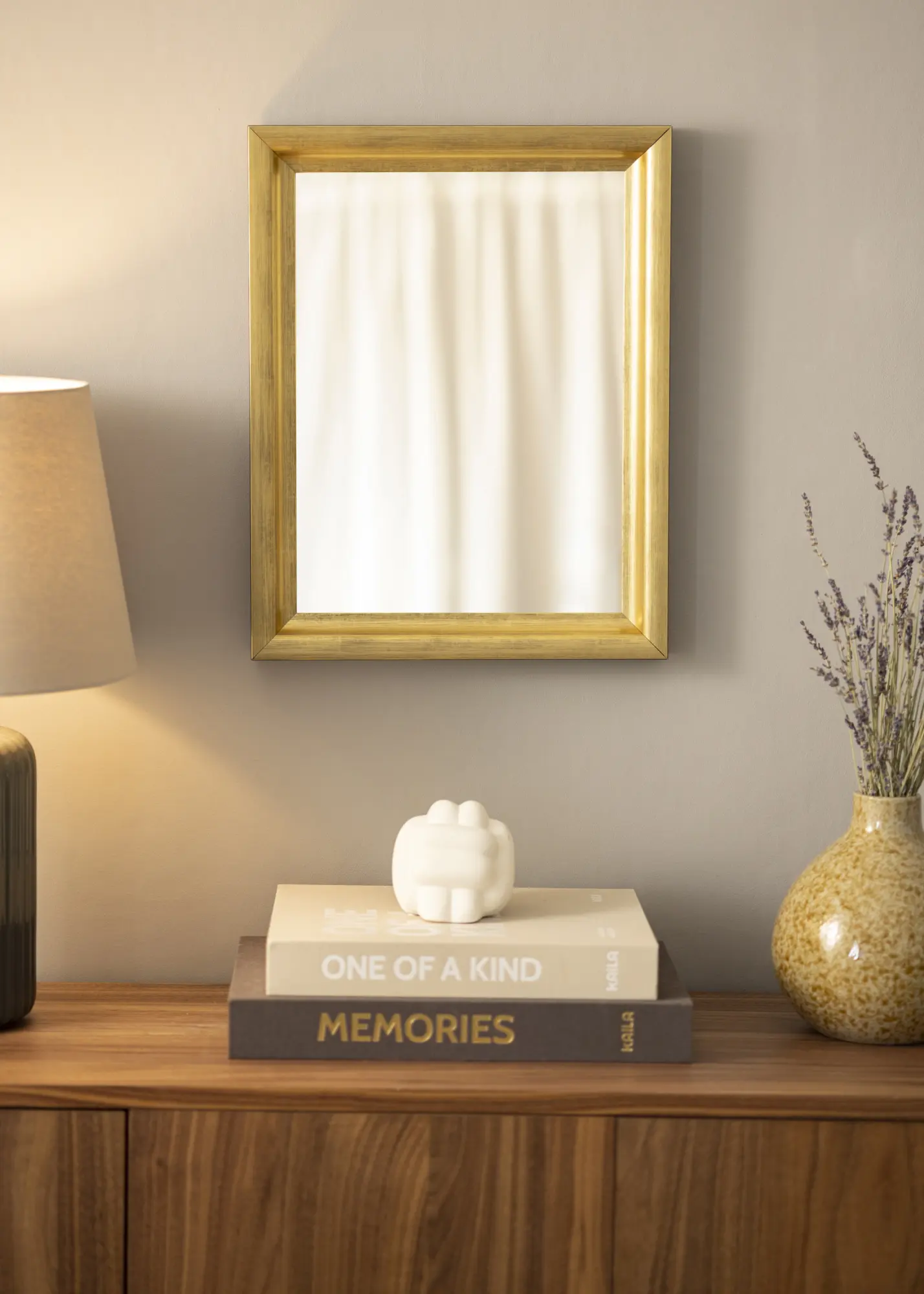 Klasično ogledalo gdje sami birate koliko veliko ogledalo želite imati. Sa svojim širokim i dubokim profilom, ovo je zasigurno ogledalo koje privlači pažnju. Ogledalo ima mekanu ugodnu zlatnu nijansu koja daje ugodan i lijep osjećaj.
