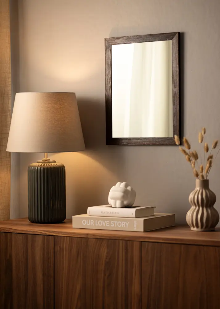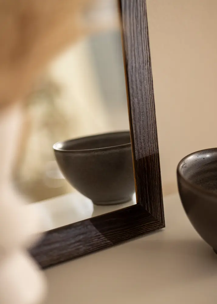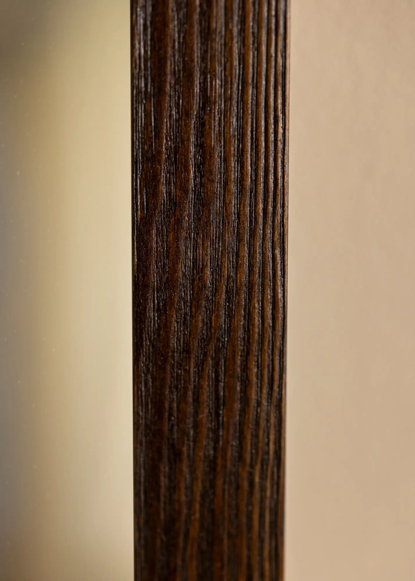 Robustan smeđi okvir za ogledalo s vidljivim drvenim žilama i širokim profilom. Odgovara kada tražite tamni drveni okvir s prirodnim osjećajem.