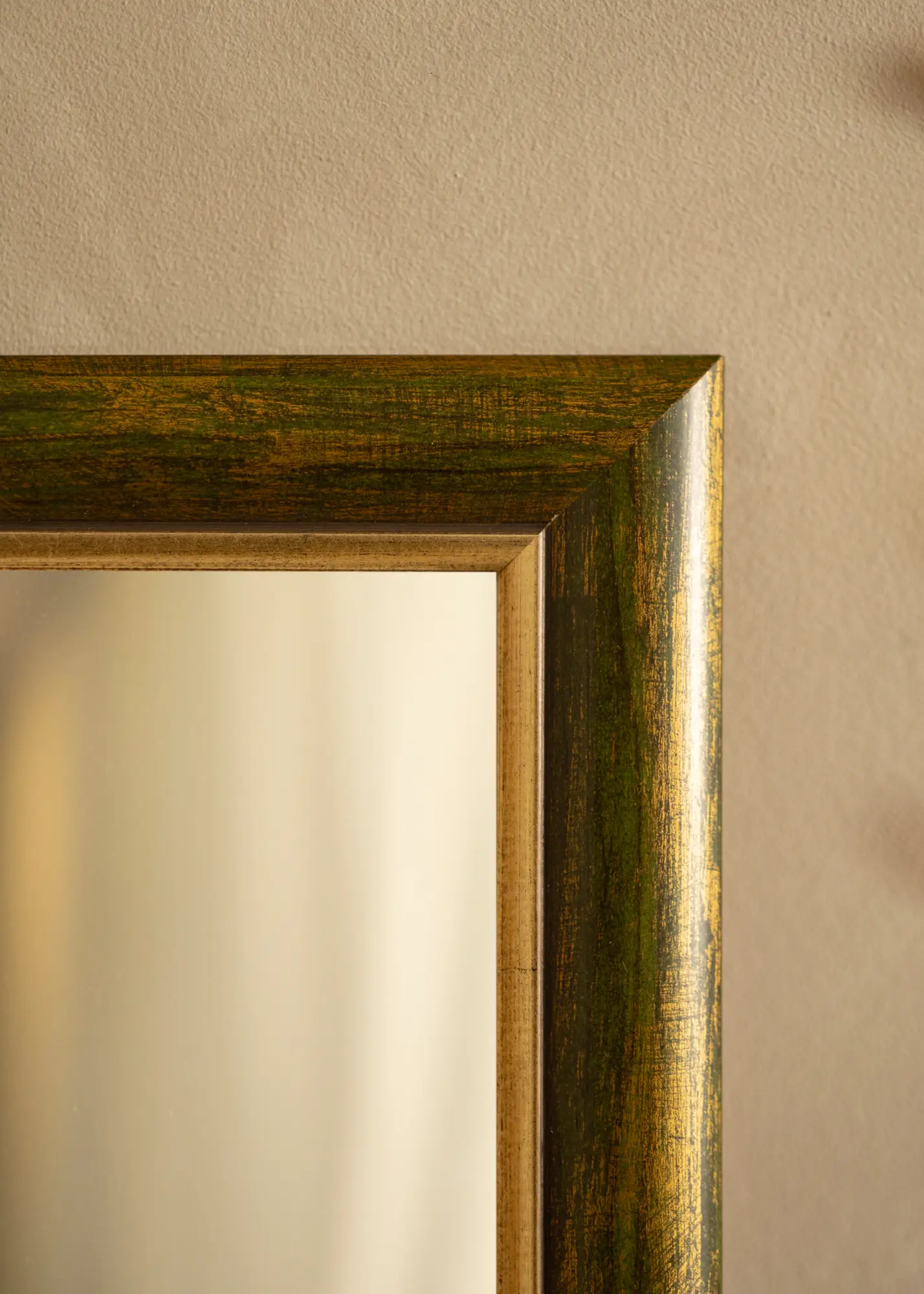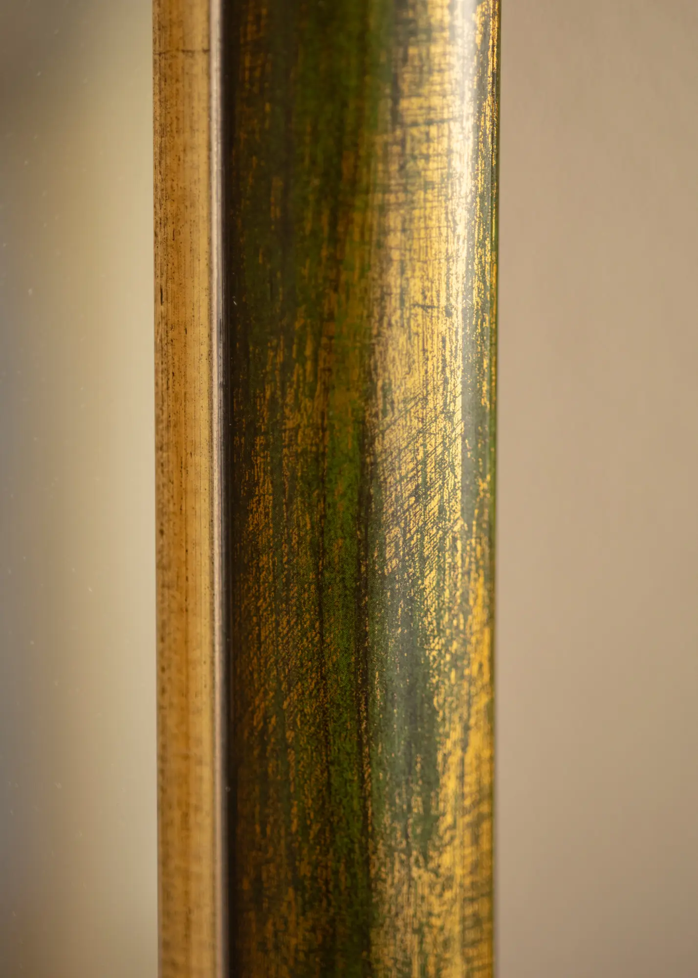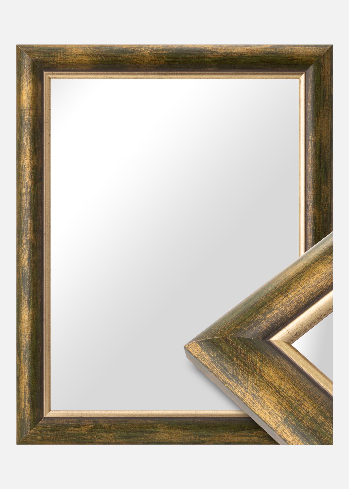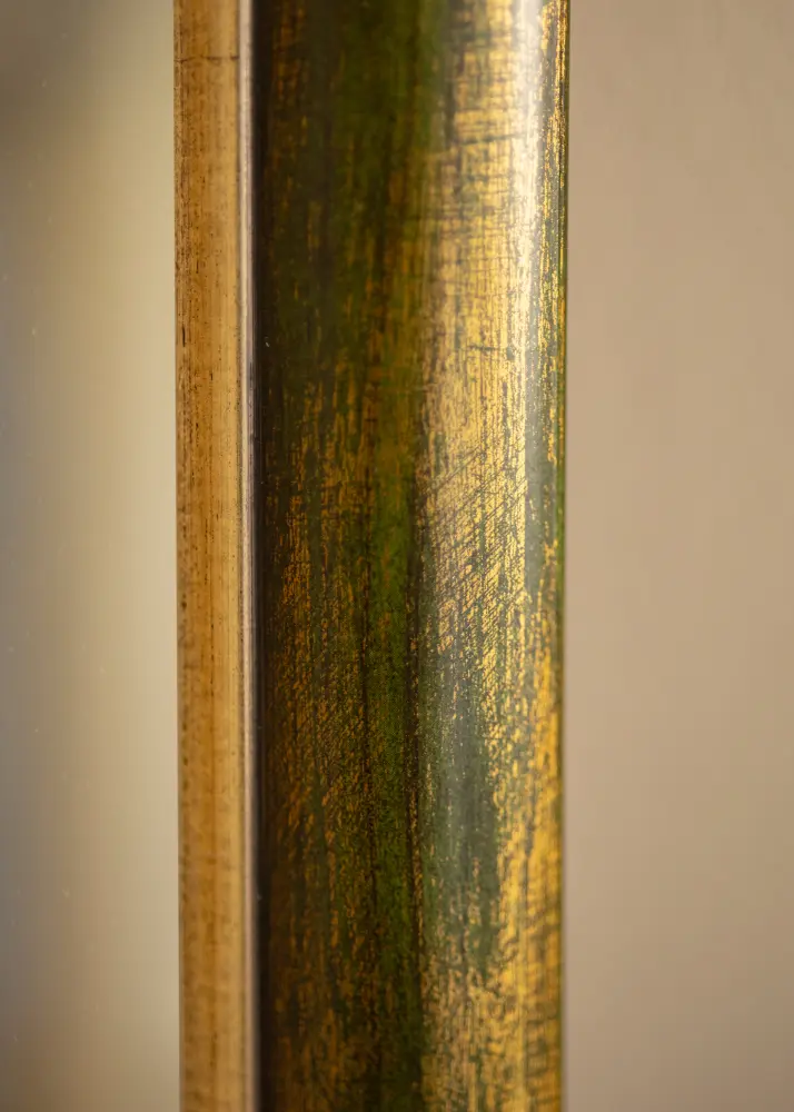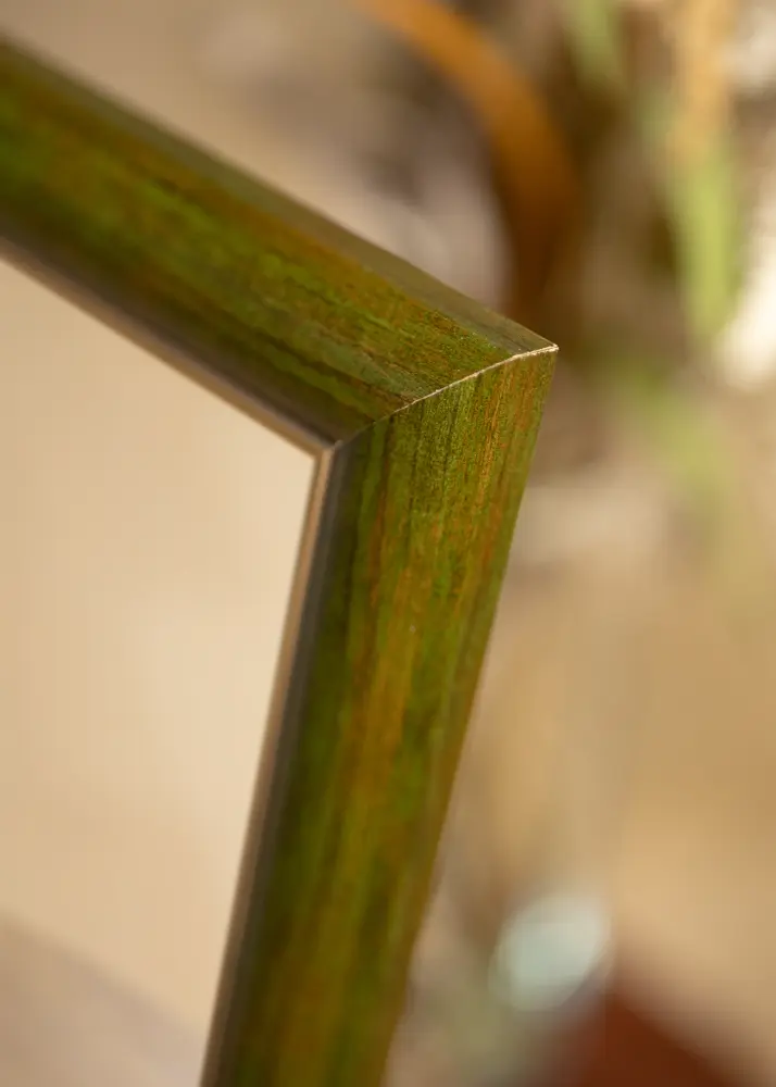 Bezvremenska drvena letva proizvedena u Finskoj s elegantnom drvenom površinom zelenog tona s pozlaćenim rubom uz sam ogledalo. Okvir ima široki profil od ukupno 41 mm i dubinu od 19 mm, što daje dodatnu dubinu vašem ogledalu.