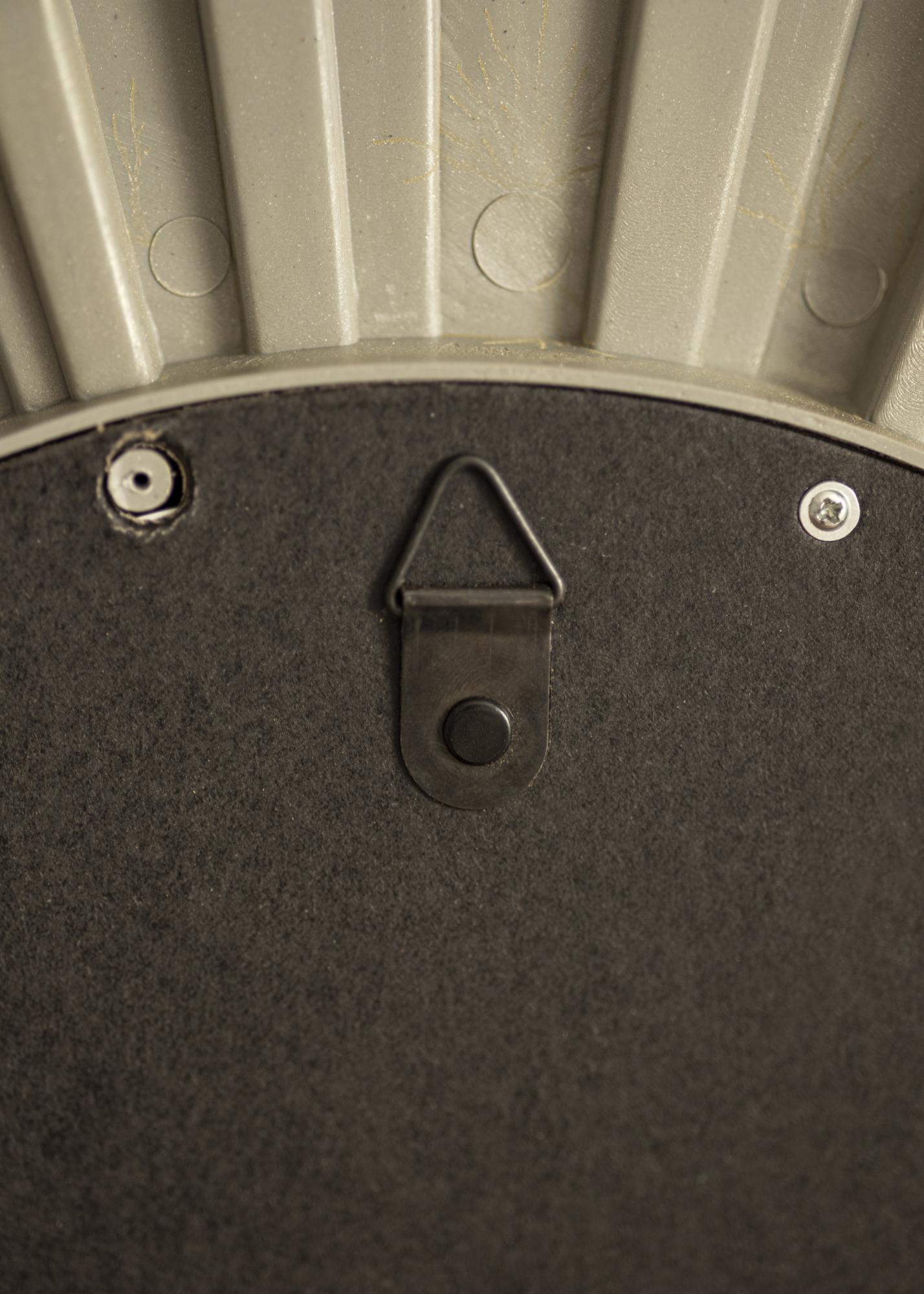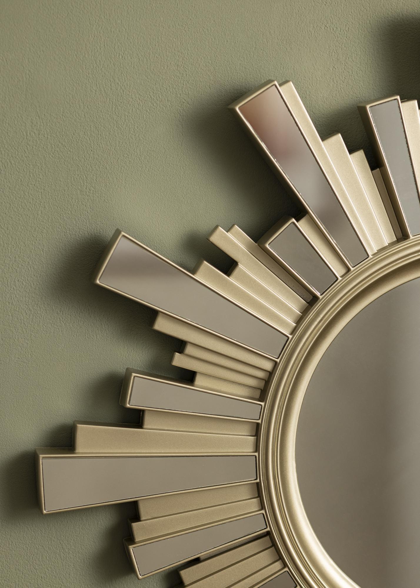 Ovo okruglo ogledalo ima vrlo ukrasni okvir u obliku sunca. Okvir je zlatne boje, što daje ogledalu elegantan i čist izgled.