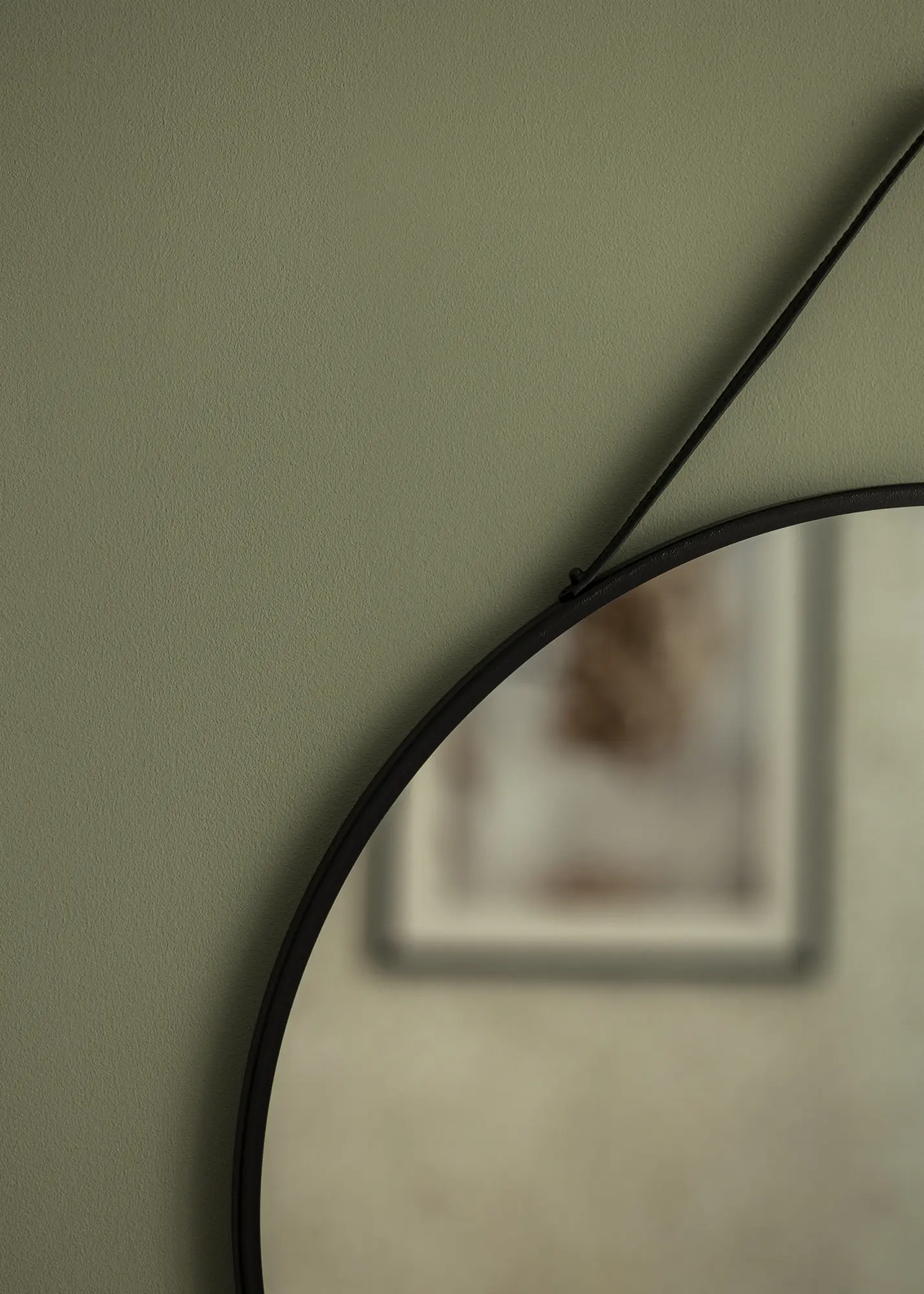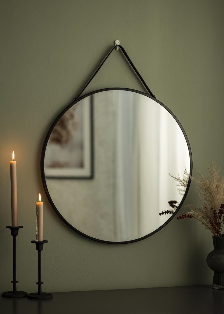 Trapani je ukusno zidno ogledalo s malim dodatkom. Ogledalo je okruglo i okruženo elegantnim okvirom od crnog metala. Ogledalo se pričvršćuje na zid u vrlo dekorativnoj traci od umjetne kože.