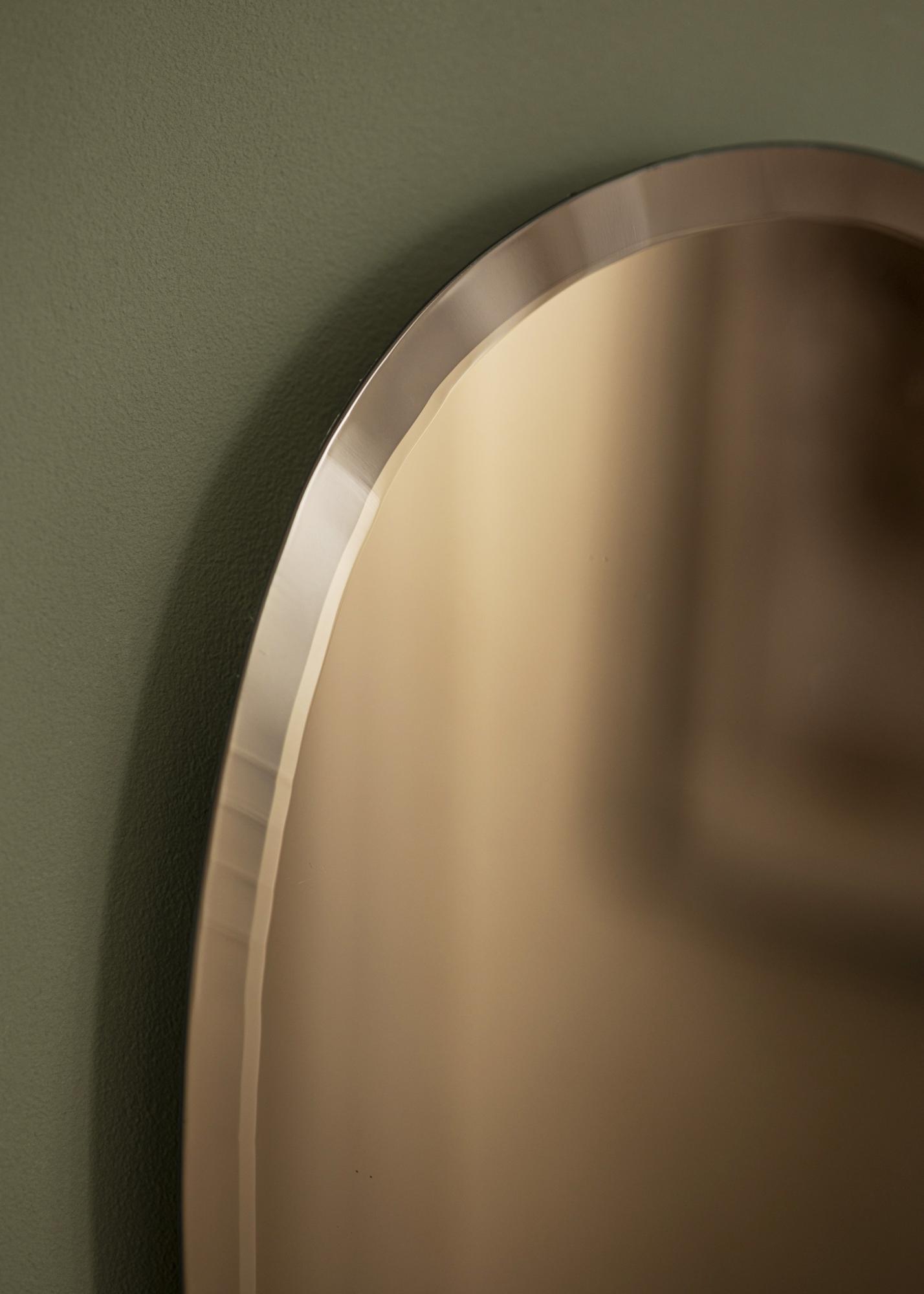Ovo ogledalo ima prepoznatljiv i tečan oblik koji odiše organskim osjećajem, čineći ga upadljivim naglaskom u prostoru. Brončano zrcalno staklo daje toplu i privlačnu svjetlost, dodajući dašak retro šarma bez preopterećivanja okolnog prostora.