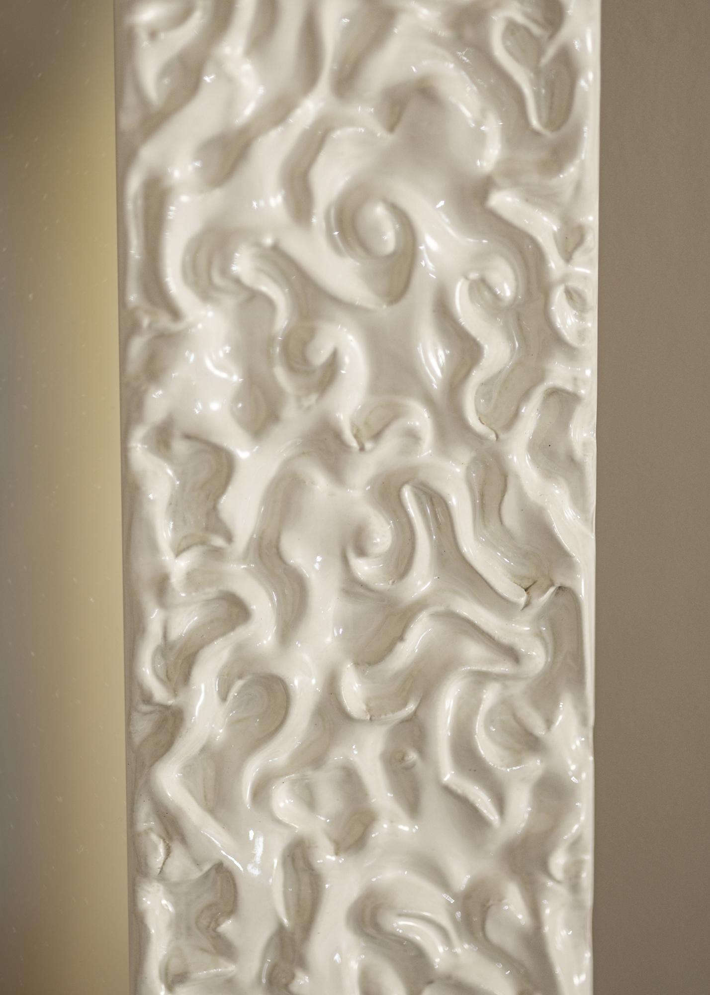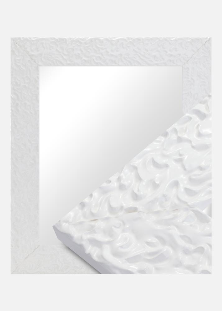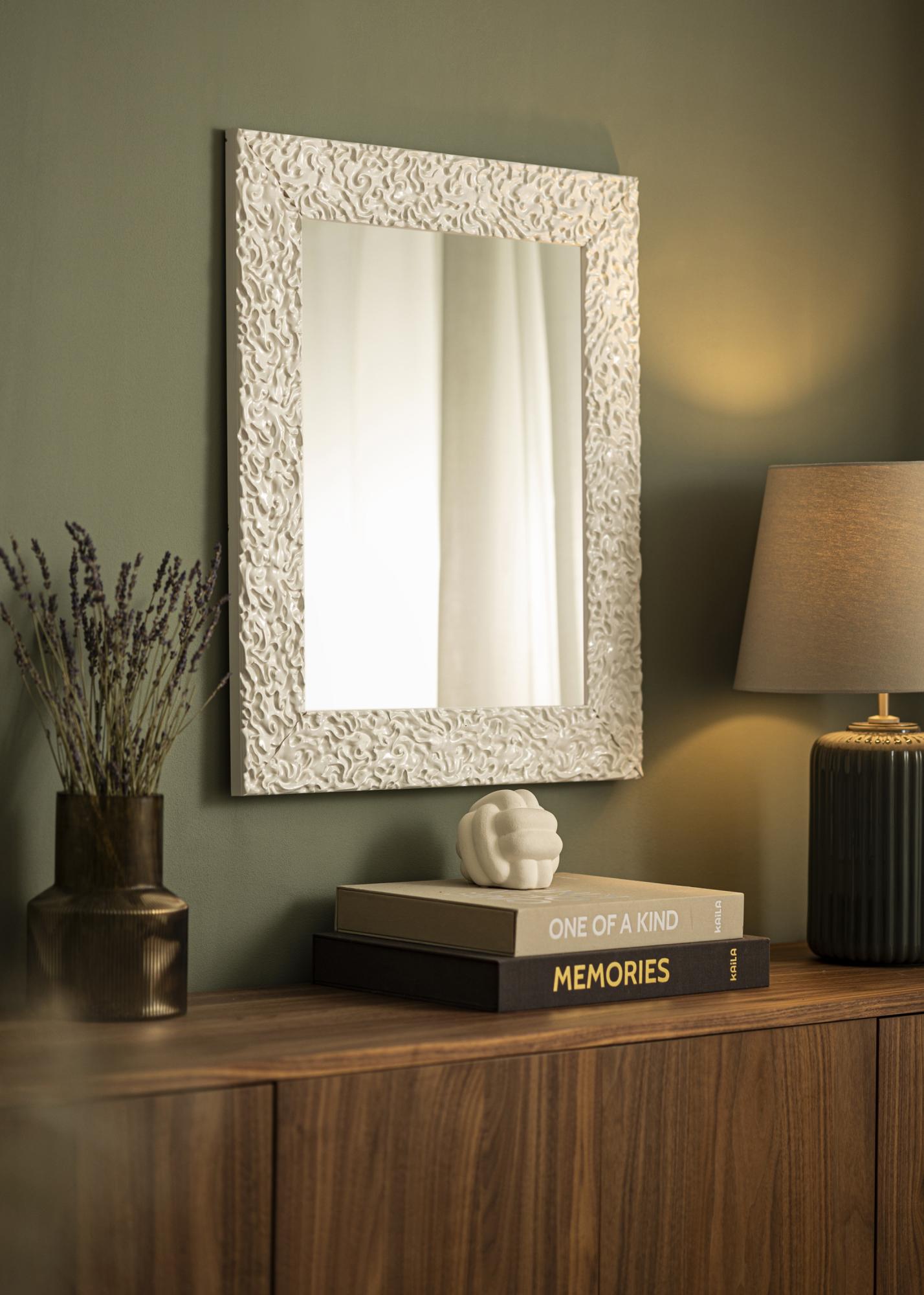 Visokosjajna bijela površina ogledala ima živahan, organski uzorak koji stvara moderan i elegantan dojam. Ovaj sjajni finiš pojačava meke, tekuće oblike i daje okviru ekskluzivan izraz. To je savršeno rješenje za vas koji tražite upečatljiv detalj koji kombinira klasičnu inspiraciju sa suvremenim dizajnom.