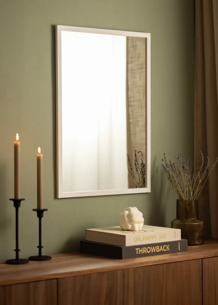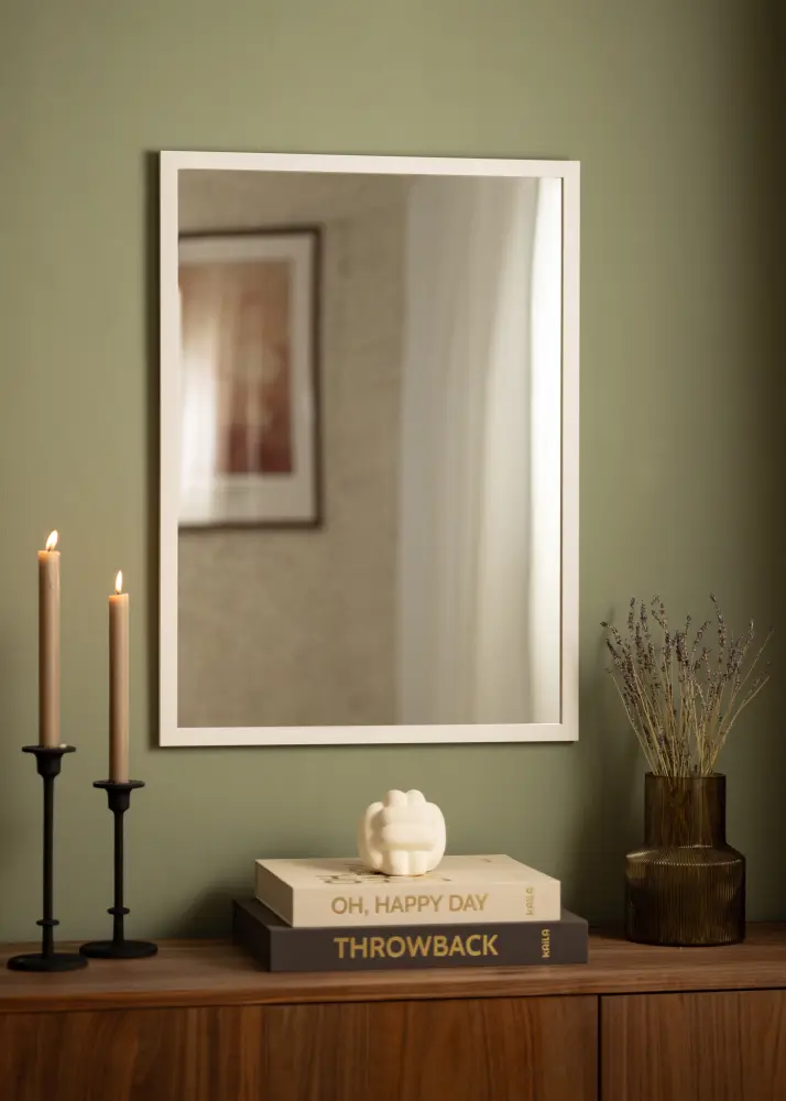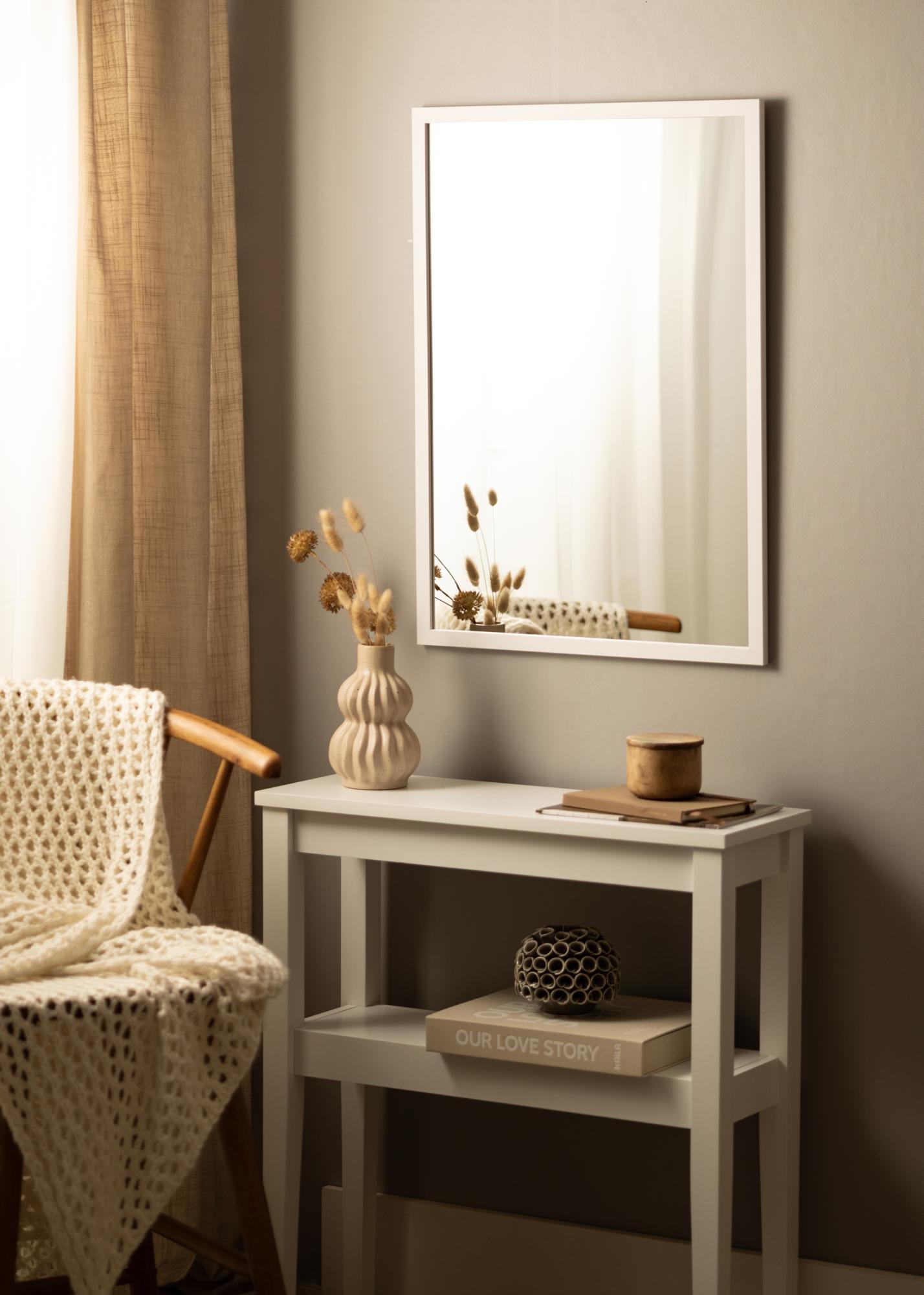 Ovo ogledalo ima klasičan izgled s okvirom širine 22 mm i dubine 15 mm od bijelo obojenog drva. Tradicionalni izraz pojačan je bezbojnim staklom ogledala.