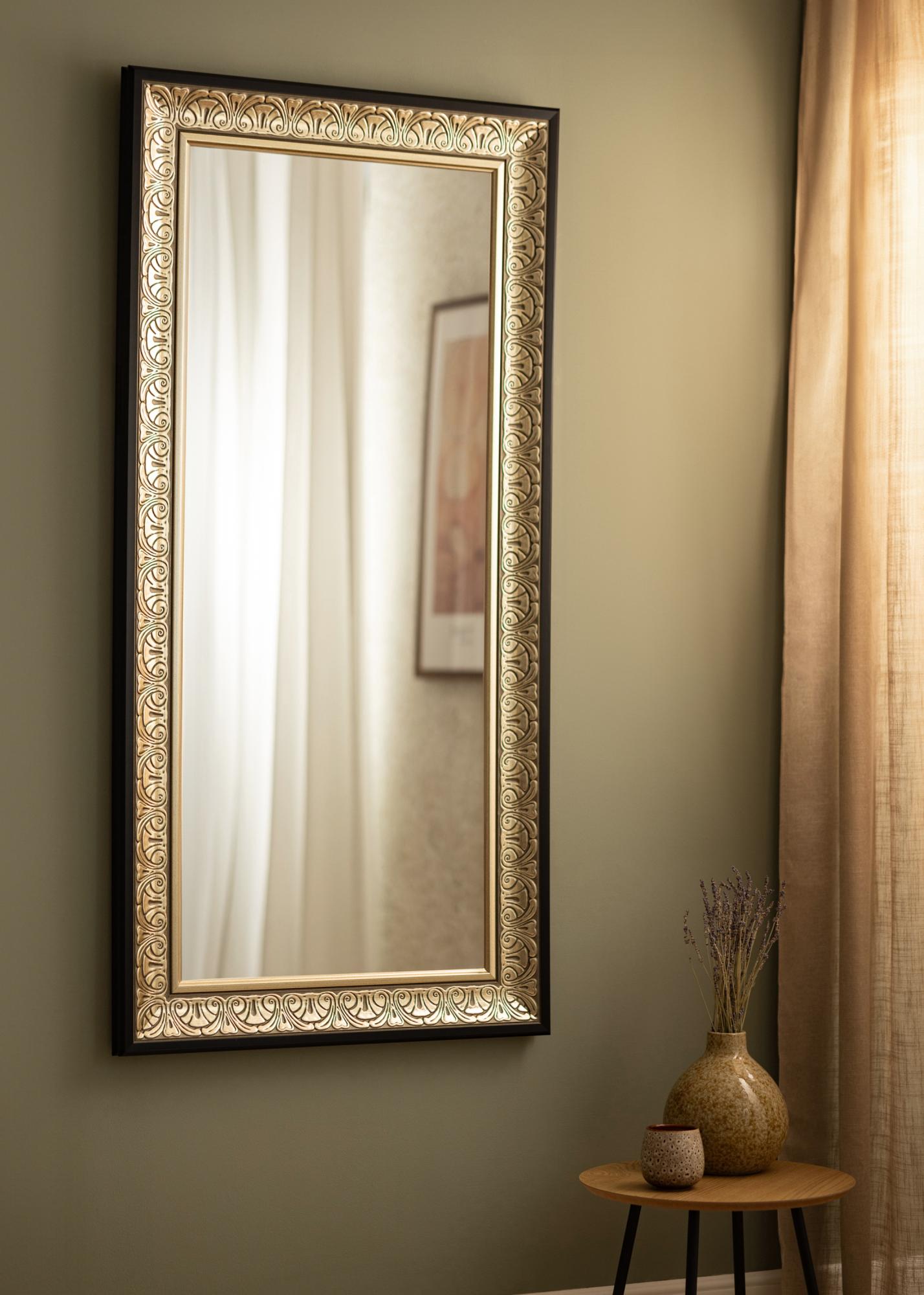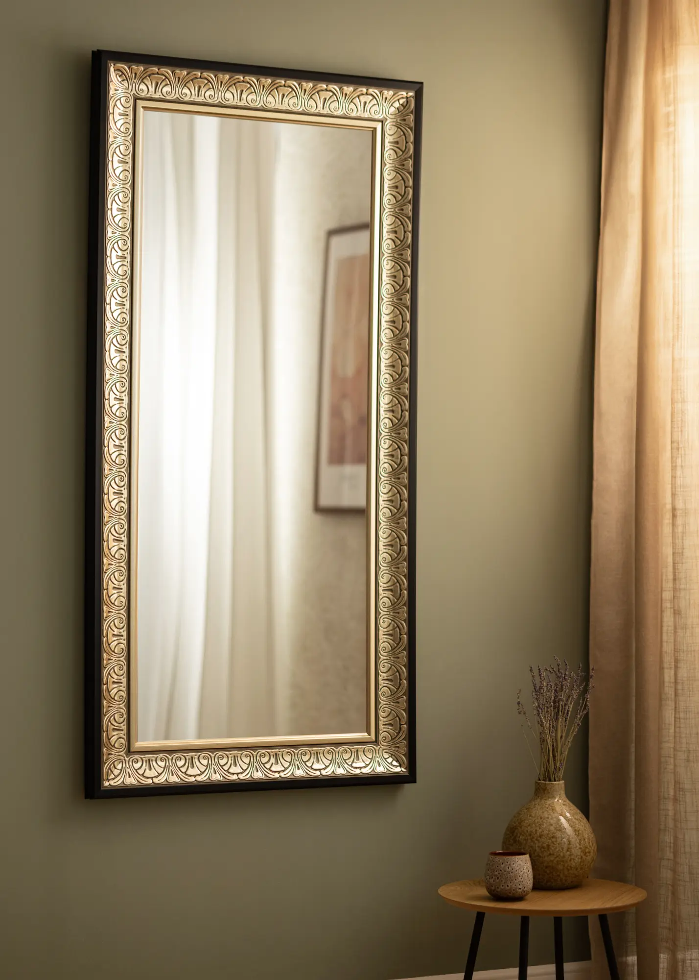 Elegantno srebrno ukrašeno ogledalo koje jednako dobro pristaje u walk-in ormaru kao i u hodniku ili kupaonici. Izgled okvira oko ogledala, s bezvremenskim uzorkom, omogućuje da ogledalo uklapa u sve vrste stilova uređenja, od romantičnih pastelnih ženskih spavaćih soba do više elegantnih i inače ogoljenih prostora gdje ogledalo stvara kontrast. Također se dobro uklapa iznad komode ili buffeta kako bi se pružio osjećaj veće prostranosti u sobi.