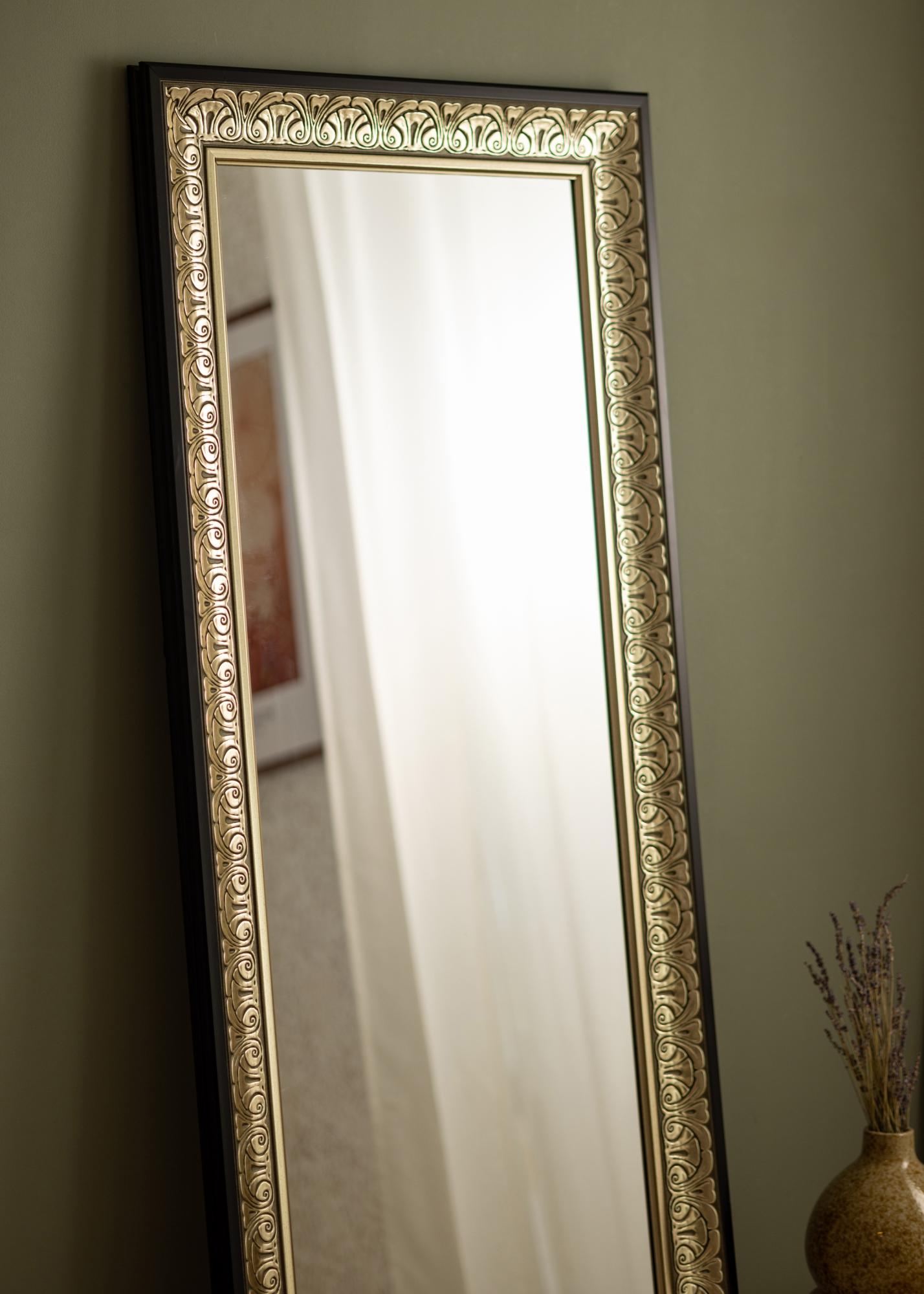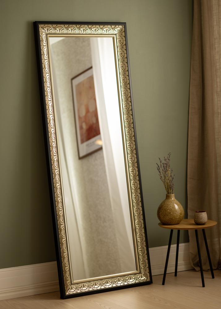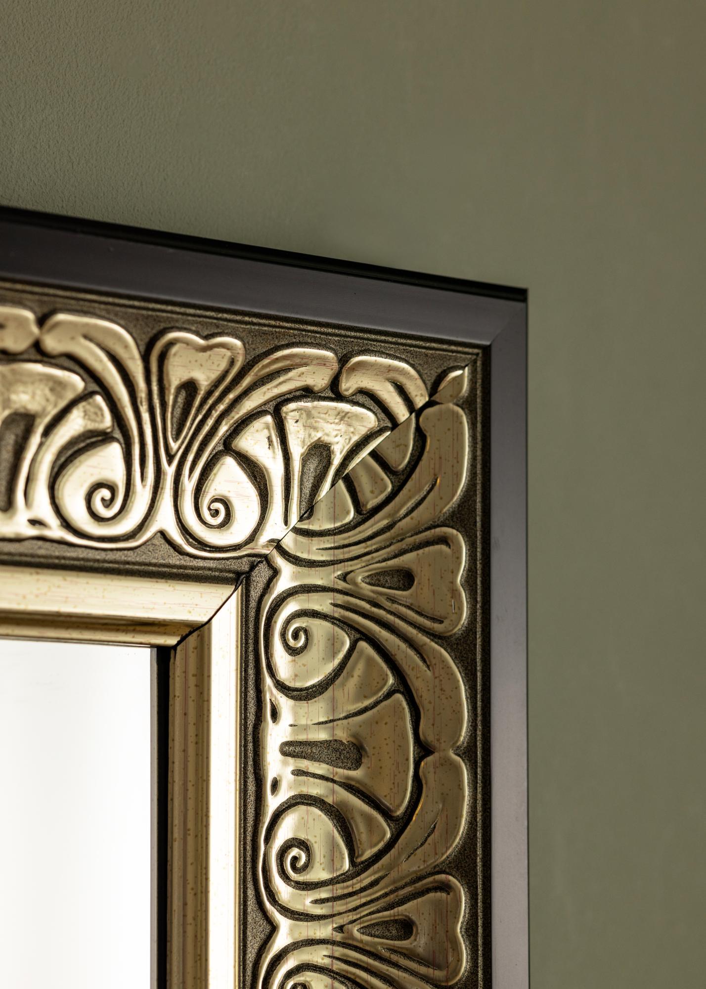 Elegantan srebrno ukrašen zrcalo koji jednako dobro odgovara u walk in ormaru kao i u hodniku ili u kupaonici. Izgled okvira oko zrcala, s bezvremenskim uzorkom, čini da zrcalo odgovara svim vrstama stilova uređenja, od romantičnih pastelnobojenih ženskih spavaćih soba do više elegantnih i inače ogoljenih okruženja gdje zrcalo stvara kontrast. Također dobro izgleda iznad komode ili kredenca kako bi se stvorio osjećaj veće prostranosti u sobi.