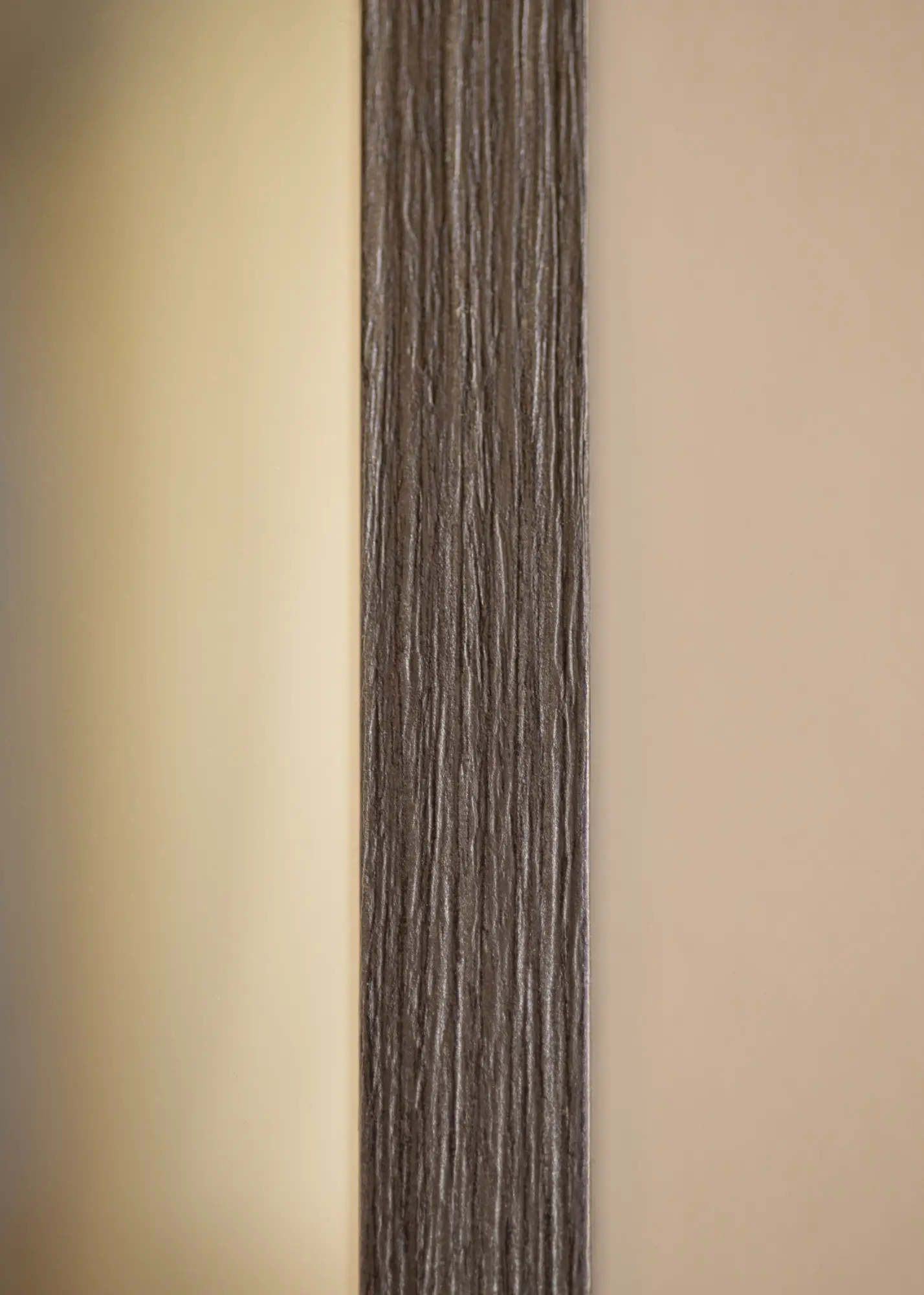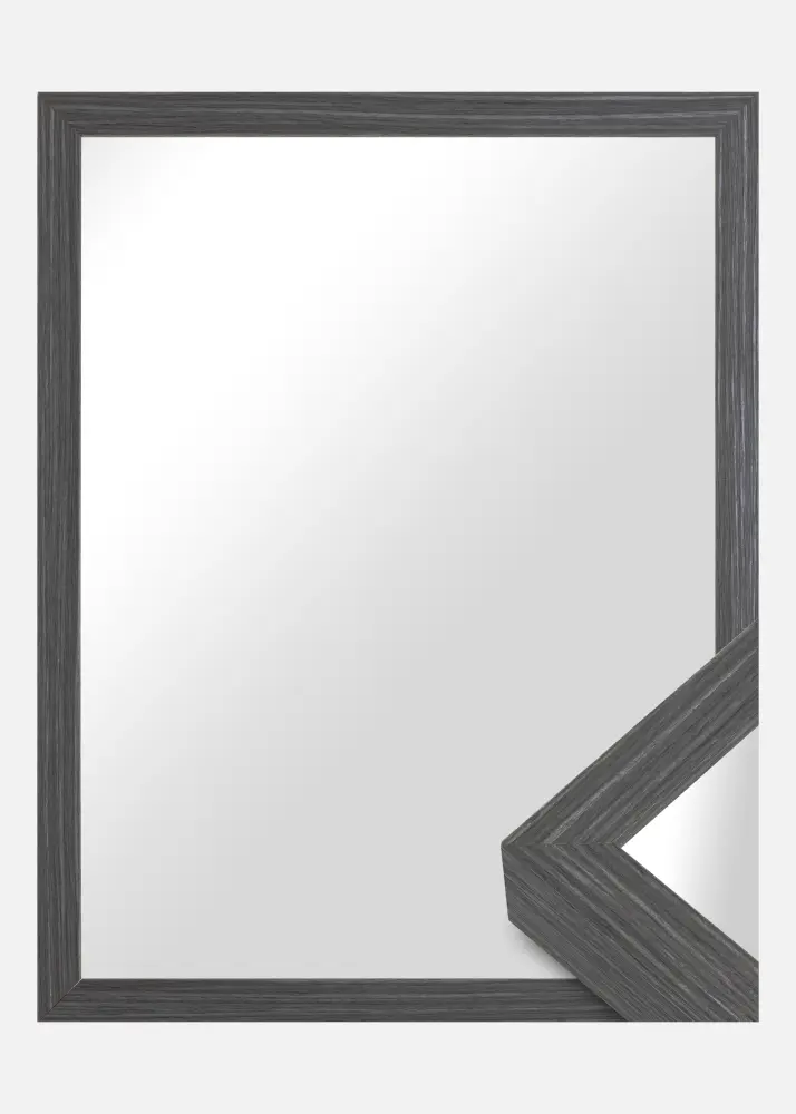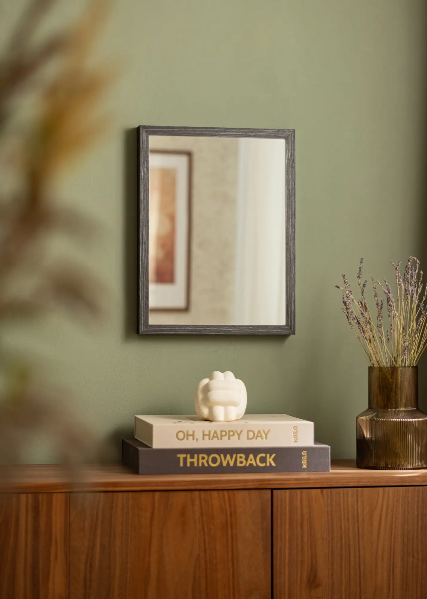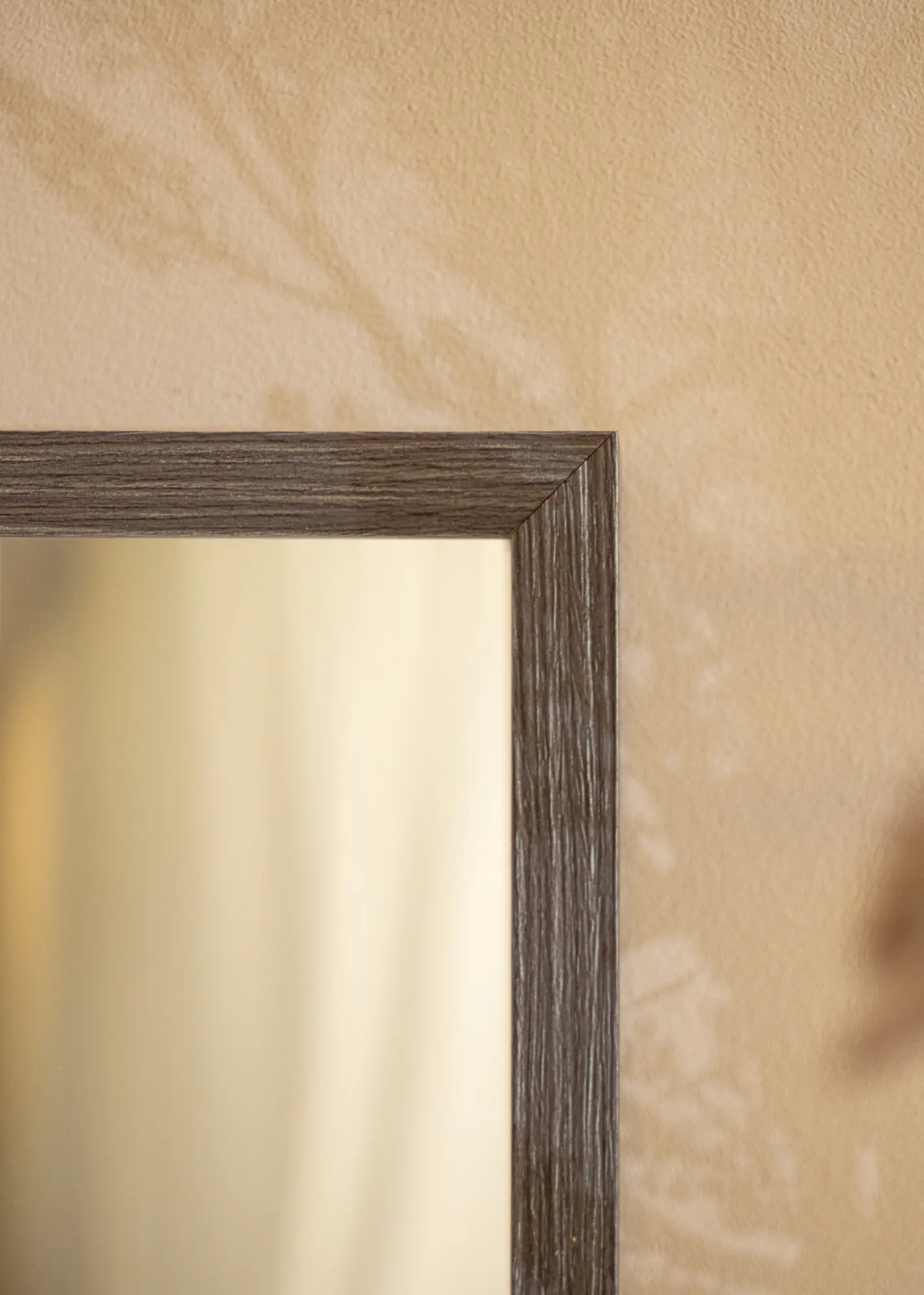 Zrcalo Wood Selection Grey I je prilagođeno zrcalo koje izrađujemo kako bi odgovaralo vašim potrebama. Svojom sivom bojom i tamno obojenom drvenom završnom obradom ovo zrcalo nudi elegantan i bezvremenski dizajn koji se uklapa u većinu stilova uređenja. Prirodna zrna u drvetu protežu se duž rubova i daju zrcalu jedinstven karakter, dok mat površina pojačava autentičan osjećaj drva.