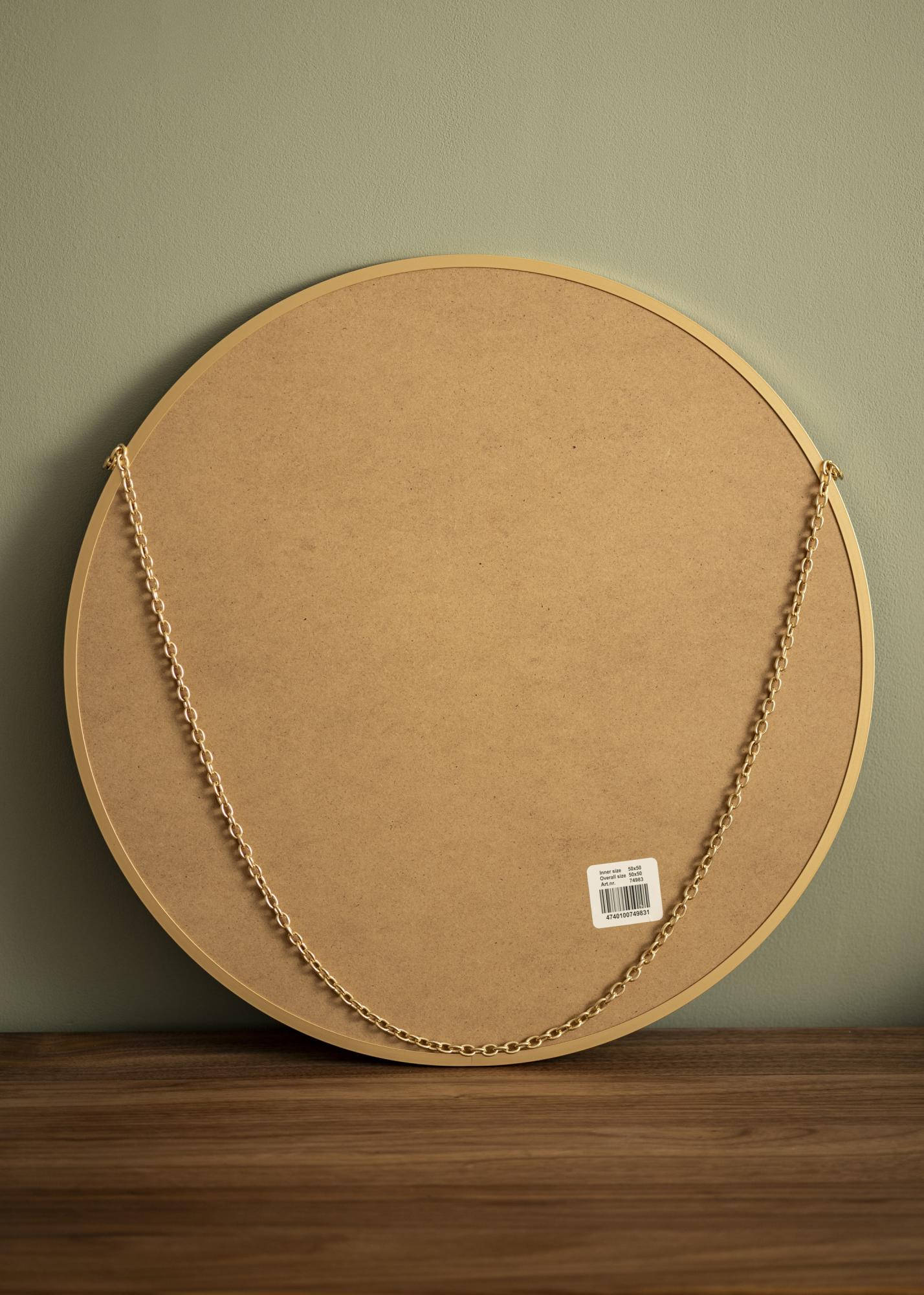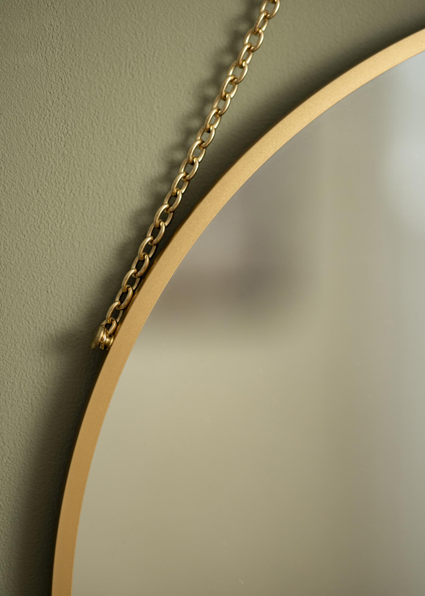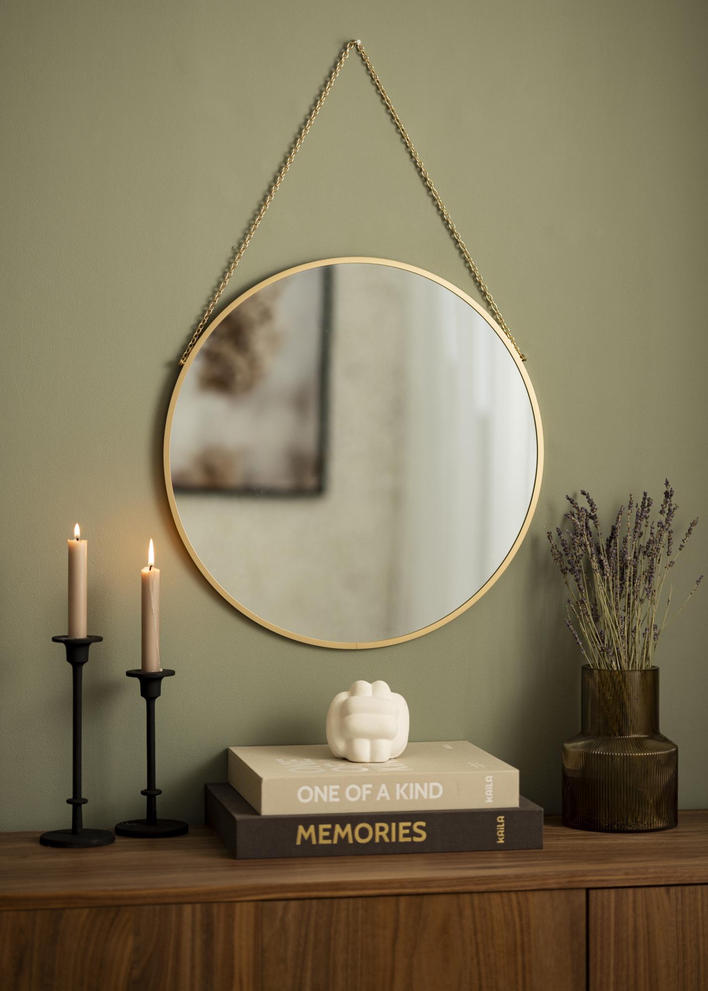 Neka ovo zidno ogledalo unese eleganciju u vaš dom! Ogledalo ima sofisticirani izgled s okruglim oblikom i tankim okvirom od samo 8 mm dubine. Nježni okvir izrađen je od metala i ima ekskluzivnu zlatnu boju. Elegantan dojam upotpunjuje zlatni lanac koji se koristi za vješanje.