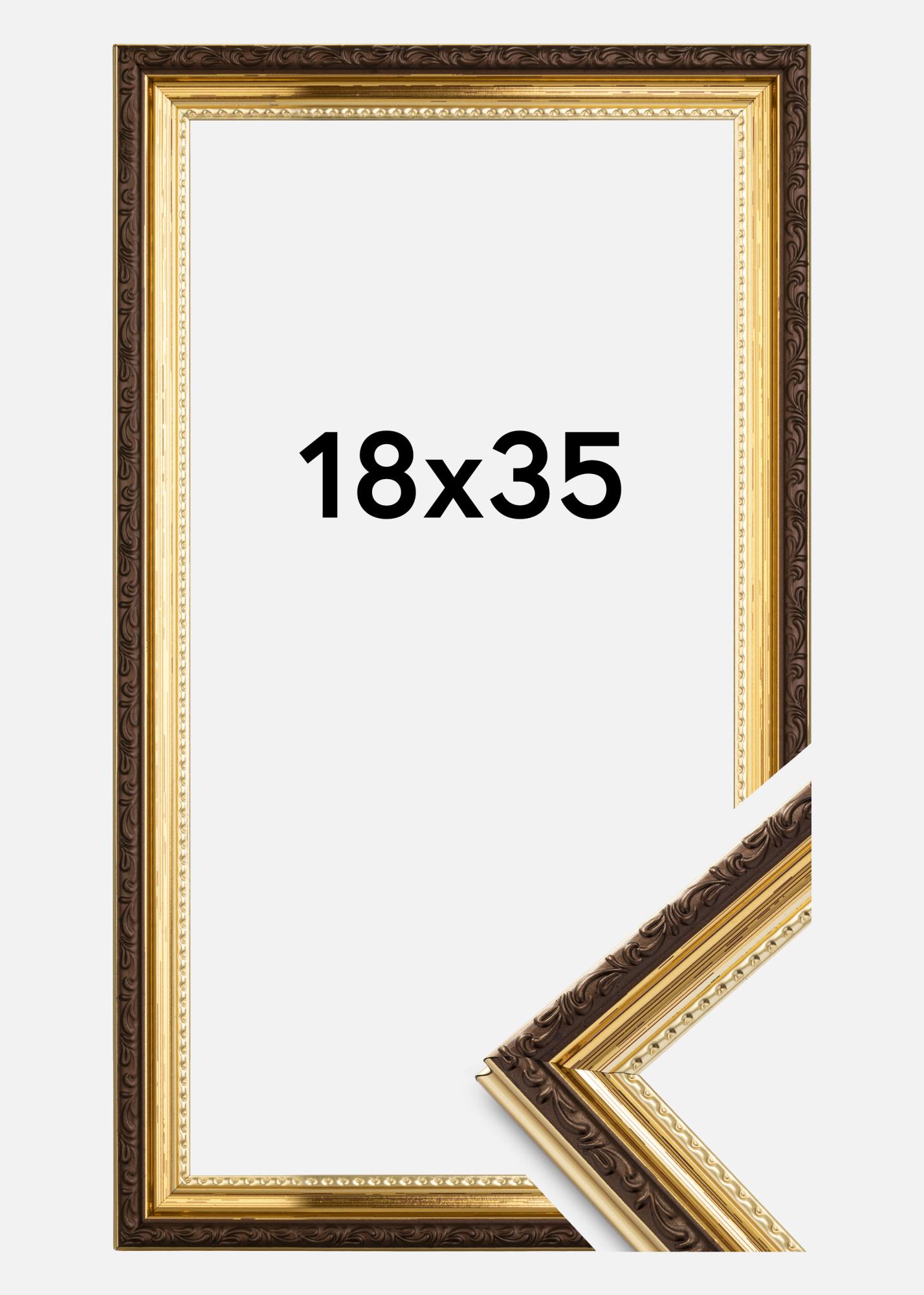 Tražite li lijepo ukrašen okvir u starinskom stilu? Abisko Akrilno staklo Zlato je čvrst zlatni okvir s nevjerojatno elegantnim ornamentima. Okvirna traka široka 25 mm ima sjajnu zlatnu boju s ukrašenim smeđim rubom u sredini. Čak je i zlatni dio ukrašen, s valovitim uzorkom najbližim staklu.