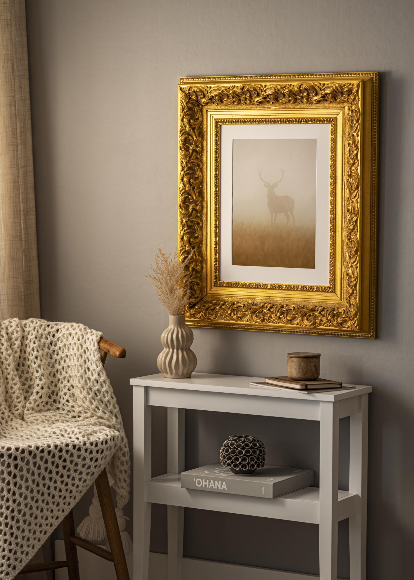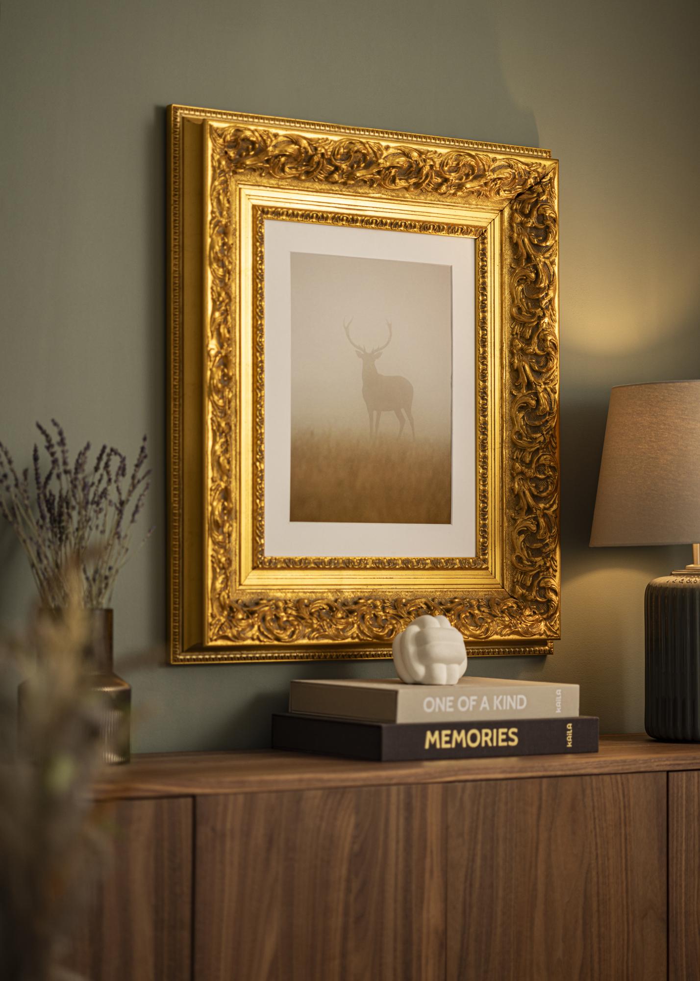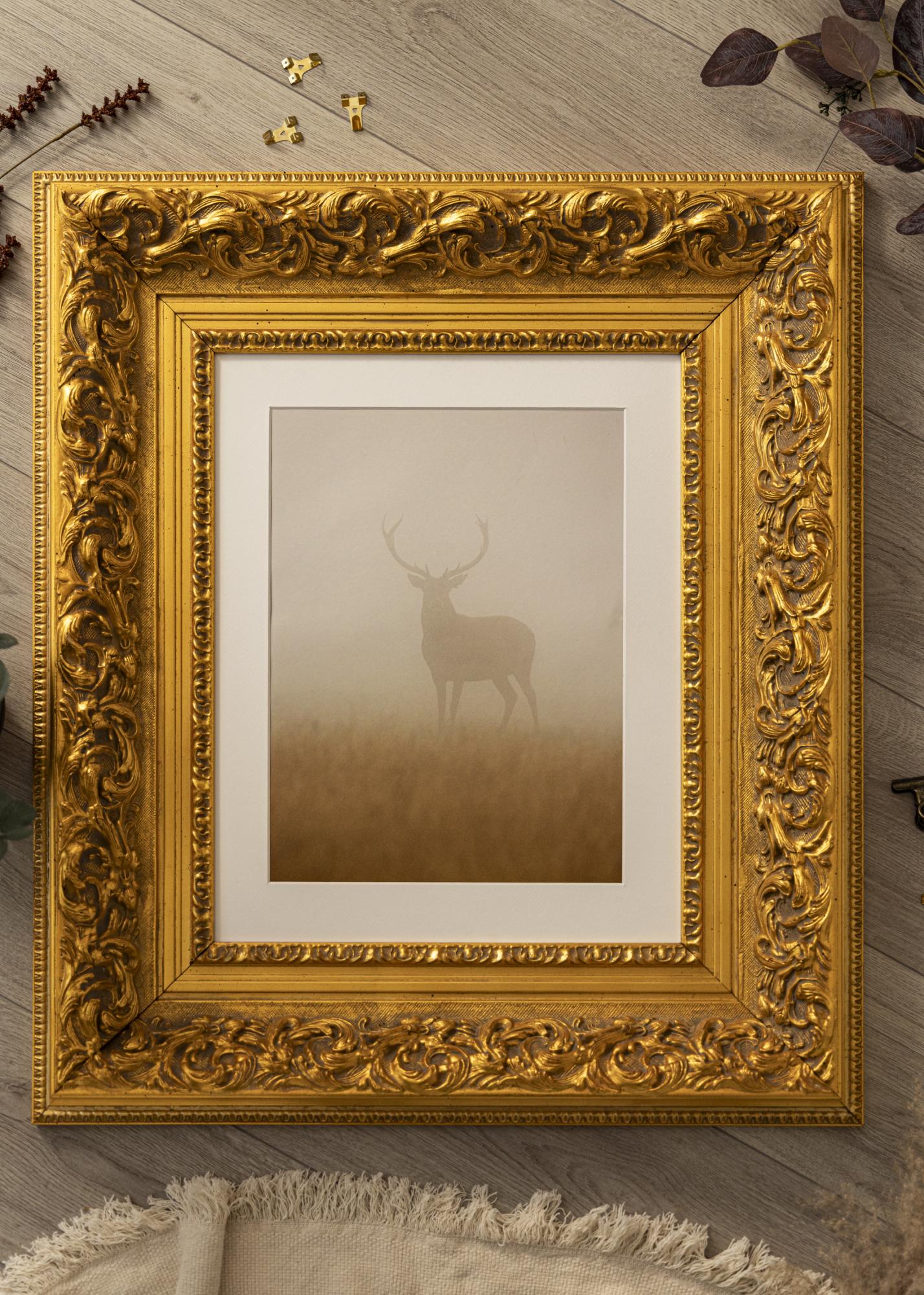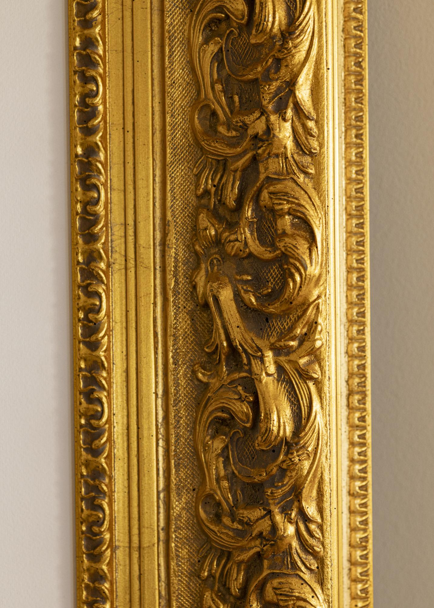 Naš okvir Birmingham Zlatna je okvir za slike po mjeri koji se izrađuje u našoj vlastitoj radionici za okvire. Sa svojim dubokim zlatnim tonom i klasičnim baroknim dizajnom, postaje elegantan dodatak svakom prostoru. Ovaj okvir za fotografije ima okvir širine 152 mm i dubinu od 74 mm, što mu daje impresivno prisustvo na zidu.