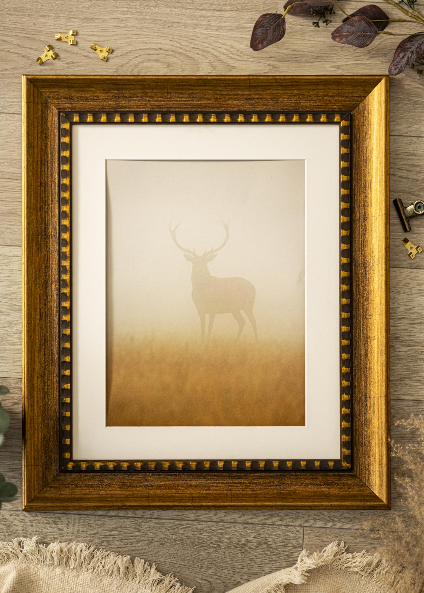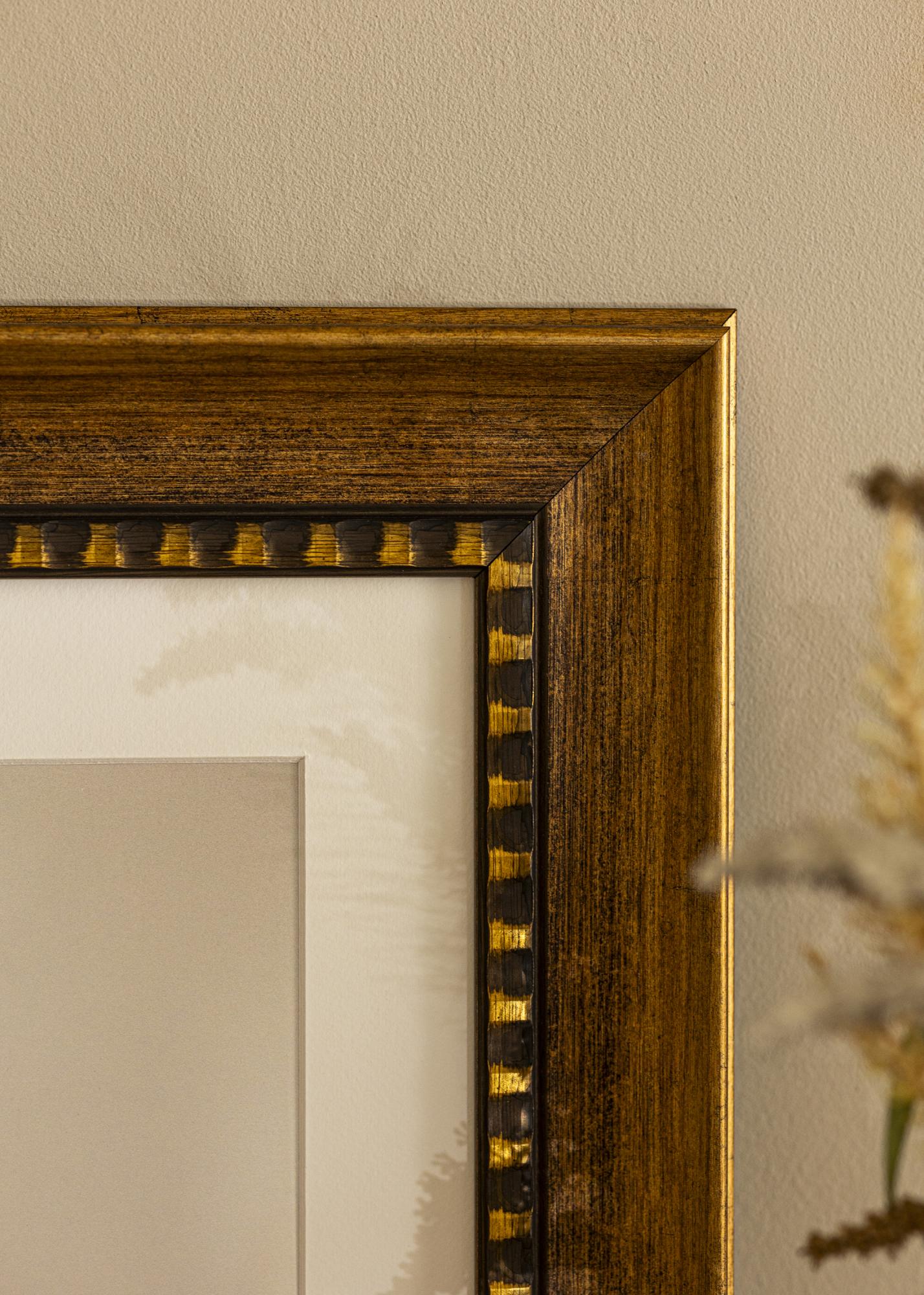 Letvica okvira širine 75 mm ima suptilan sjaj i ukrašena je s prepoznatljivim prugastim detaljem u zlatu i crnoj boji duž unutarnjeg ruba. To daje okviru jedinstven karakter i čini ga savršenim za isticanje klasičnih i tradicionalnih umjetničkih djela. Drvena struktura je vidljiva i doprinosi rustikalnom osjećaju, dok mekani zlatni rub dodaje dašak elegancije.