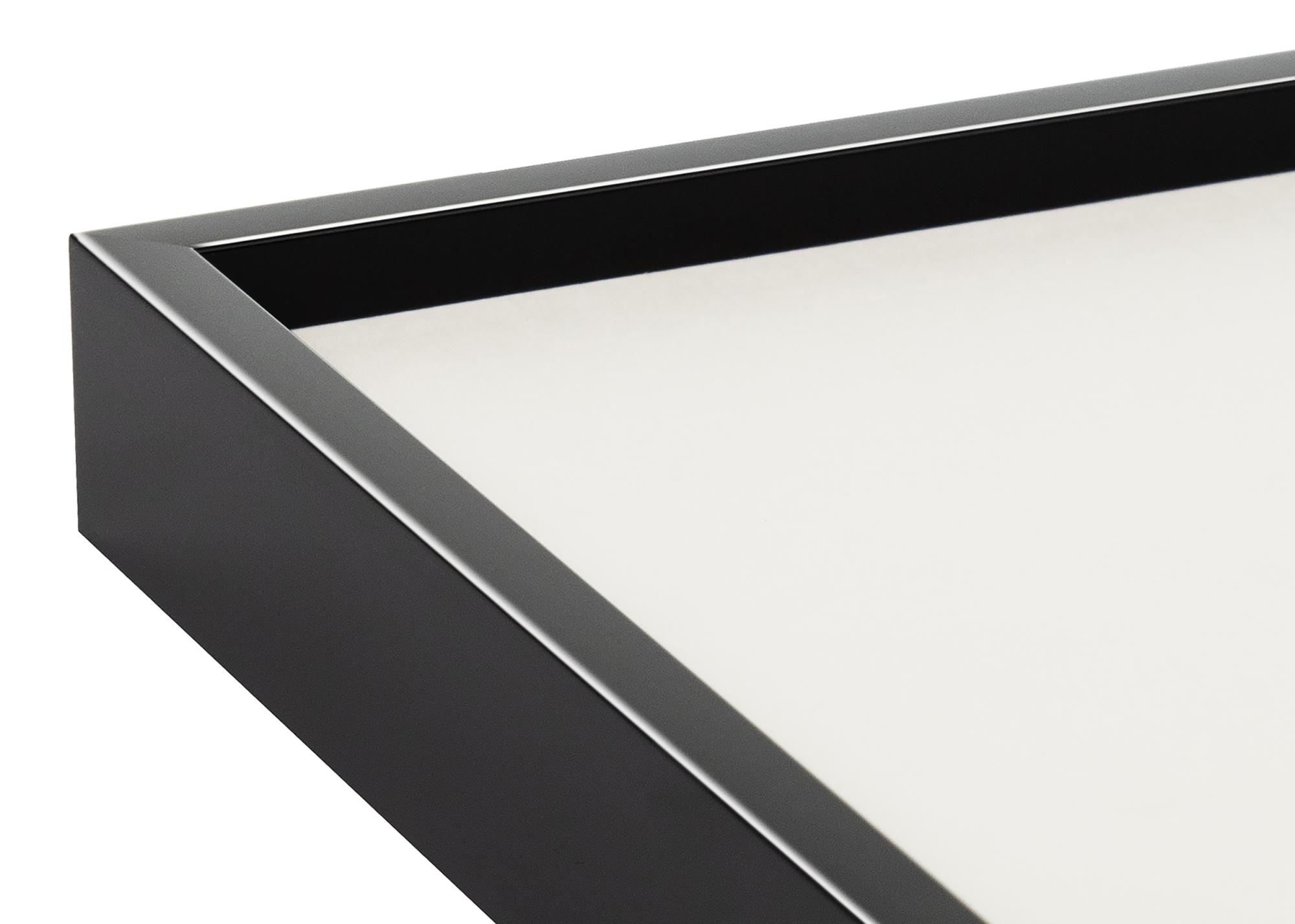 Elegantan premium okvir s visokim sjajem i tankim crnim okvirom koji se savršeno uklapa u moderan i elegantan interijer. Površina okvira i minimalistički osjećaj u dizajnu čine ga idealnim za korištenje uz grafičke postere i crno-bijele fotografije. Okvir za slike izrađen je od aluminija i dostupan je u mnogim različitim veličinama, što ga čini dobrim izborom kada želite stvoriti zid sa slikama u različitim formatima koje povezuje odabir okvira.