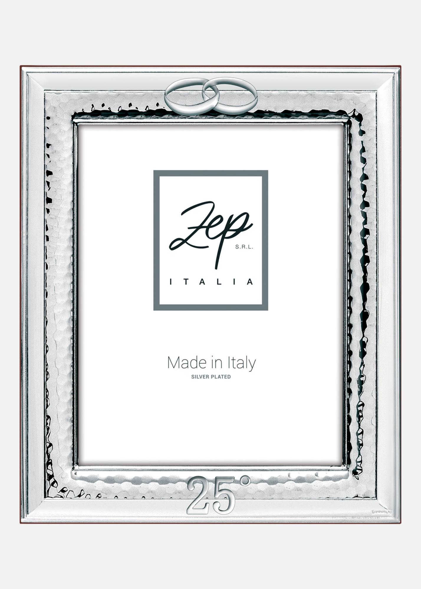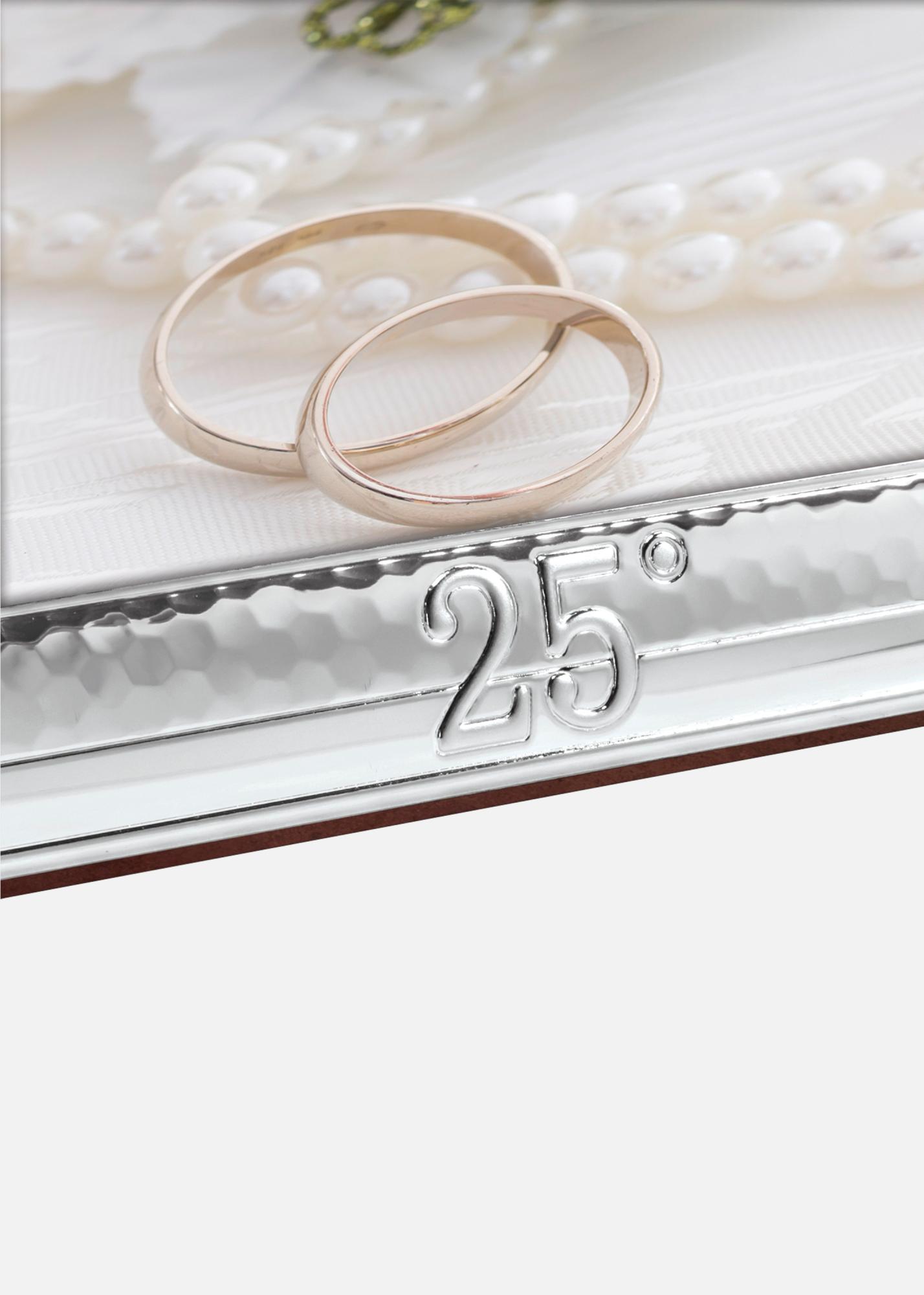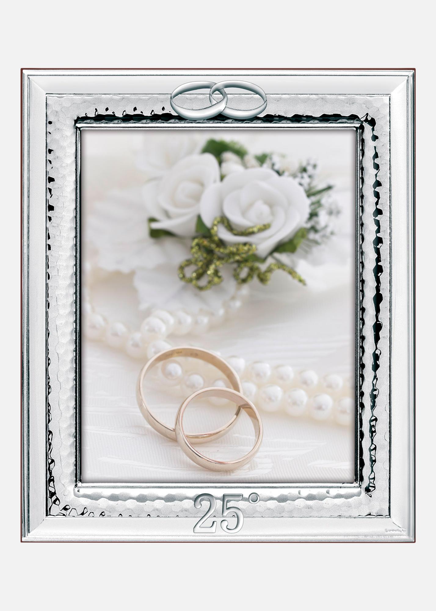 Elegantni okvir za fotografije s temom vjenčanja, posrebreni okvir. Povezani prsteni na vrhu i broj "25°" na dnu čine ga savršenim za proslavu 25. obljetnice, na primjer srebrnog vjenčanja.
