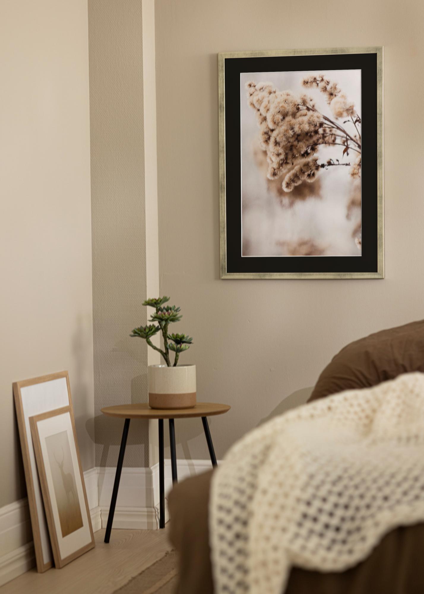 Crni passepartout nadopunjuje srebrnu boju okvira i naglašava motiv na sofisticiran način. Okvir je također opremljen praktičnim metalnim vješalicama za jednostavno vješanje.
