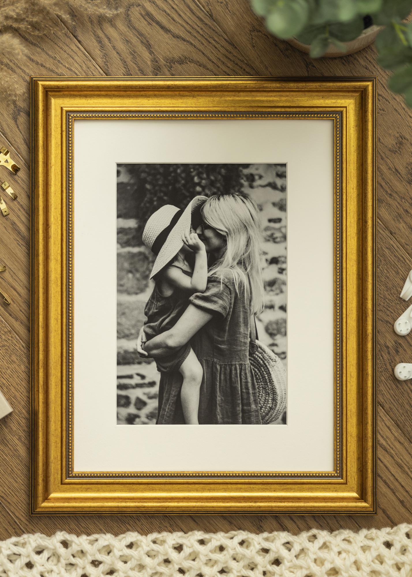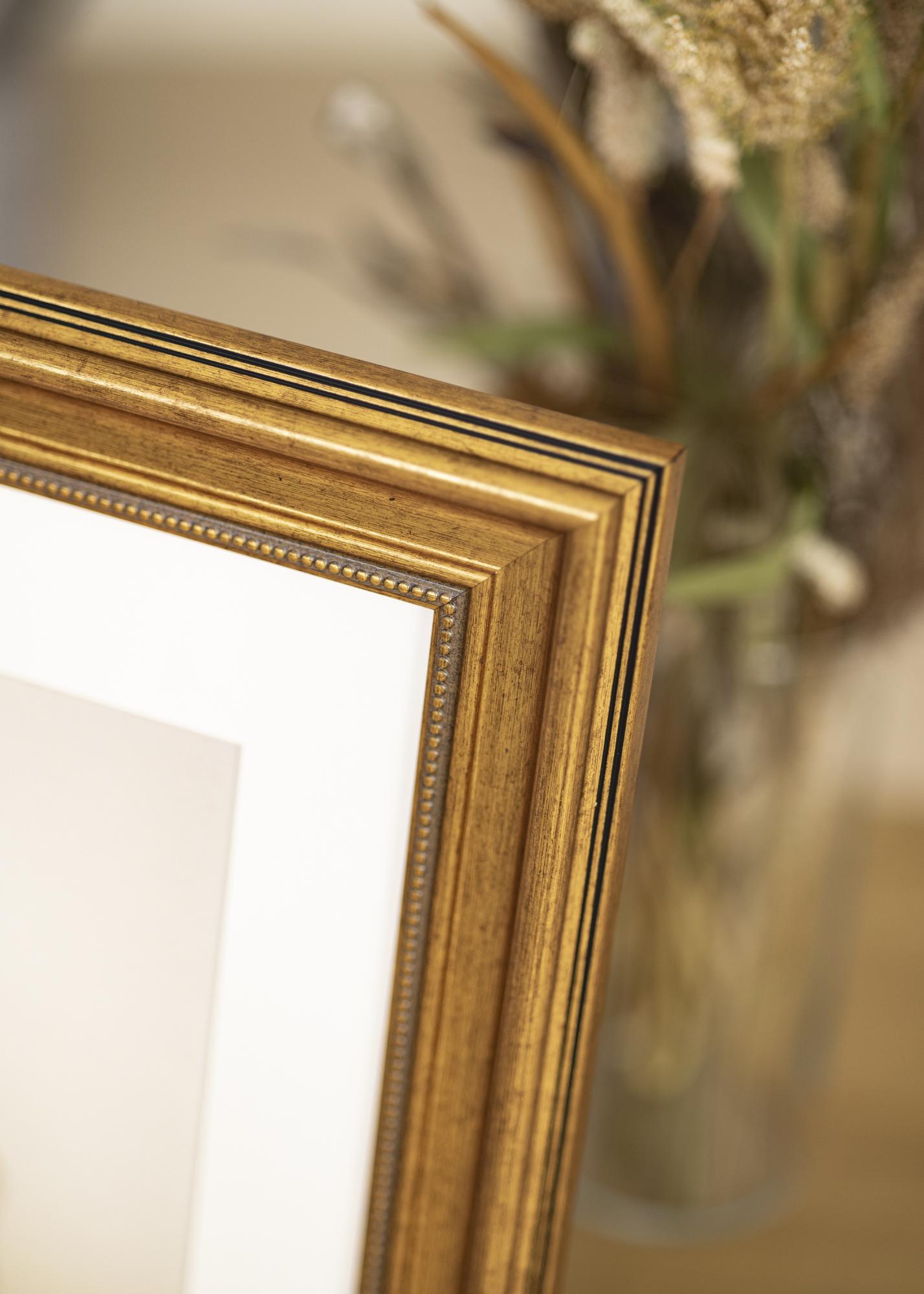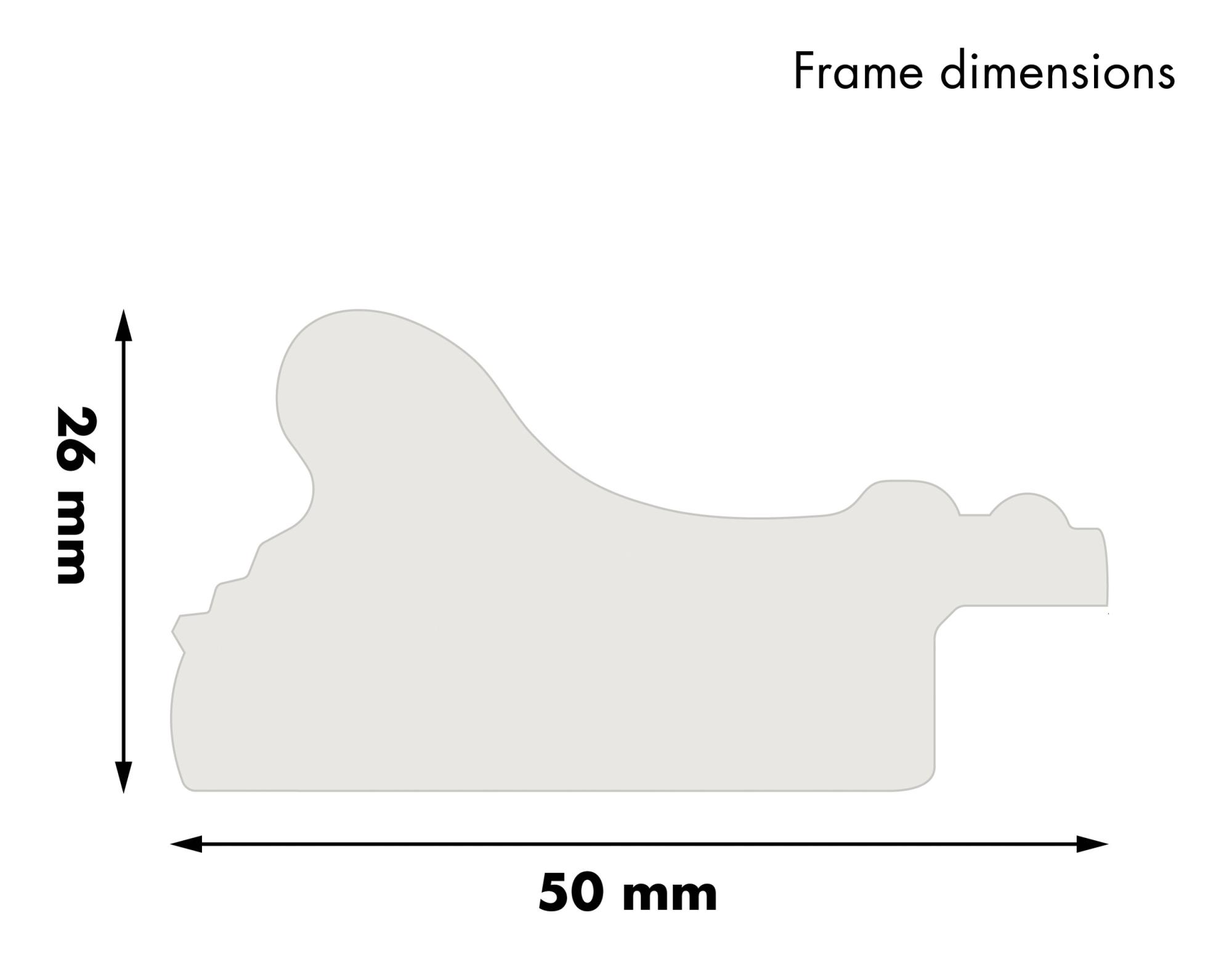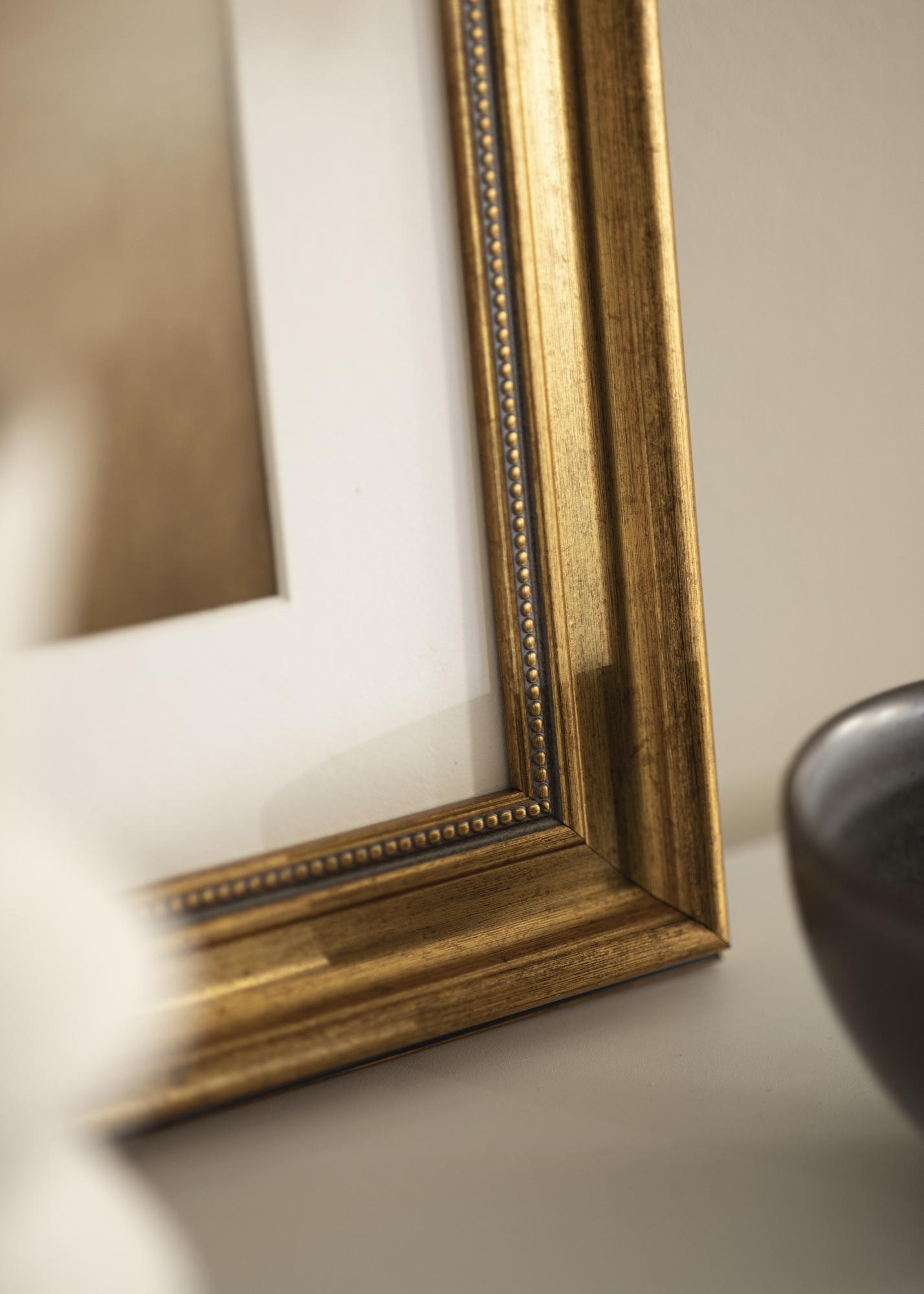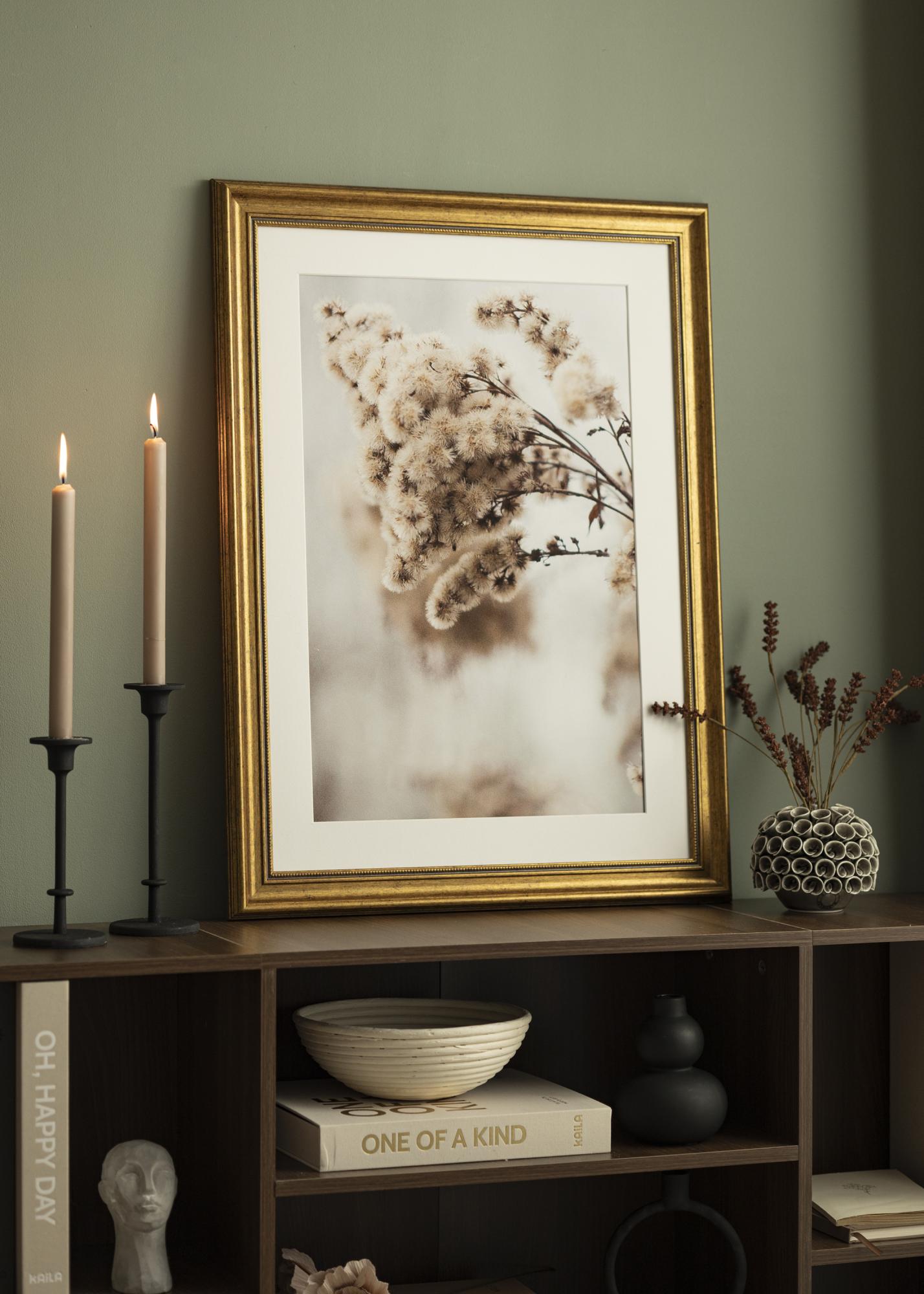 Rokoko je okvir u zlatnoj boji koji donosi prekrasan vintage osjećaj u sve vaše omiljene motive. Okvir ima 50 mm široku letvicu u nijansi sjajnog antičkog zlata, kao i lijepo izlizanu površinu koja pojačava klasičan izgled okvira. Okvir odgovara osobnim fotografijama kao i apstraktnim posterima – i bez obzira na motiv koji odaberete, možete ga jednostavno postaviti. Samo otpustite stražnju stranu okvira, koju drže mali savitljivi čavlići, i zatim stavite svoju zidnu umjetninu uz staklo okvira.