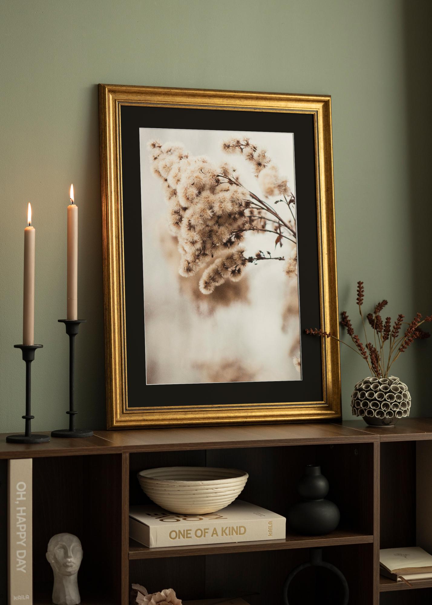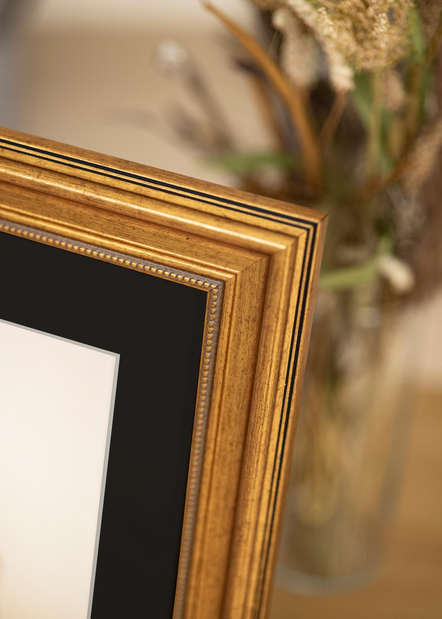 Stvorite impozantnu kućnu galeriju s ovim zlatnim okvirom i crnim passepartoutom - kombinacijom koja obećava da će vašem odabranom motivu dati pažnju koju zaslužuje.