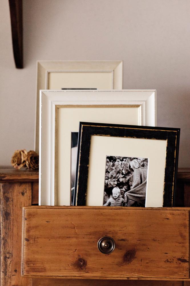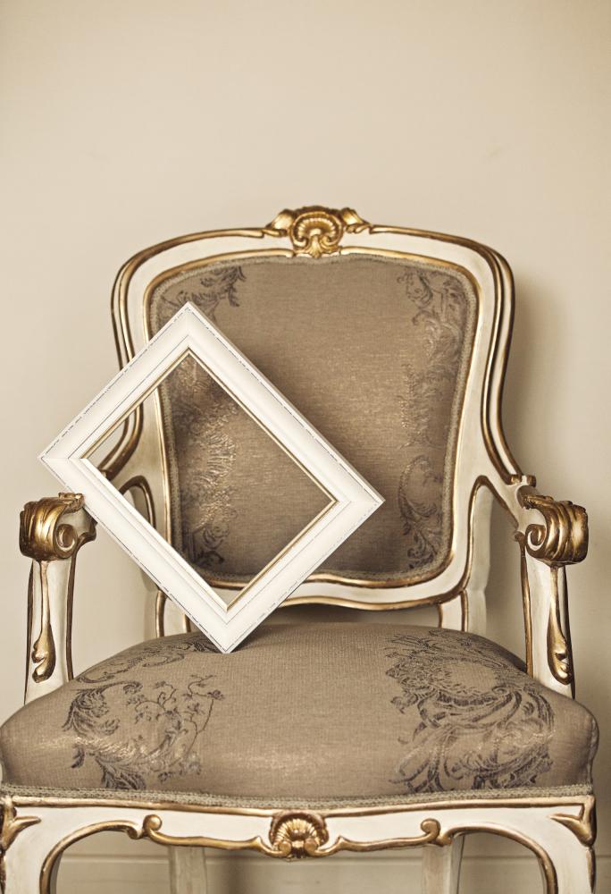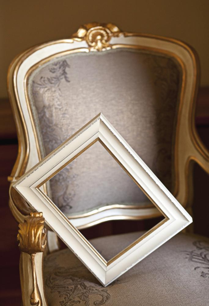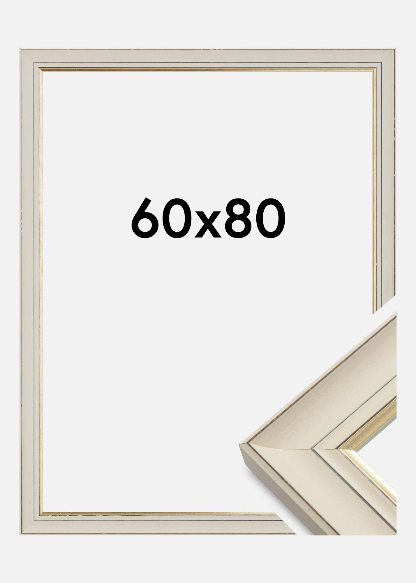 Okvir za slike klasičnog stila s uzbudljivim retro dojmom. Okvir ima potrošeni profil u bijeloj boji s lijepim zlatnim rubom najbliže slici, s neutralnim dizajnom i izborom boja koji odgovara gotovo svim okruženjima i svim vrstama motiva.