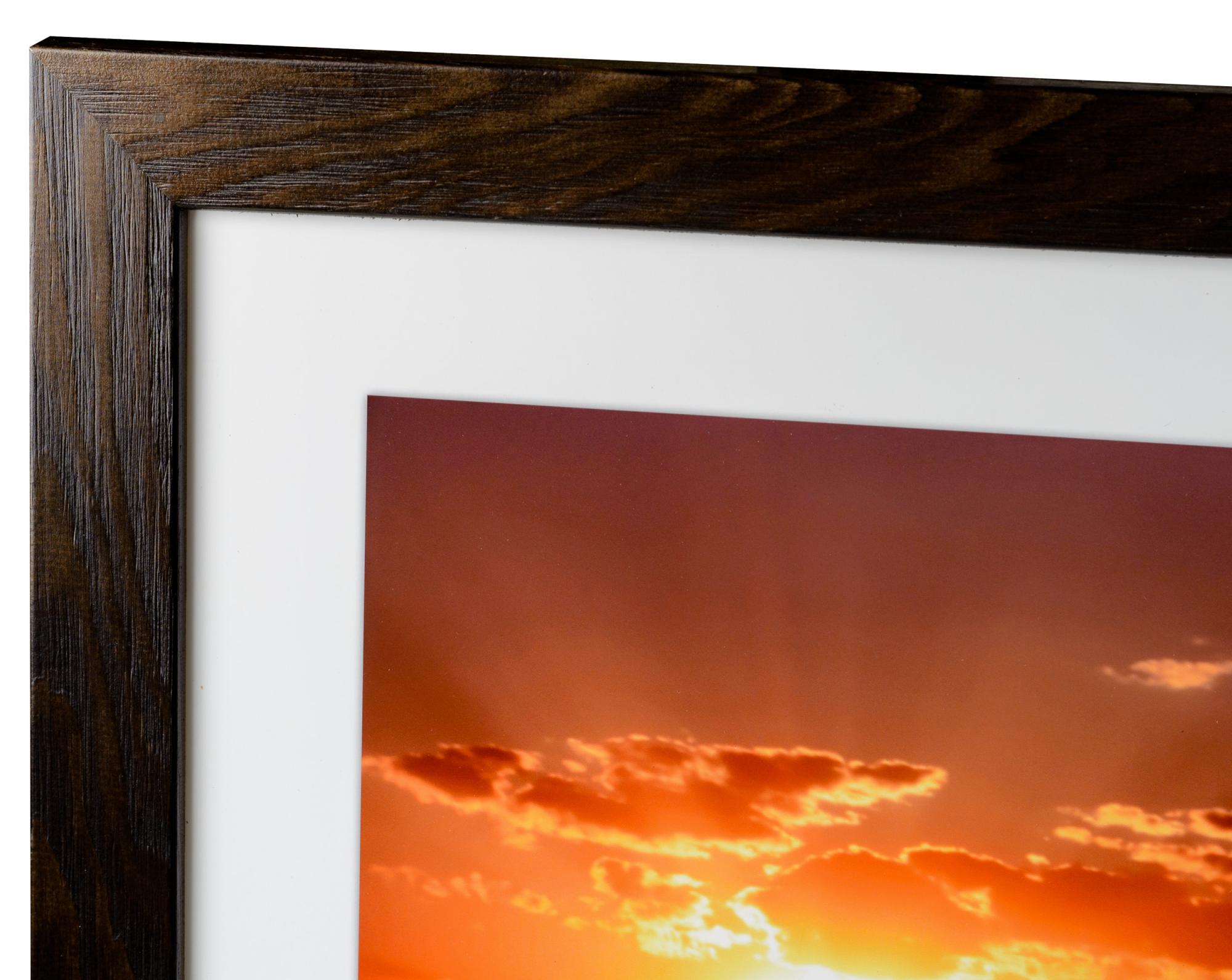 Čvrsti smeđi drveni okvir s vidljivim drvenim vlaknima širokog profila. Odgovara dobro kada tražite tamni drveni okvir s prirodnim dojmom. Savršeno za ambijentalne slike i pejzaže.