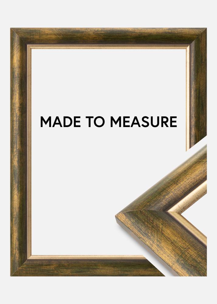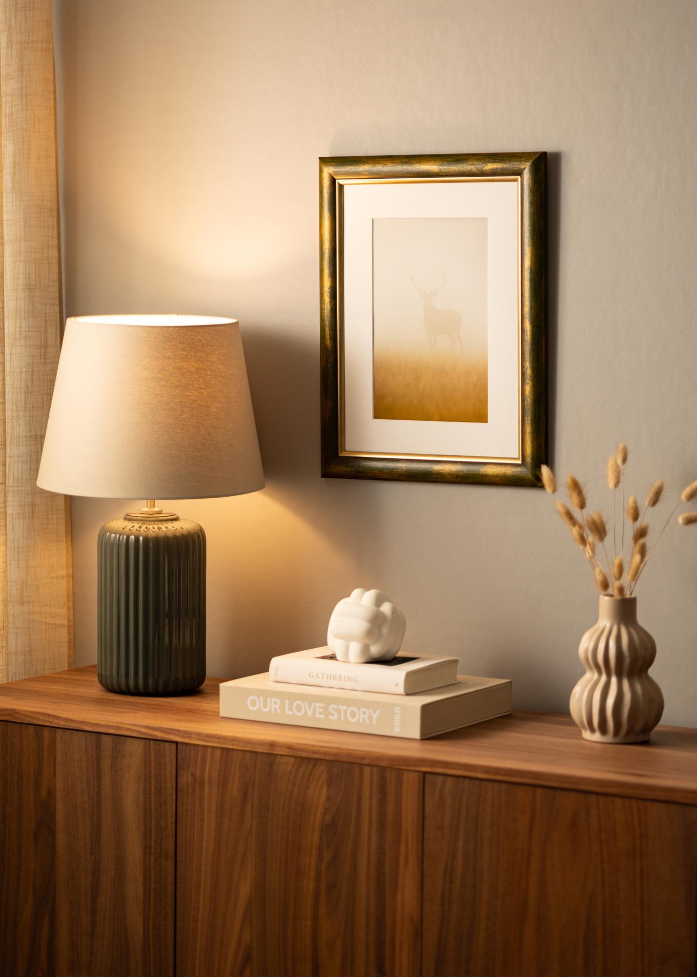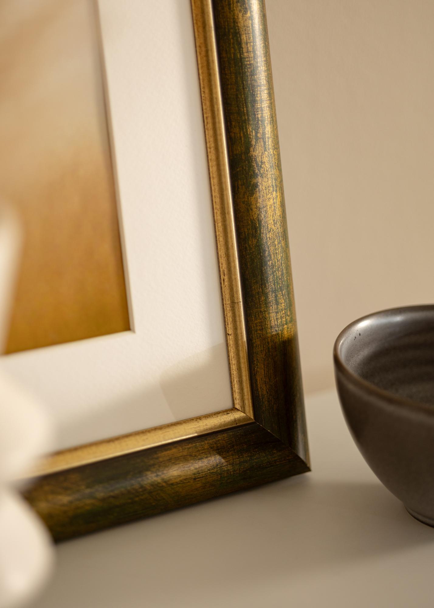 Bezvremenski drveni okvir proizveden u Finskoj s elegantnom zelenkastom drvenom površinom i zlatnim rubom najbližim motivu. Pruža harmonijski osjećaj motivu. Okvir ima širok profil od čak 41 mm i dubinu od 19 mm što daje dodatnu dubinu uokvirivanju.